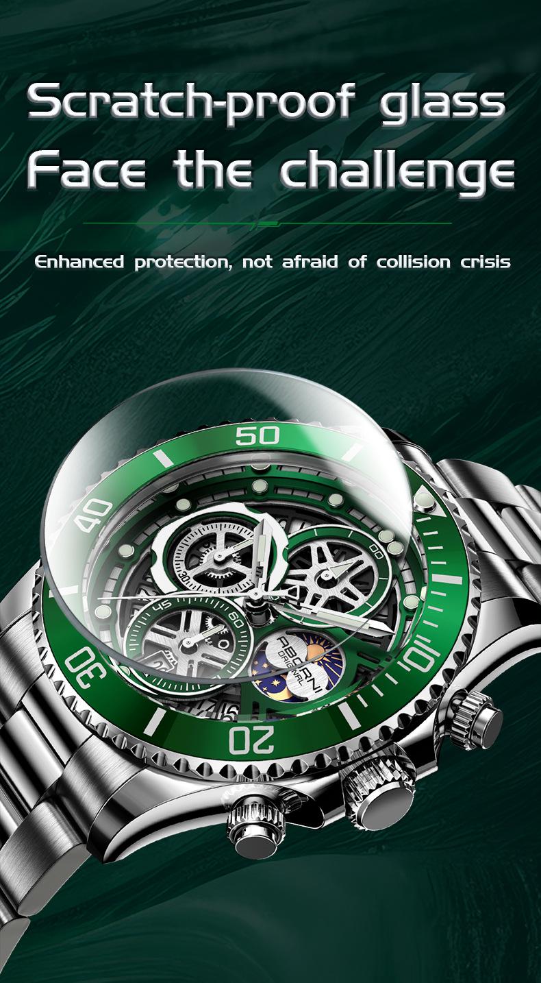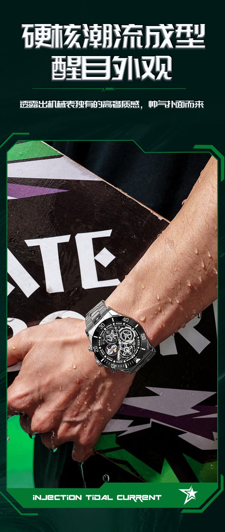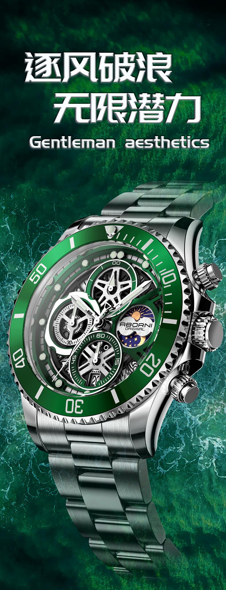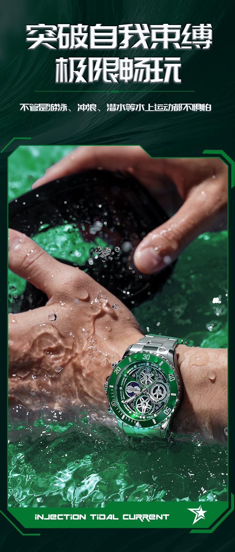 Reloj mecánico hueco de platino con diseño de fantasma de agua verde, calendario luminoso, resistente al agua, multifuncional, de cuarzo, para hombre.