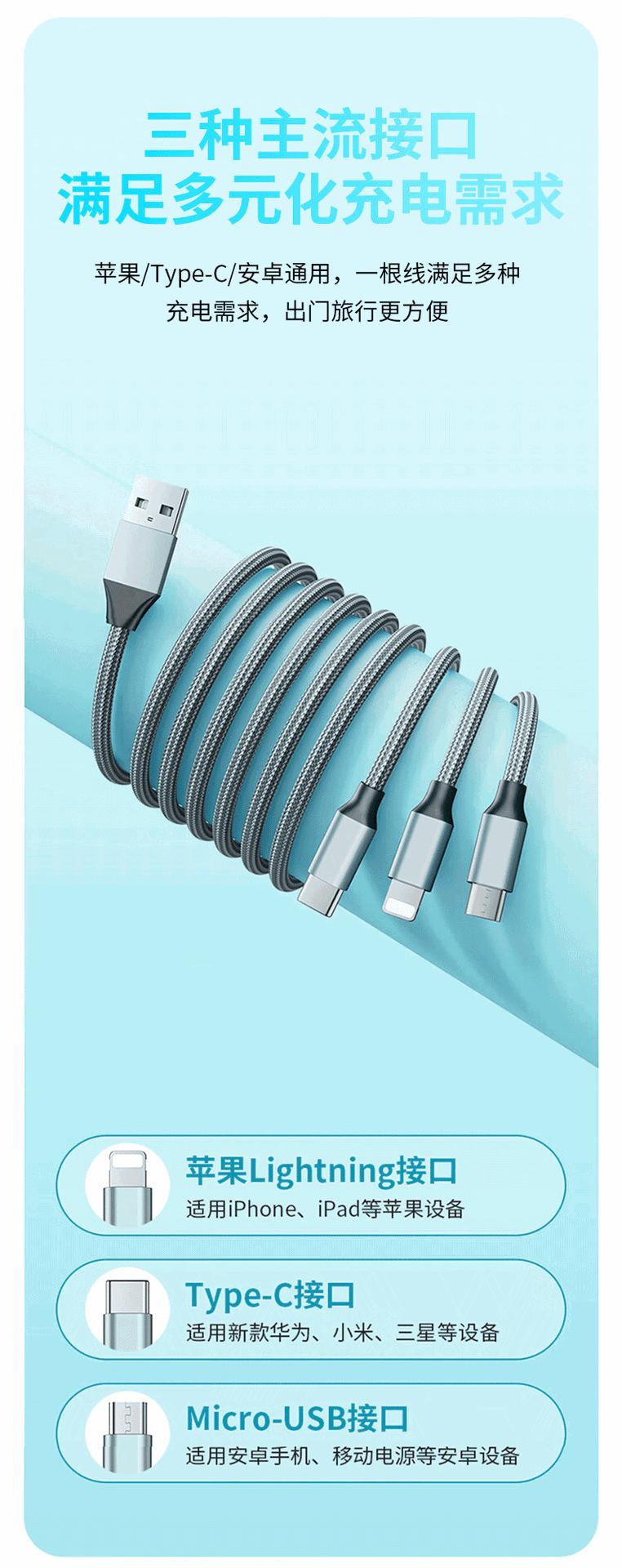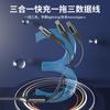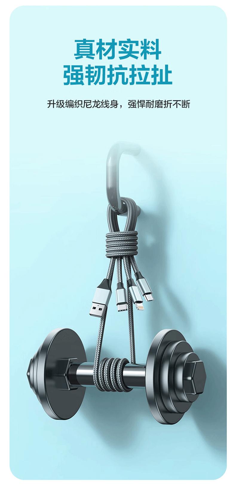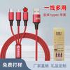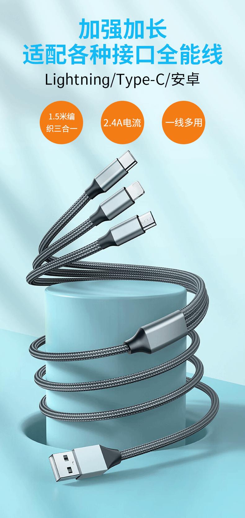 Cable de datos uno a tres de 1,5 m, cable de carga rápida tejido para Apple, Android, Huawei, cable de carga tipo C tres en uno