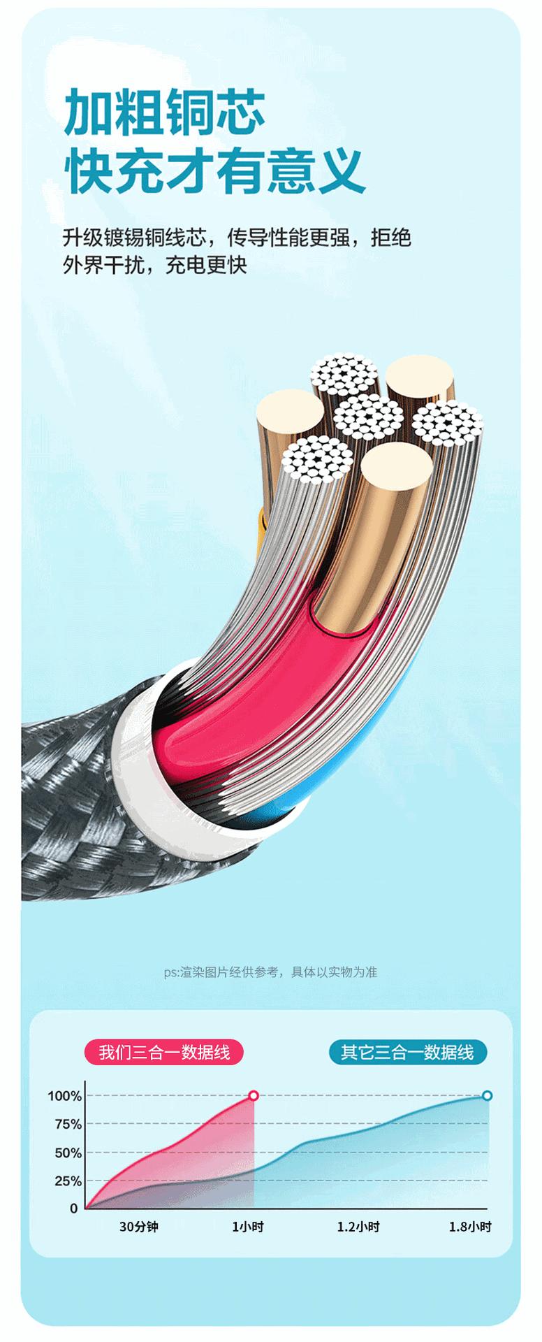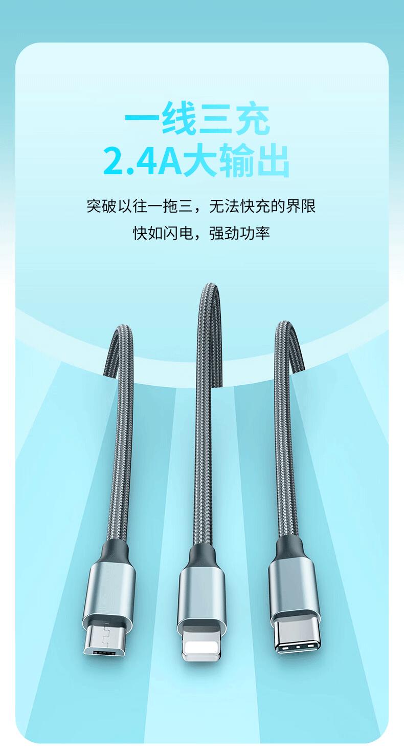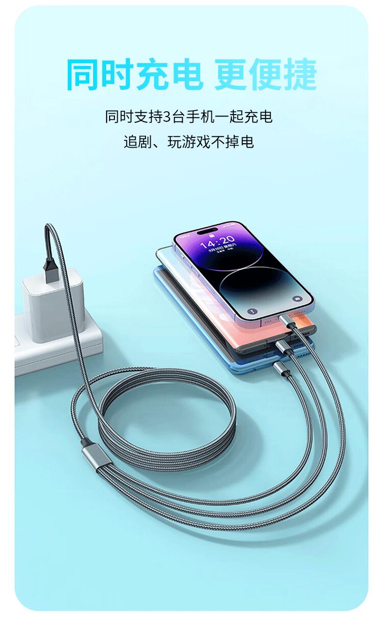Cable de datos uno a tres de 1,5 m, cable de carga rápida tejido para Apple, Android, Huawei, cable de carga tipo C tres en uno