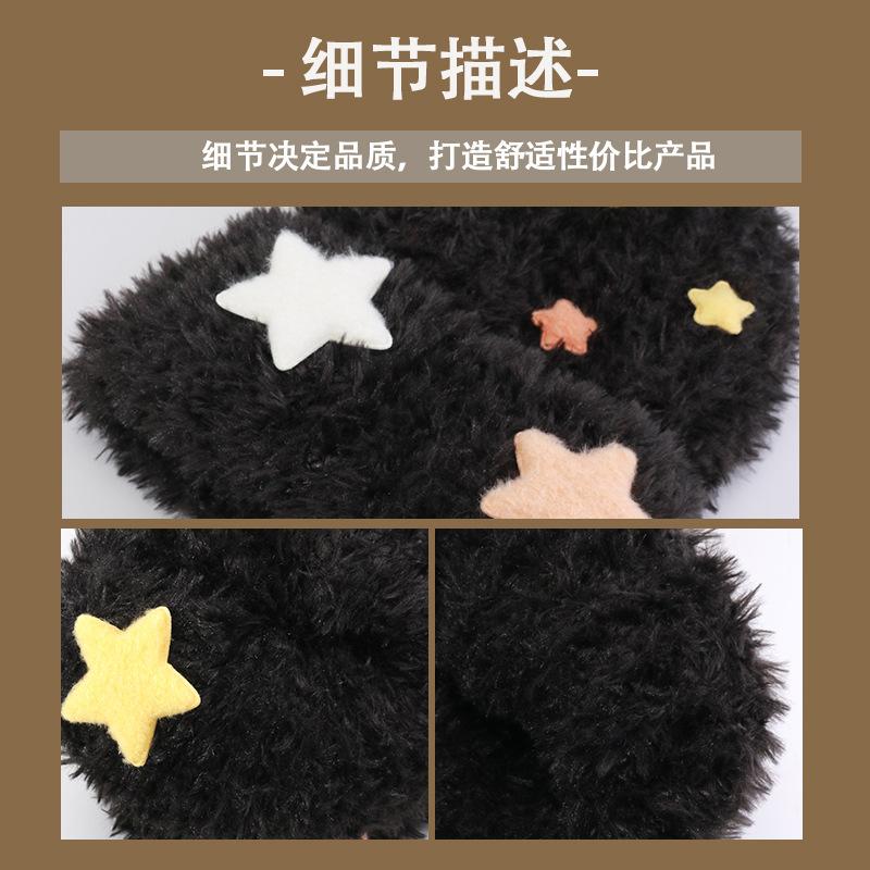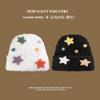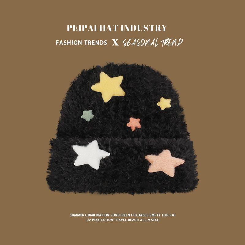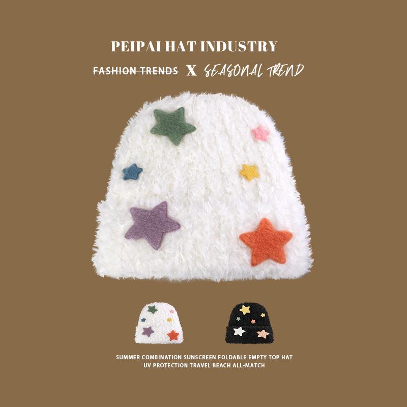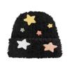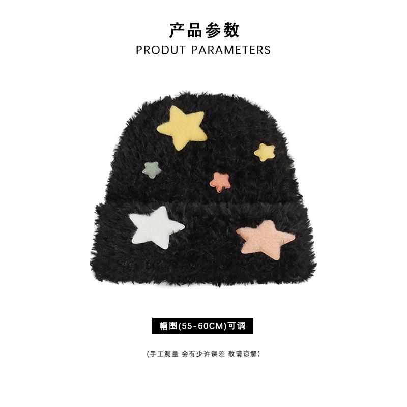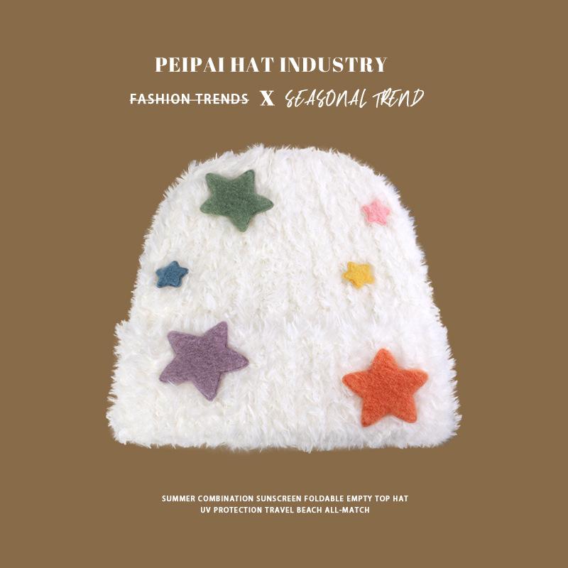 C3154 patch 6-star plush knitted hat milk white, C3154 patch 6-star plush knitted hat black