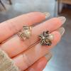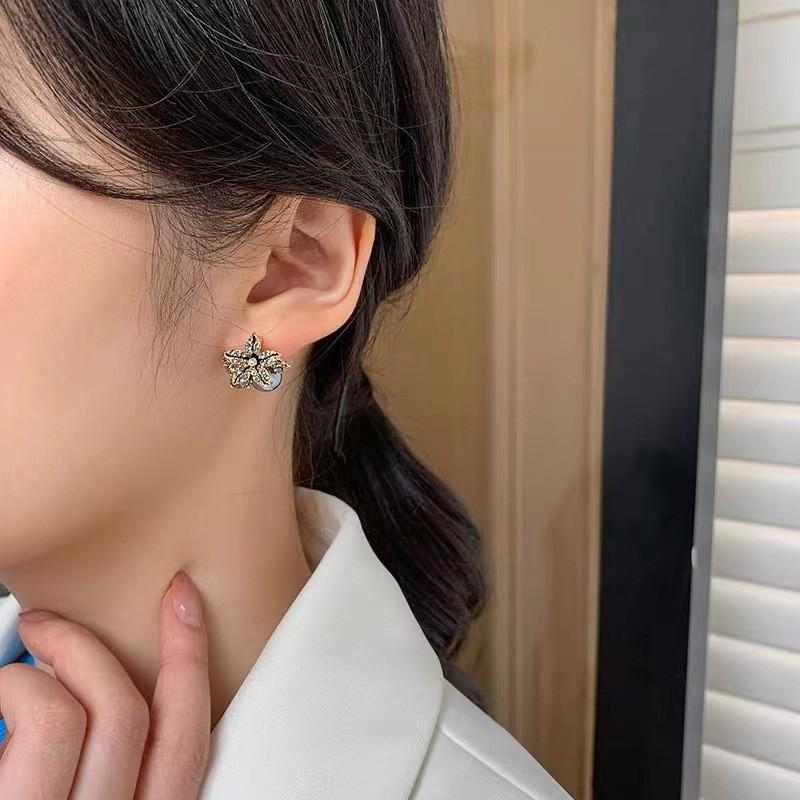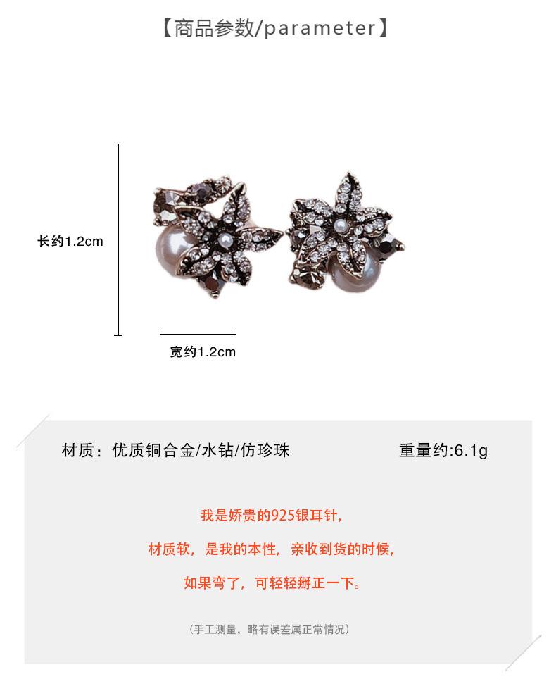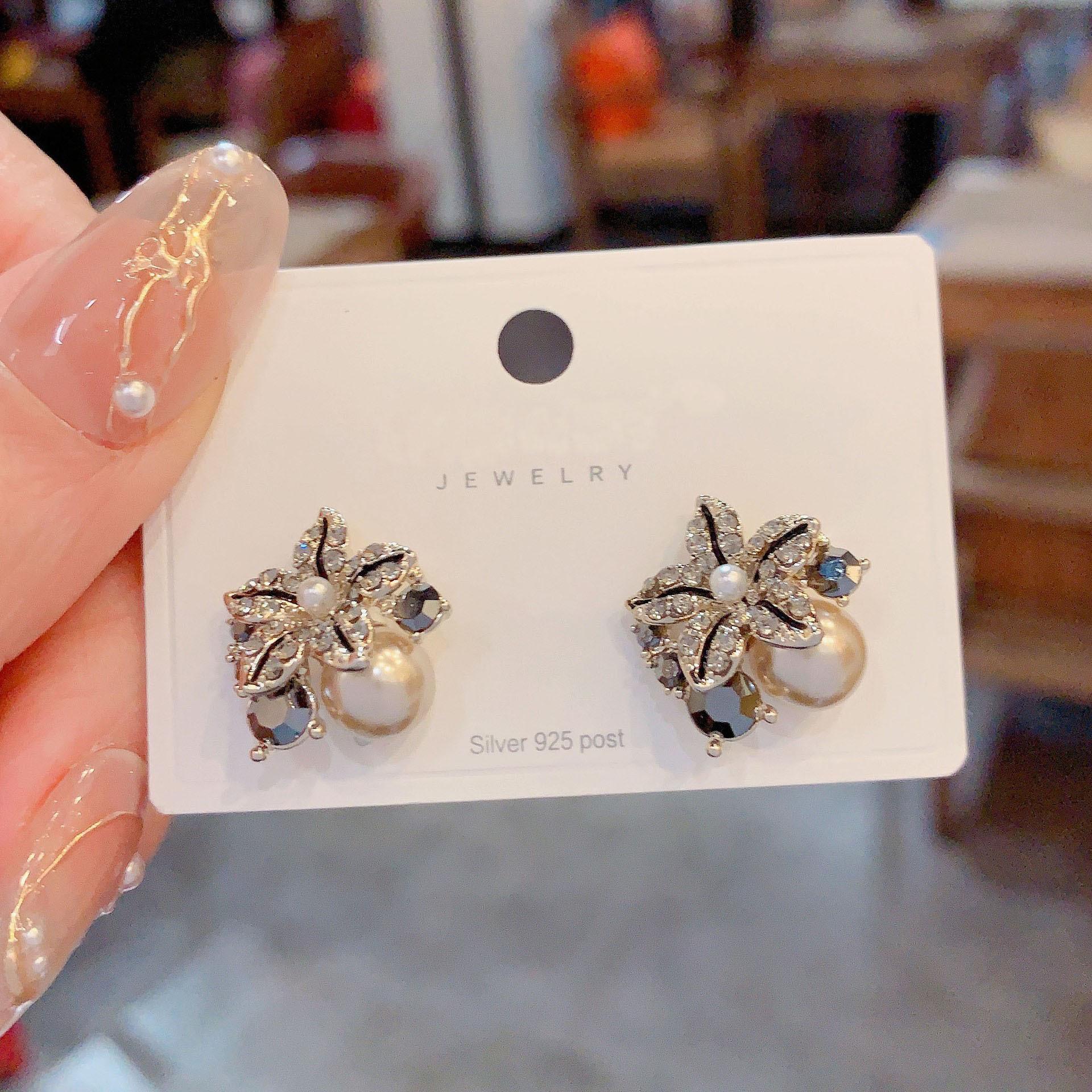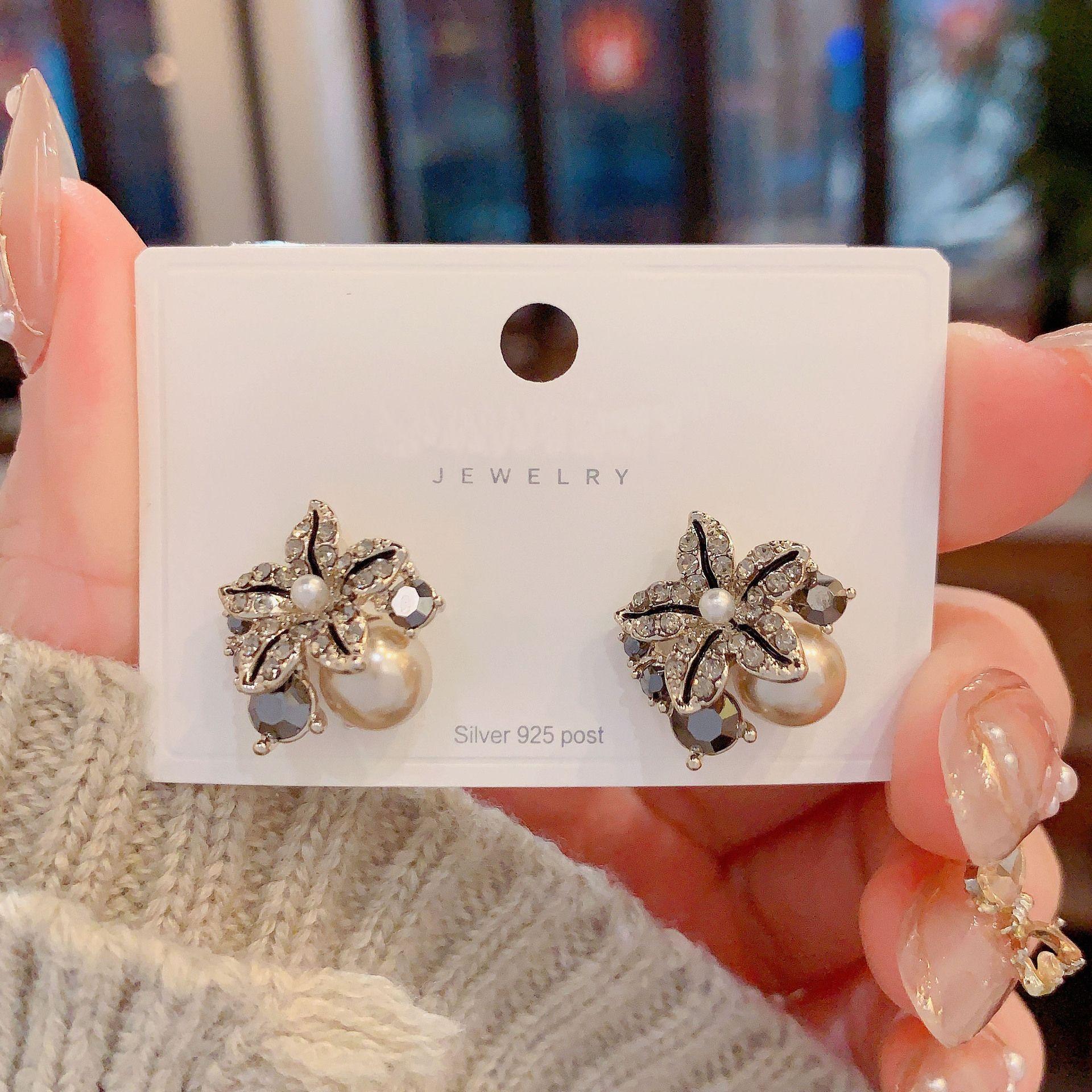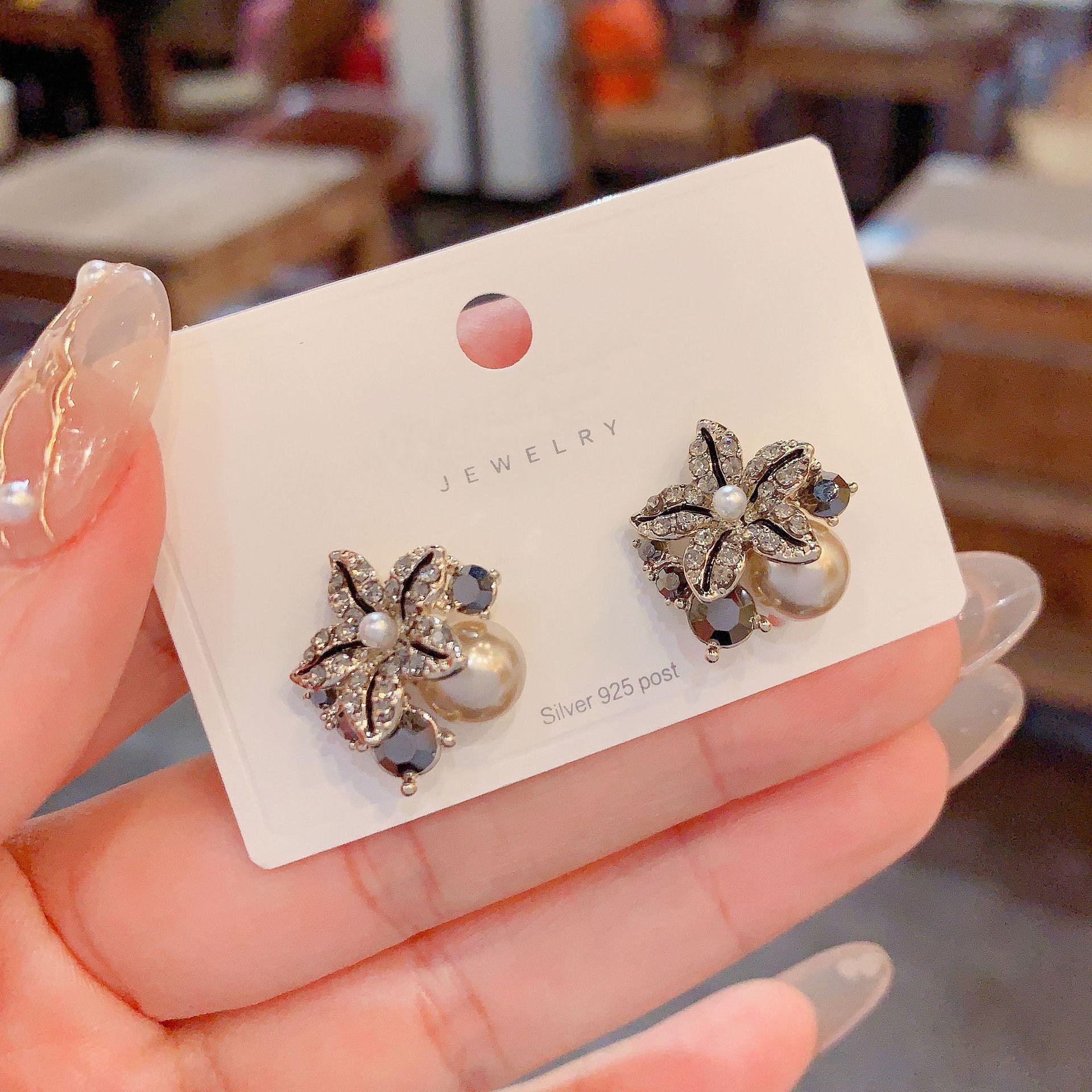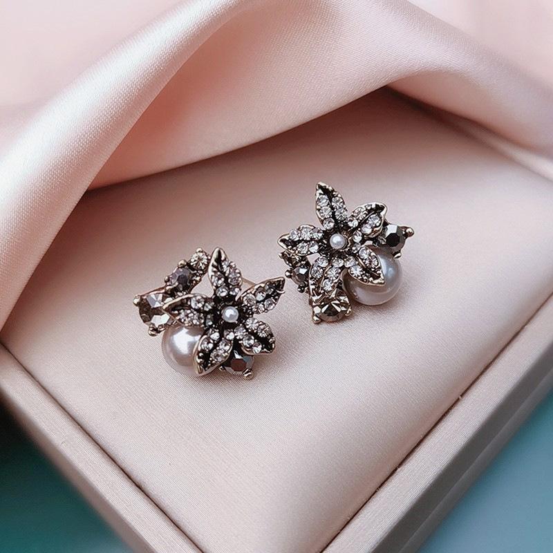 Pendientes de perlas de pétalos de circón retro estilo Hong Kong para mujer 2024. Nuevos pendientes de plata con pasador de celebridades de Internet de moda. Pendientes de estilo frío.