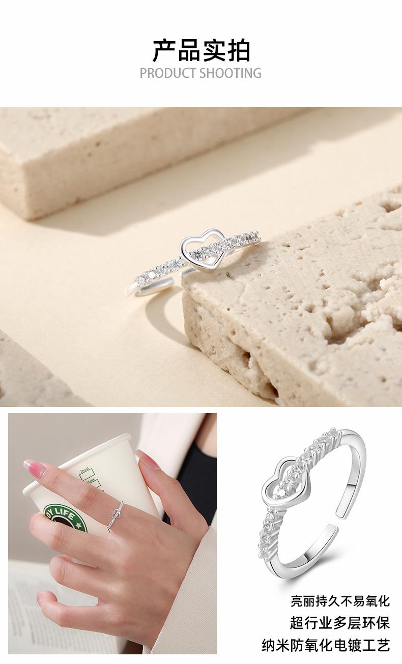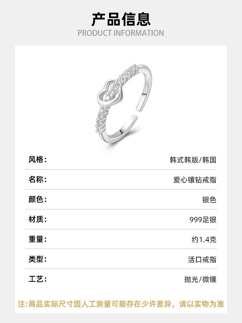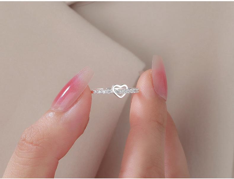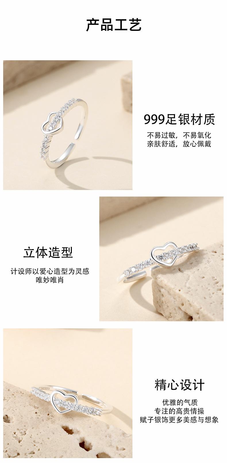 Anillo de plata de ley S999 con forma de corazón y diamantes, moderno y de alta gama, con un toque de plata, ligero y de lujo, abierto y combinable.