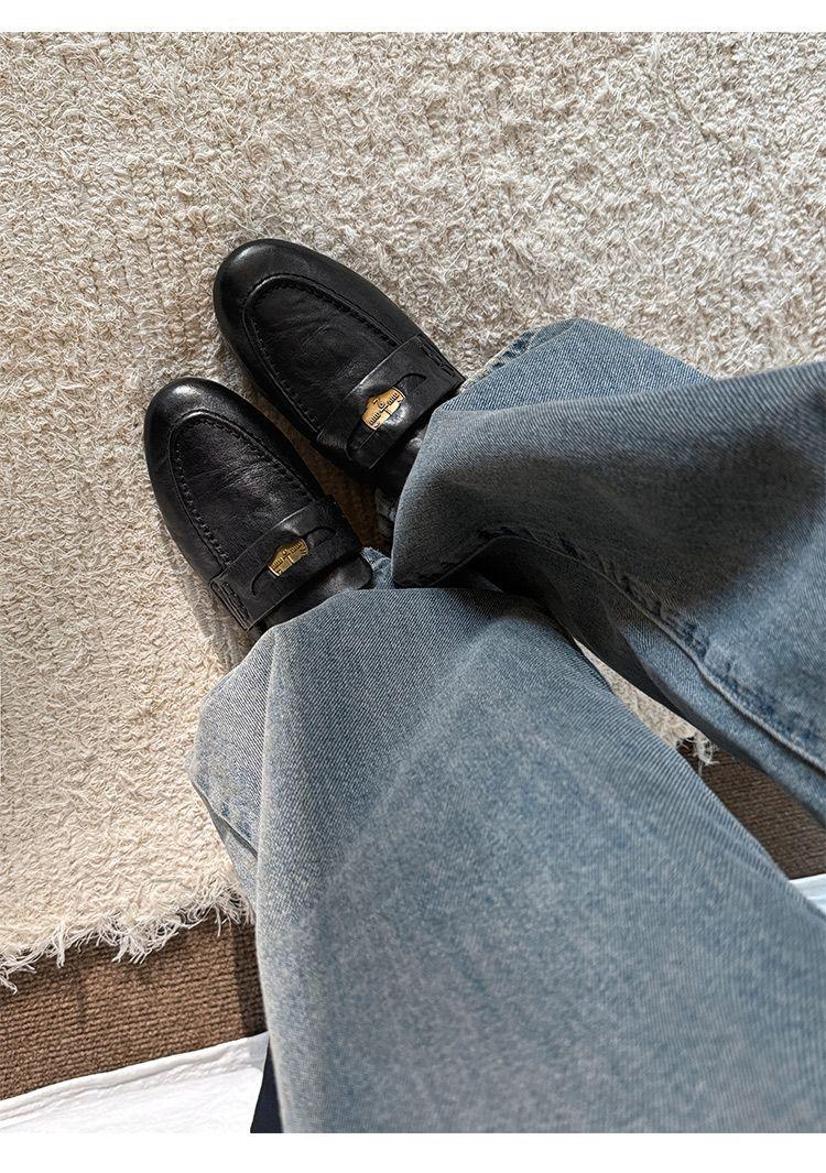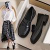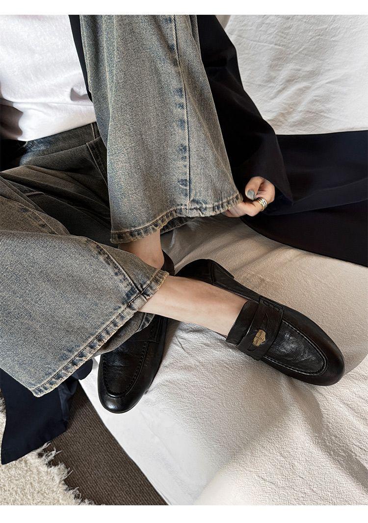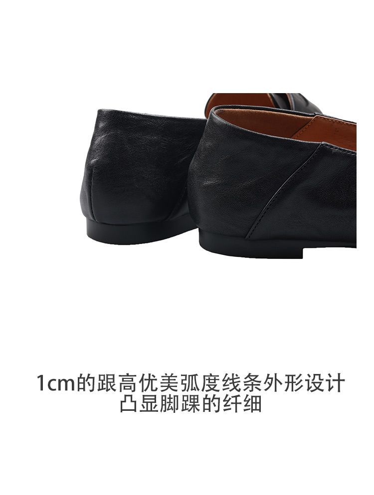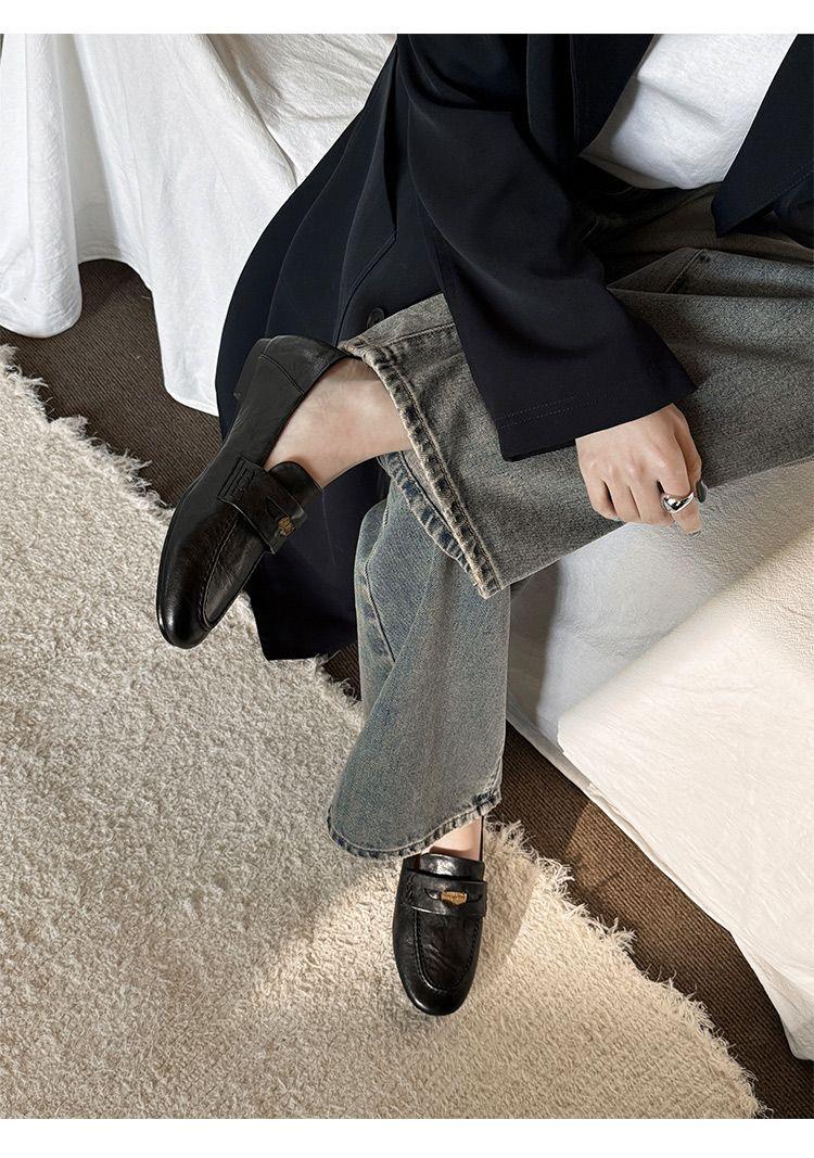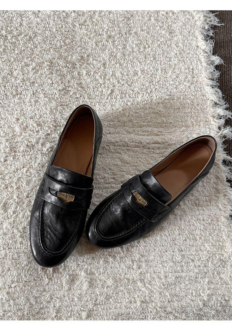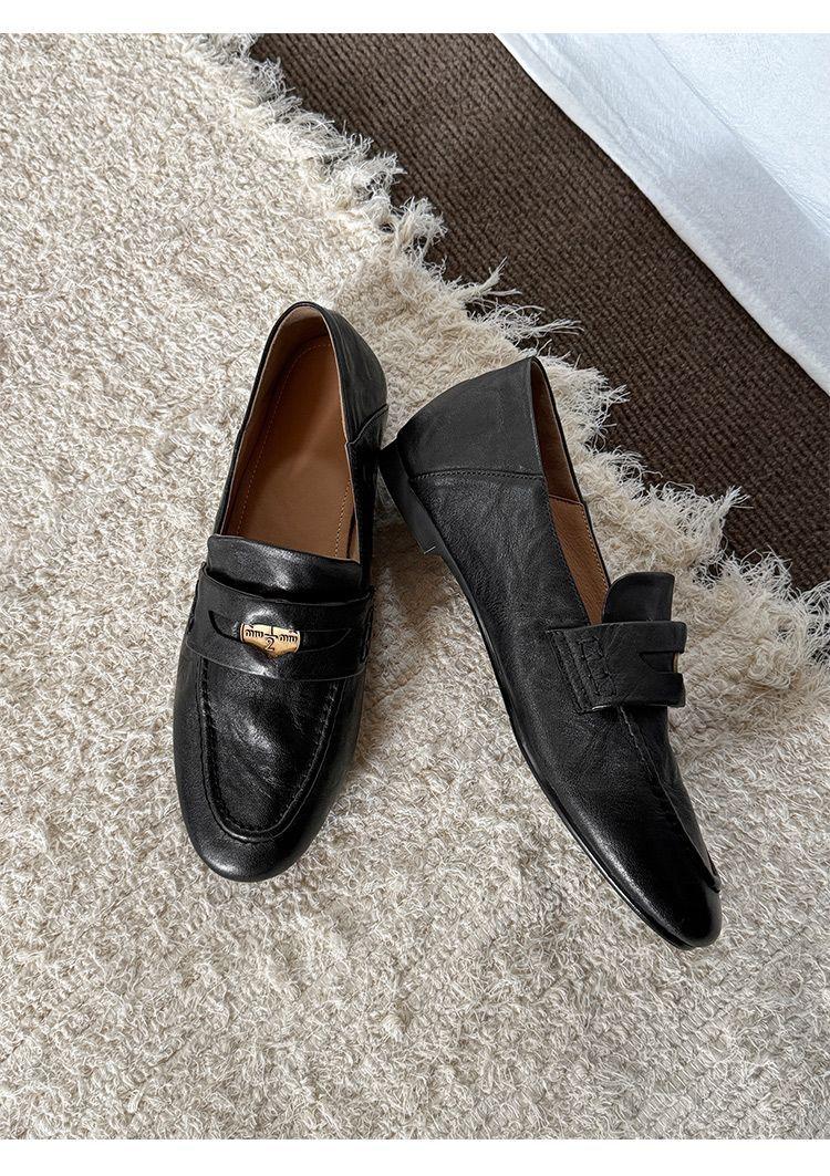 Mocasines planos de punta redonda con nicho francés para mujer, nuevos zapatos de primavera, de cuero genuino, de tacón bajo, negros, para niños.
