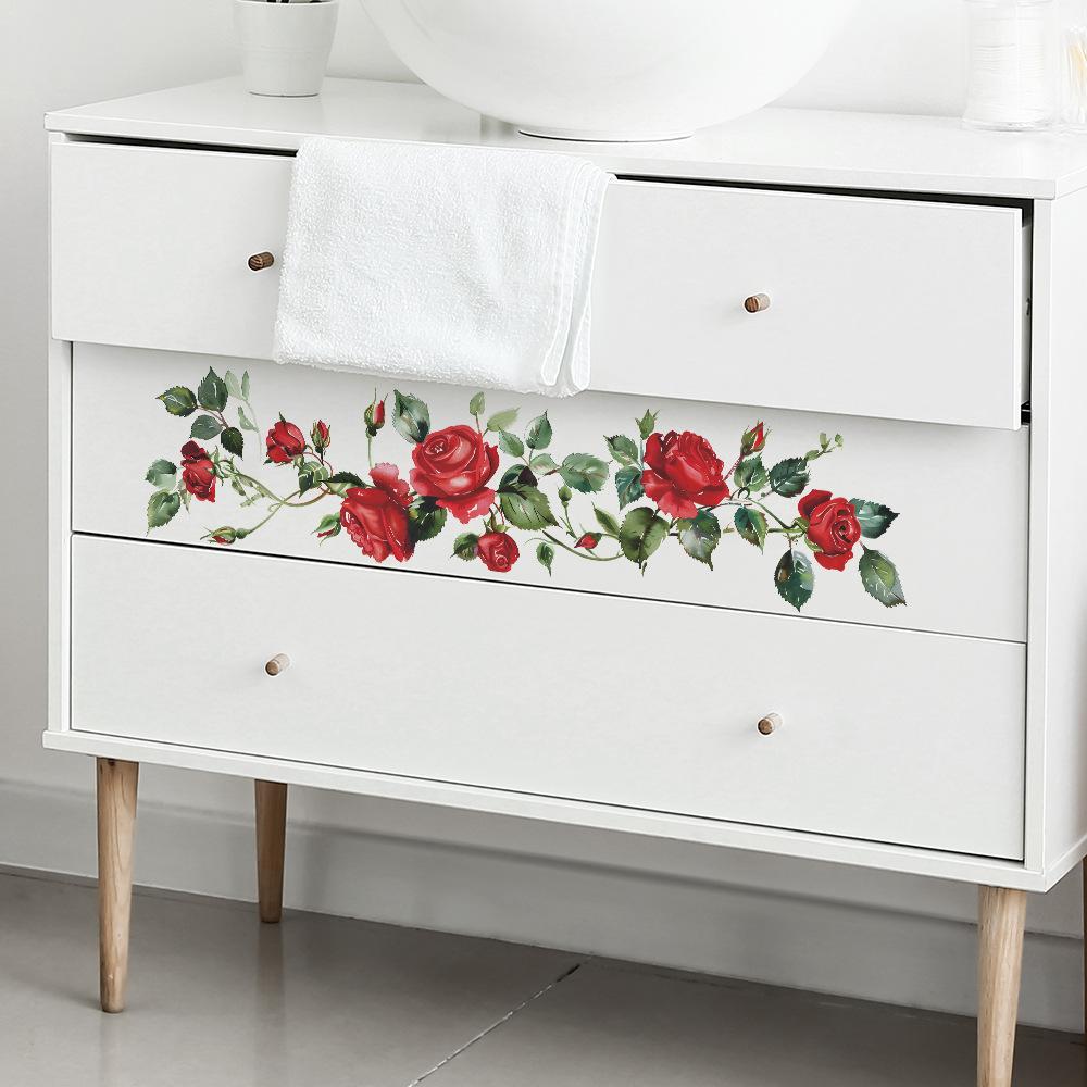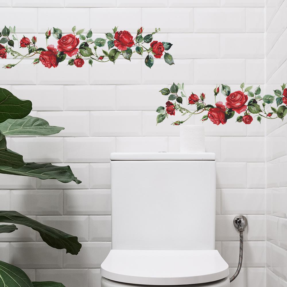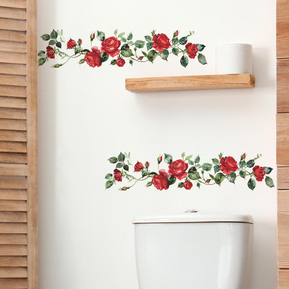 Pegatinas de pared de comercio exterior transfronterizo, pegatinas decorativas para baño, bañera, hojas verdes, rosas rojas, pegatinas autoadhesivas de ratán