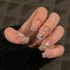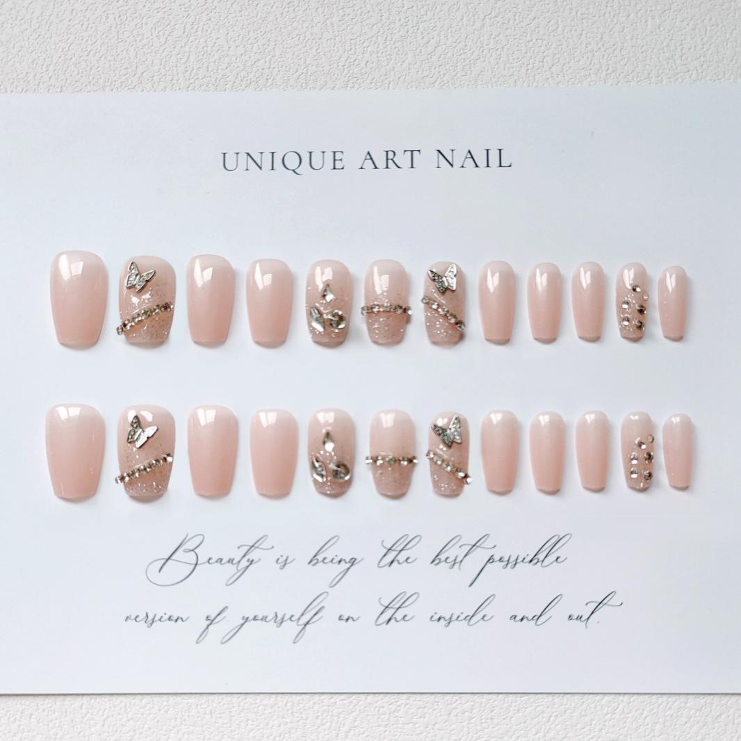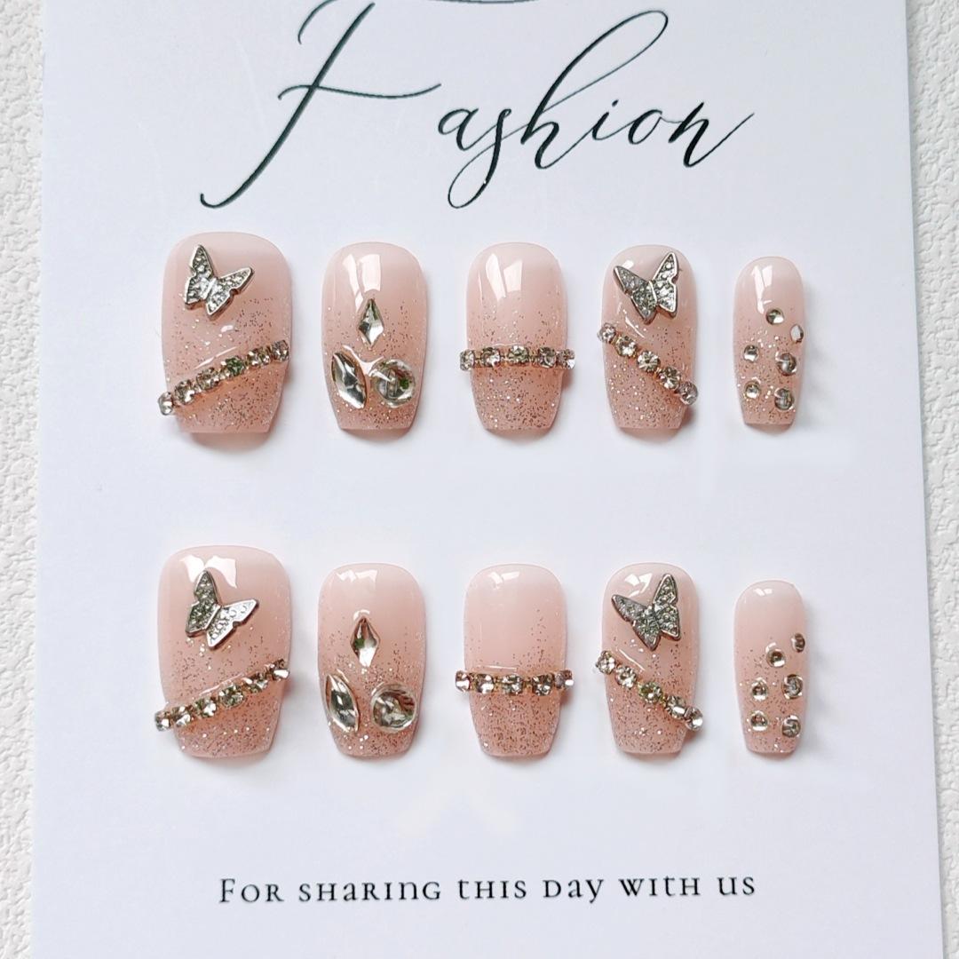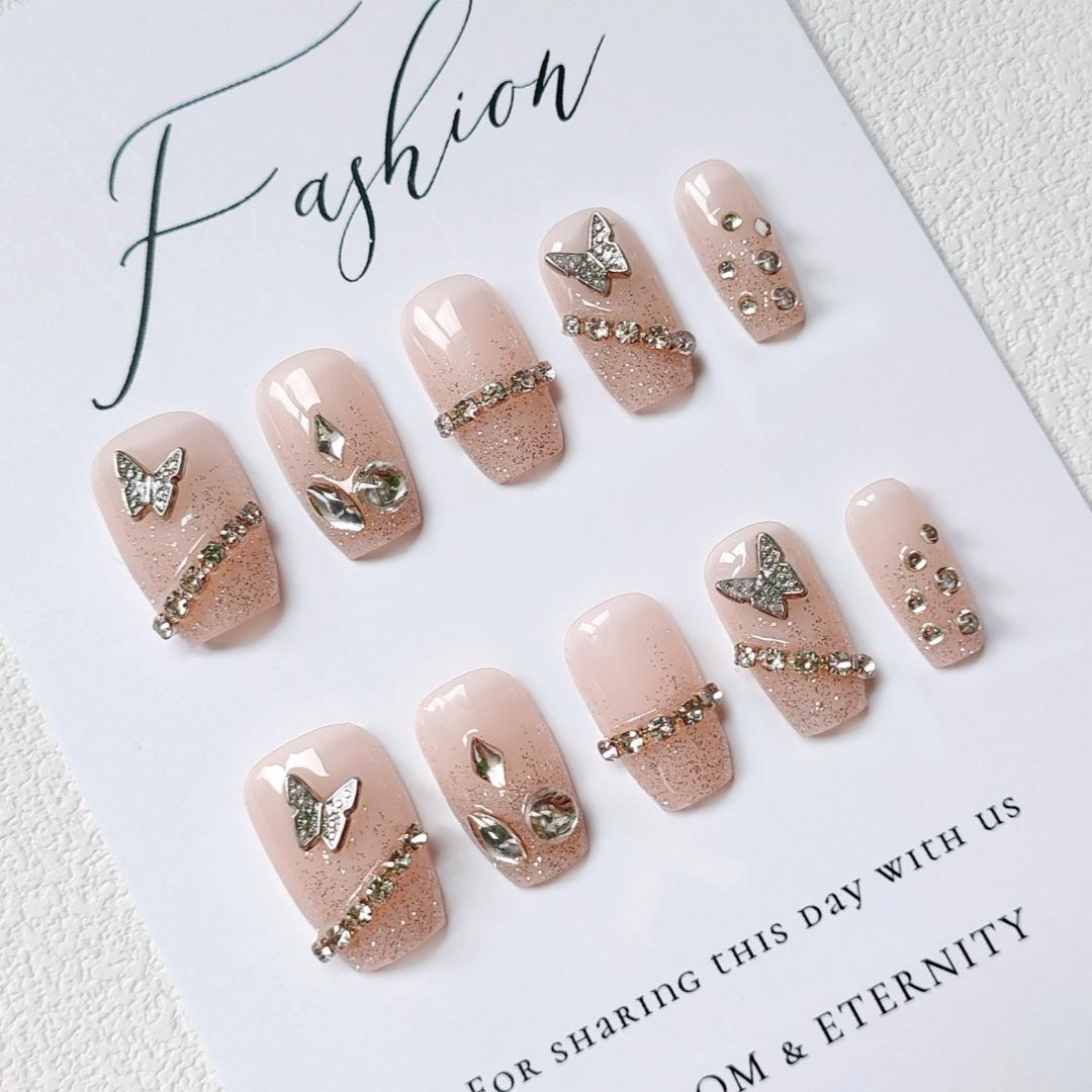 A634 - Parche de uñas postizas rojo con red de destellos de mariposa, cadena de parche de uñas postizas, acabado de armadura, corto, mediano y largo, T, desgastado a mano