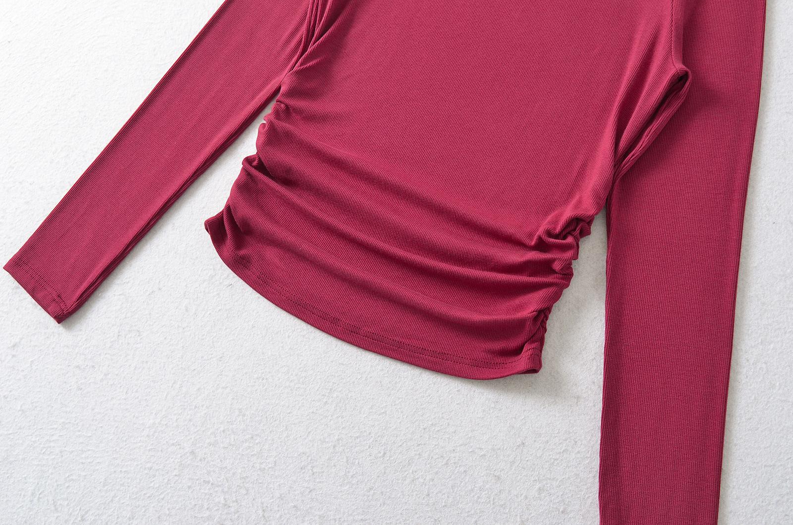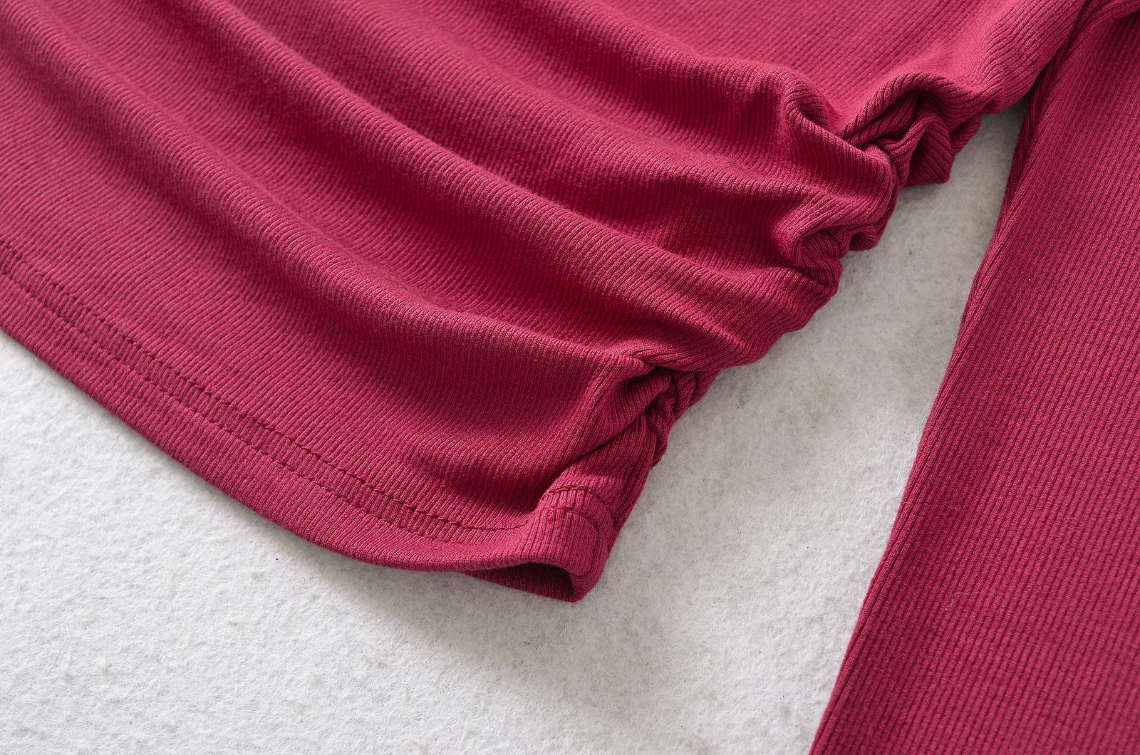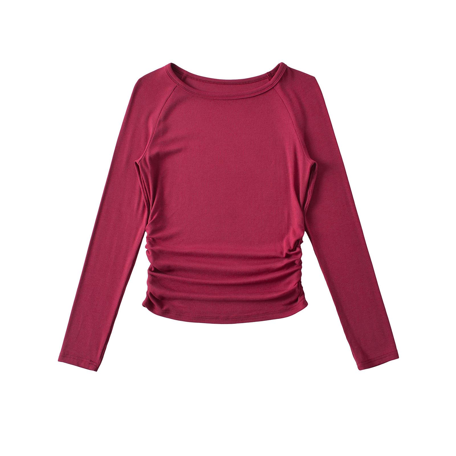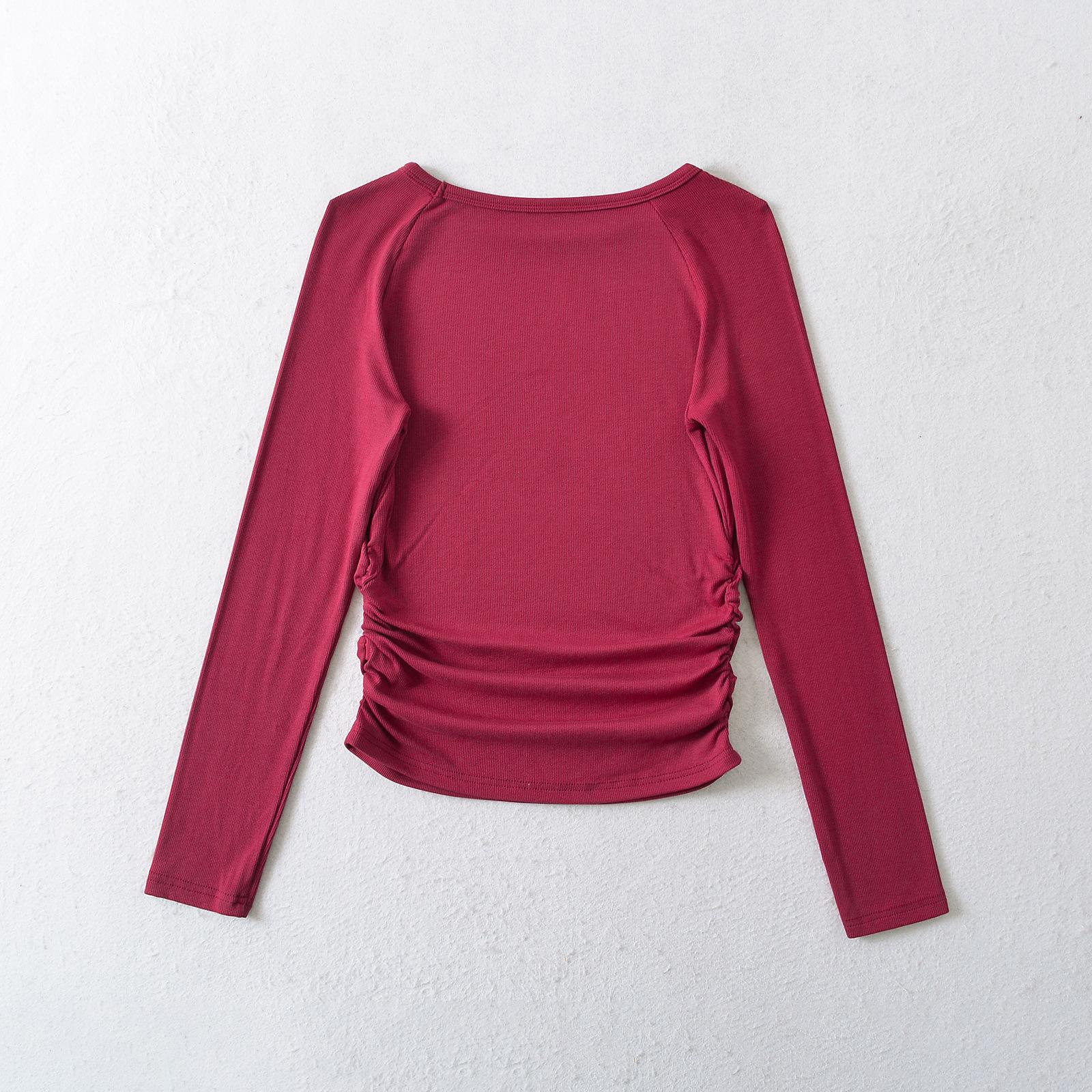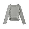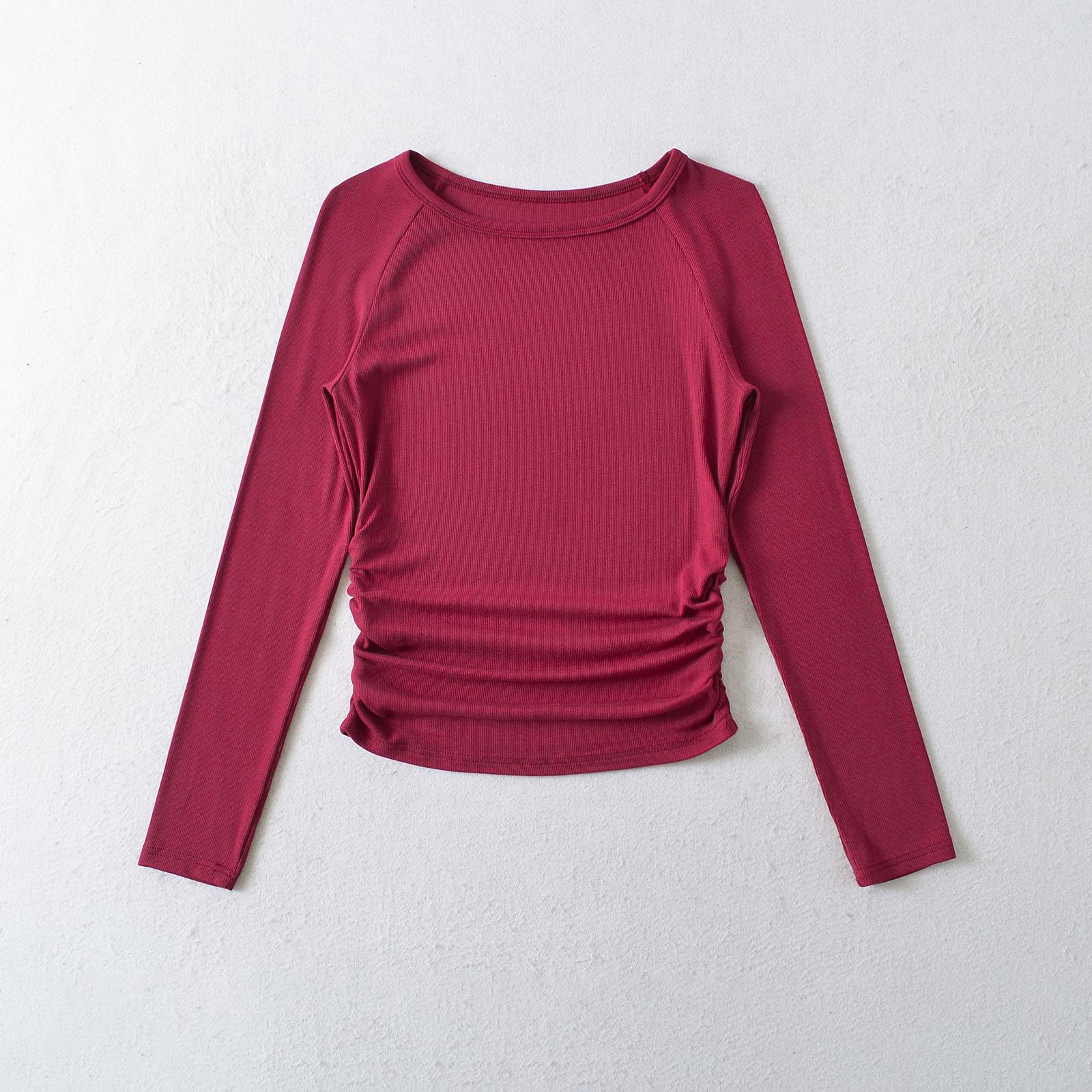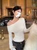 Camiseta de manga larga con cuello redondo y hombros descubiertos para mujer, estilo americano, estilo sexy, ajustada, con cintura plisada, para otoño e invierno de 2024