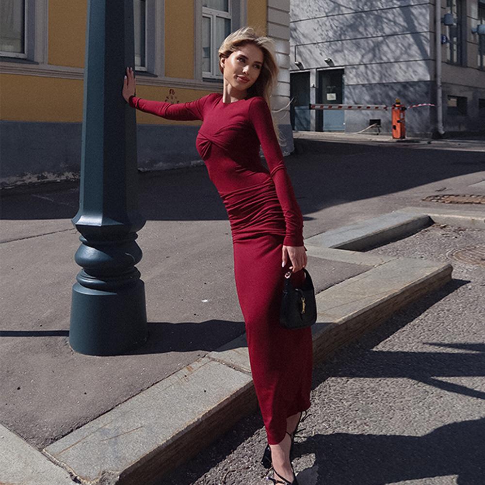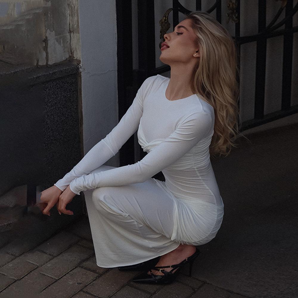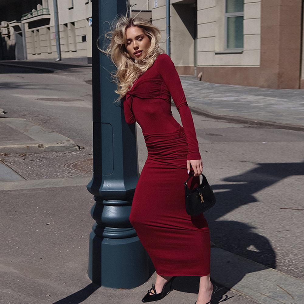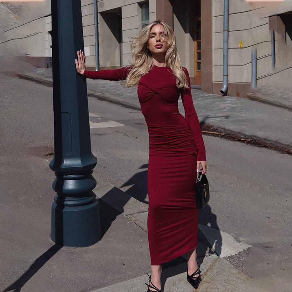 Vestido de moda de estilo europeo y americano, sexy, ajustado, con cuello redondo y manga larga, cruzado, nuevo, de color liso y con caderas encogidas.