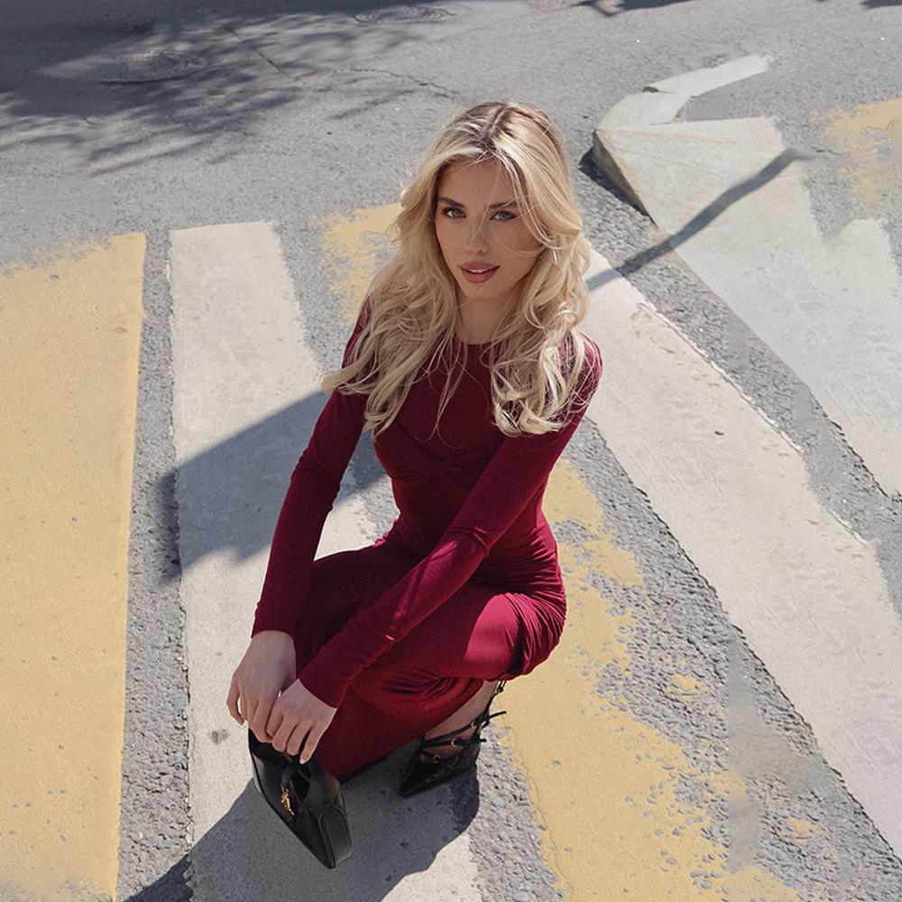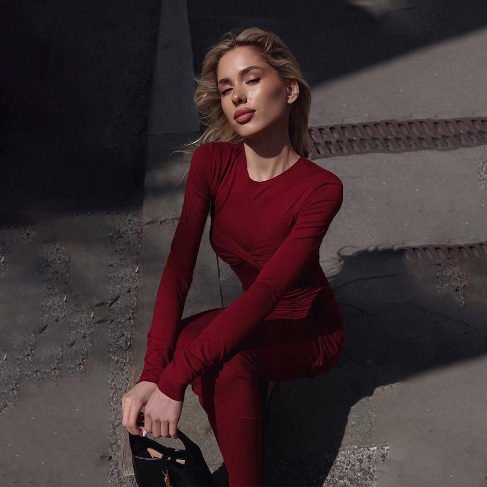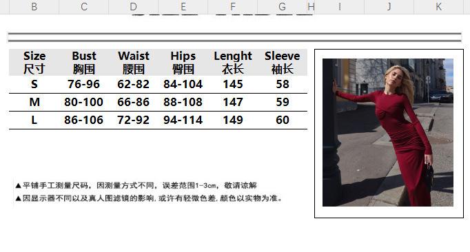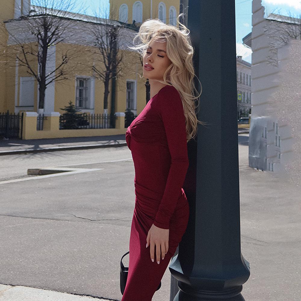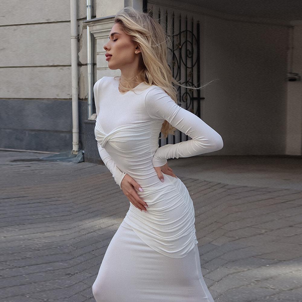Vestido de moda de estilo europeo y americano, sexy, ajustado, con cuello redondo y manga larga, cruzado, nuevo, de color liso y con caderas encogidas.