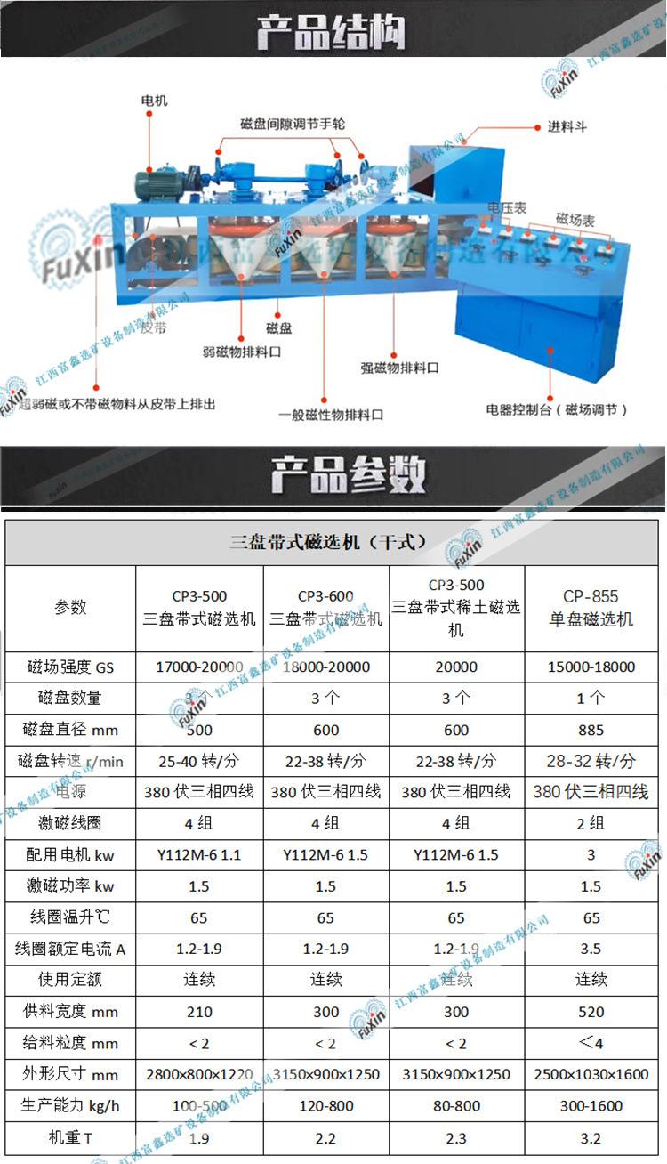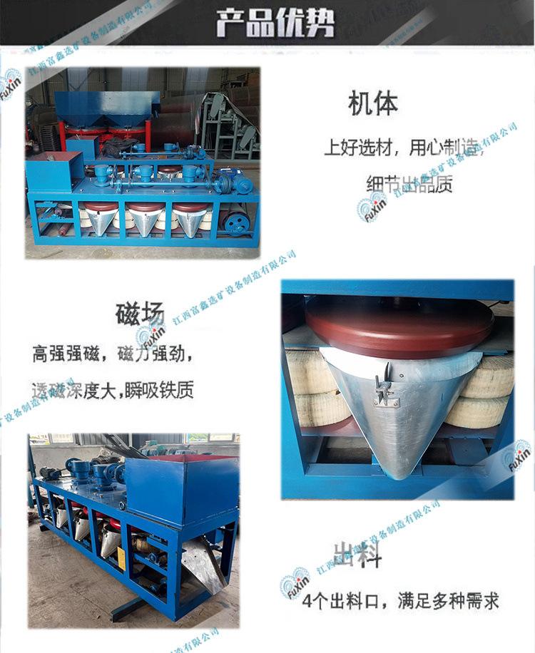 El separador magnético de tres discos es adecuado para la separación de diversos minerales, incluyendo tantalita, circón, rutilo, monacita, andalucita, granate, cianita, feldespato, cuarzo, ilmenita, mineral de tierras raras, cromita, mineral de tungsteno, mineral de estaño, limonita, etc. Además, también se puede utilizar para la eliminación de hierro de minerales no metálicos.