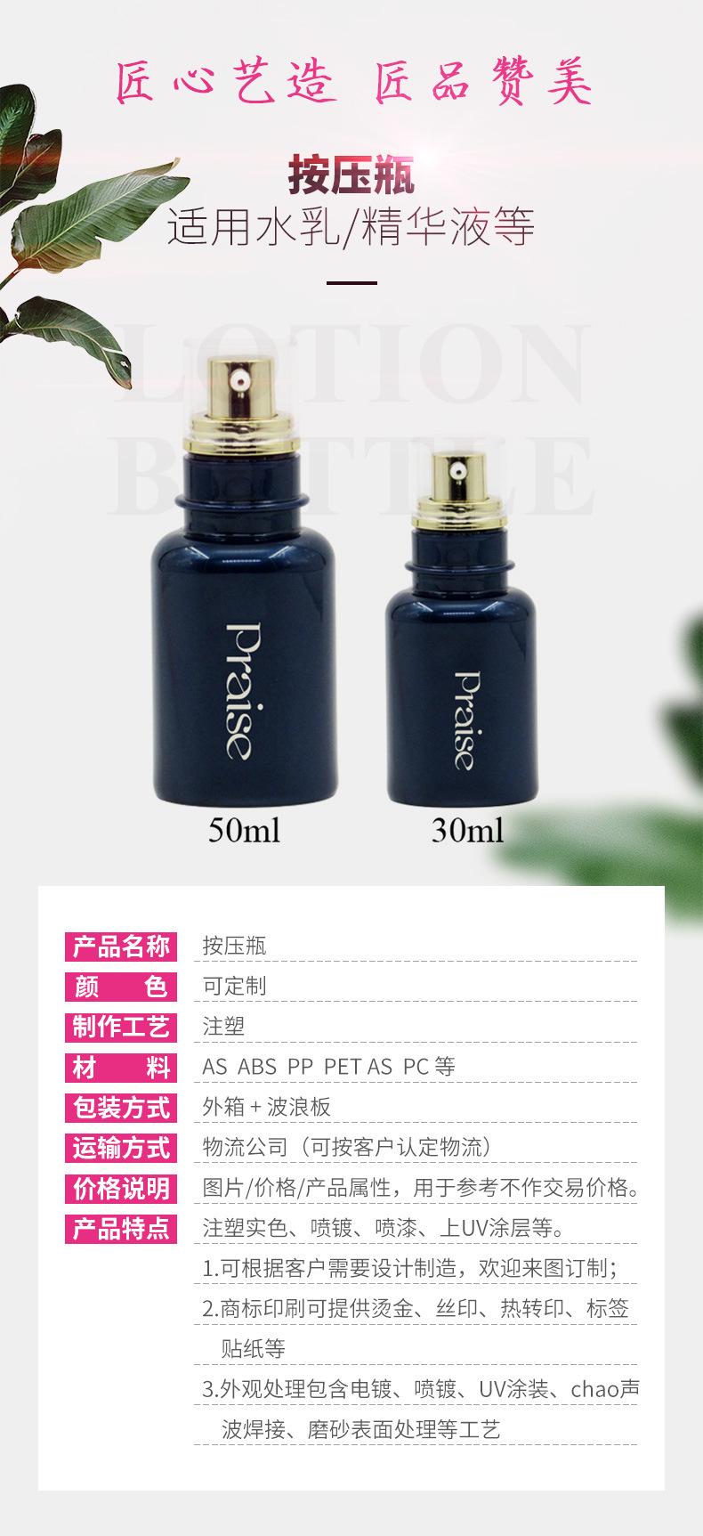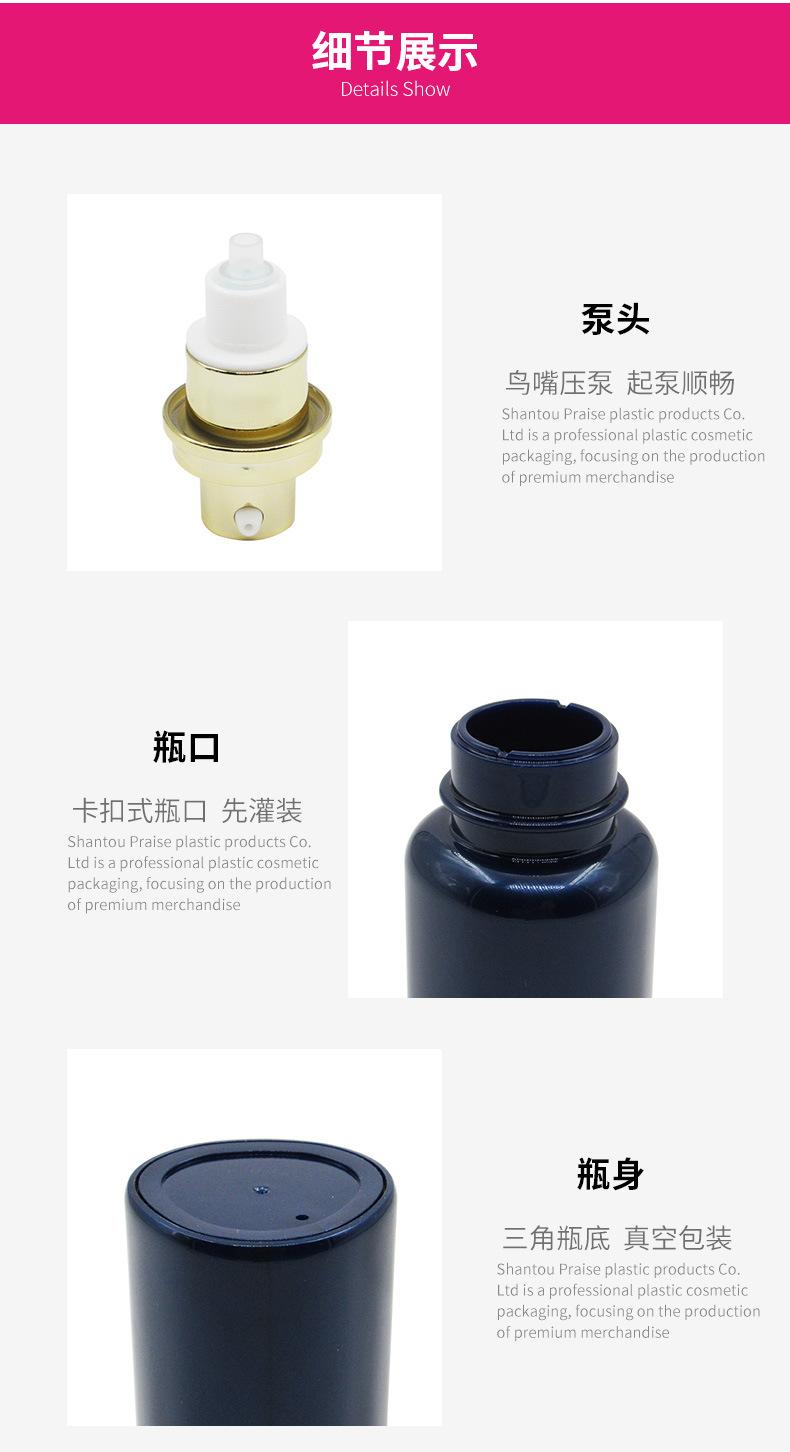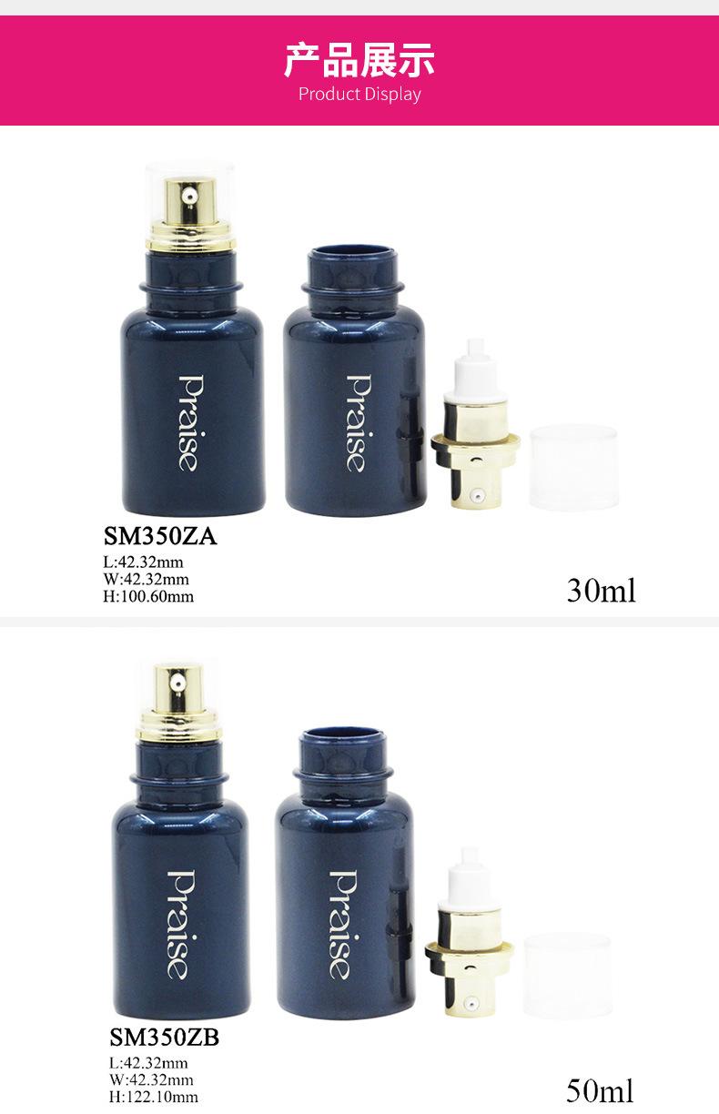 Botella de plástico para loción con prensa triangular, color azul, 30 ml y 50 ml, venta al por mayor de fábrica