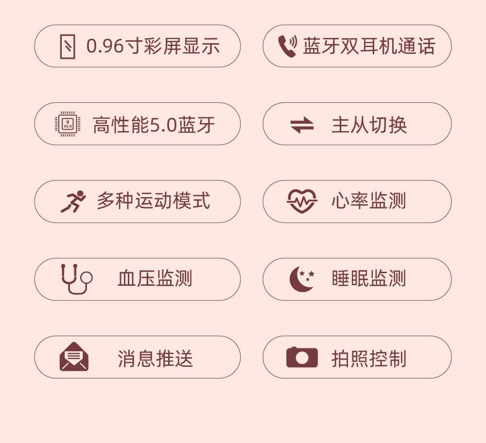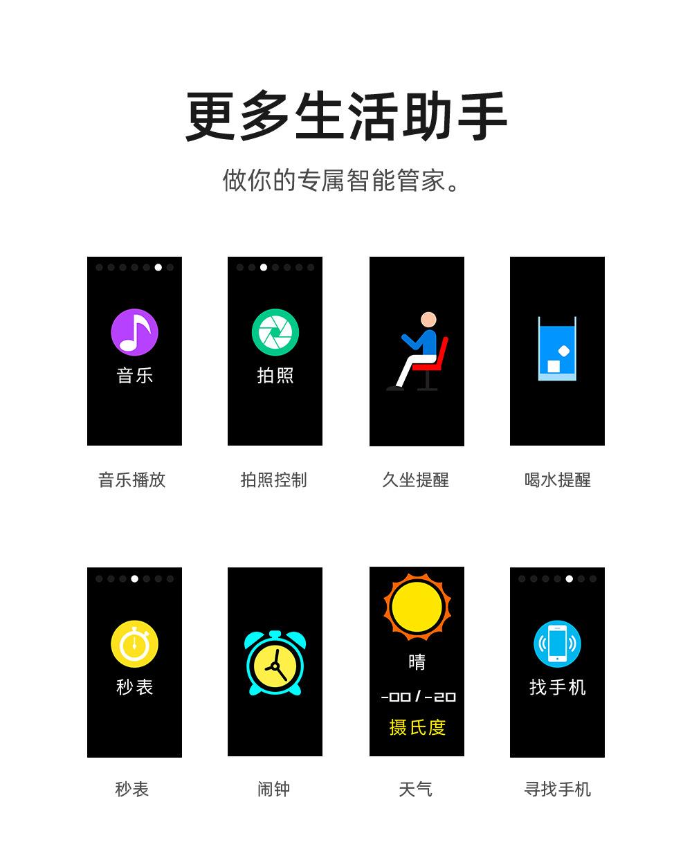 Waterproof, Take photos, Step counting, Heart rate monitoring, Social entertainment, Bluetooth call, Smart rem...