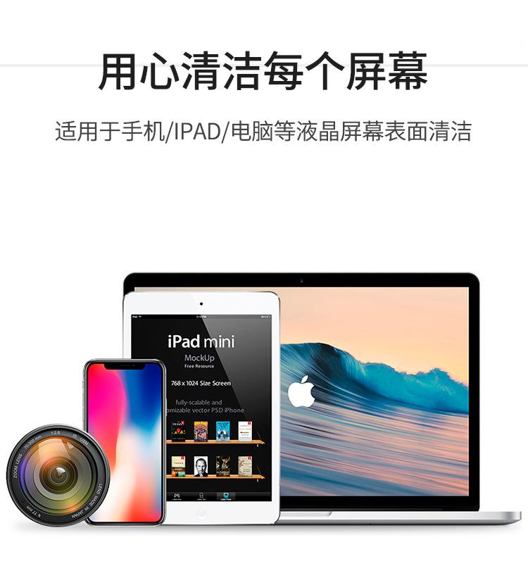 Características del producto: Apto para la limpieza de todo tipo de pantallas. Nuestro producto se distingue de otros modelos del mercado por su eficaz inhibición de bacterias, su seguridad, su ausencia de alcohol y su protección contra el recubrimiento de la pantalla. Su diseño de una sola pieza permite tocar y limpiar, y su paño de fibra especial ofrece una fuerte absorción, ahorrando tiempo y esfuerzo. Su diseño es novedoso, compacto y fácil de transportar.