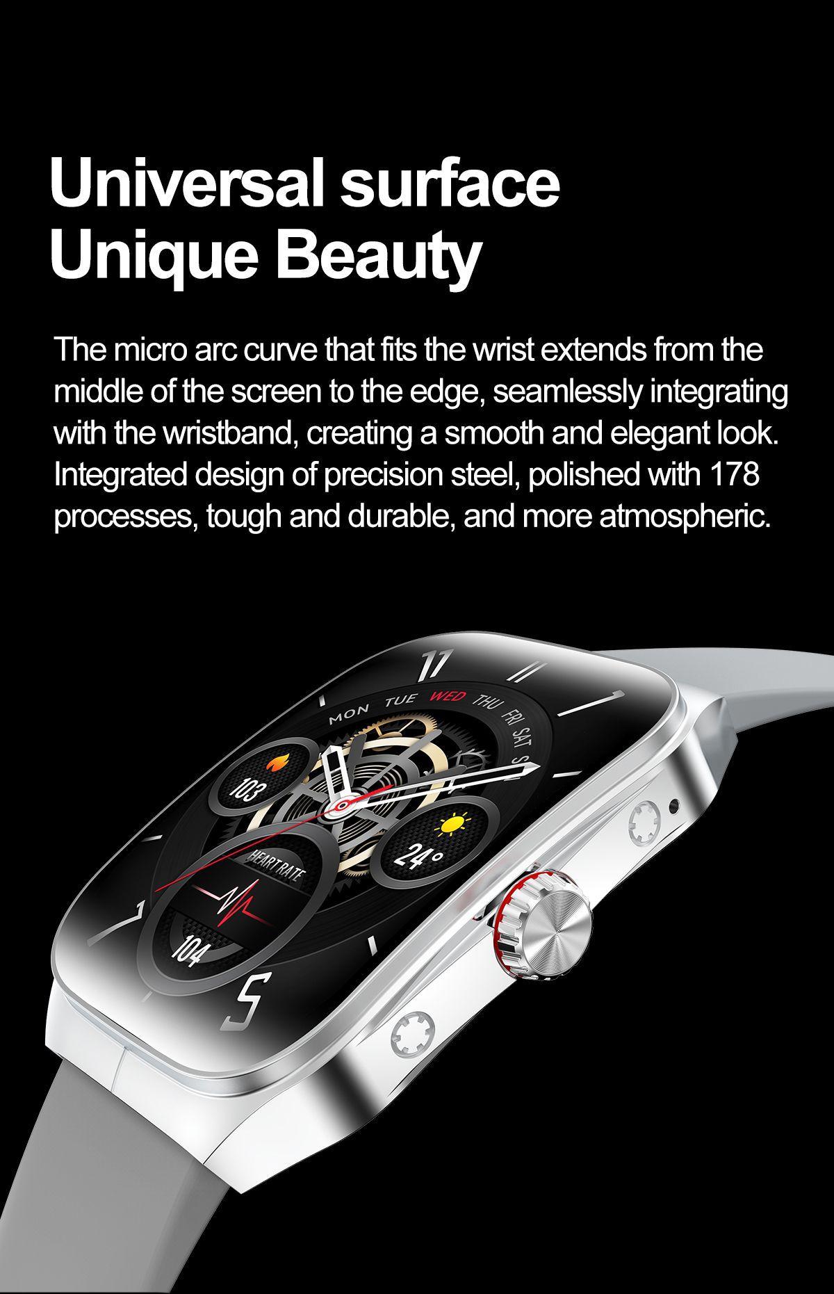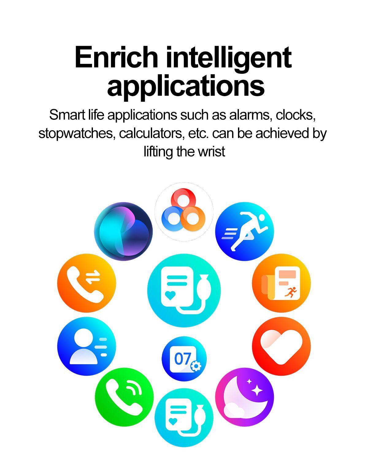 Funciones principales: Llamadas Bluetooth, control por voz, pantalla siempre encendida, NFC, entrenamiento de respiración, calendario, código de pago, isla inteligente, calculadora, desbloqueo con contraseña, esfera personalizada, pronóstico del tiempo, control de música, conteo de pasos, frecuencia cardíaca, sueño, sedentarismo, kilometraje, oxígeno en sangre, presión arterial, búsqueda, calorías, notificación de mensajes