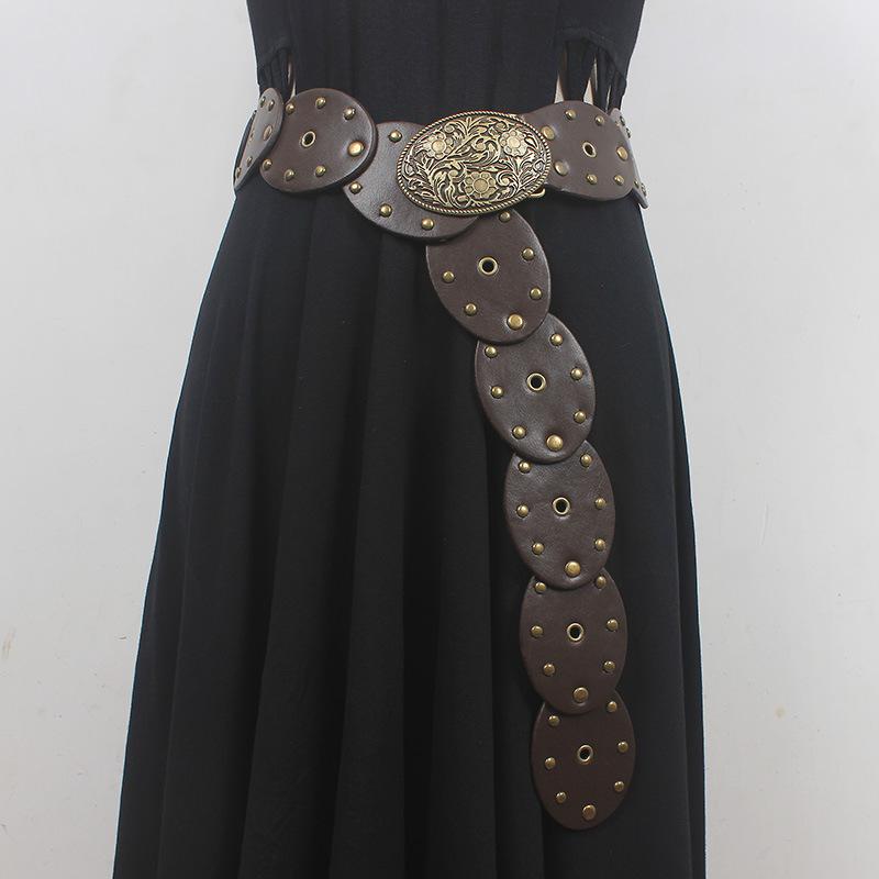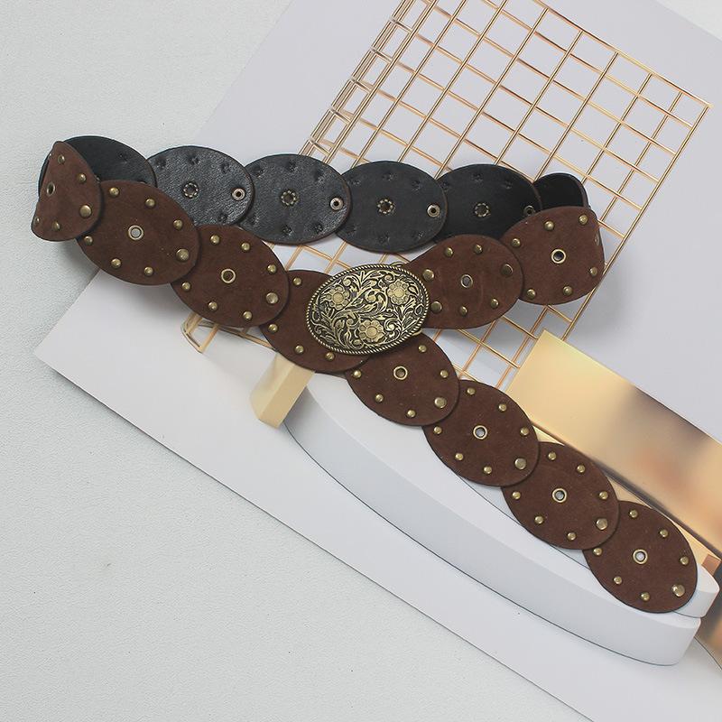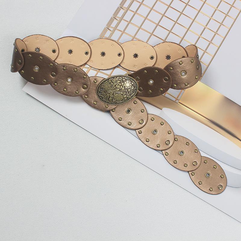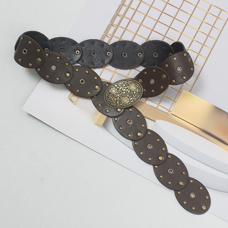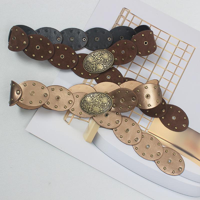 Cinturón con remaches y costuras de disco, estilo chic europeo y americano, para mujer, estilo antiguo vintage, personalizado, combina con todo.