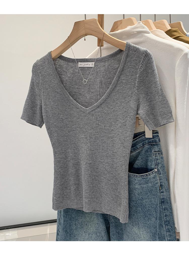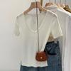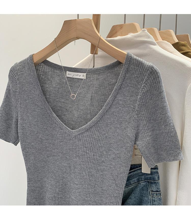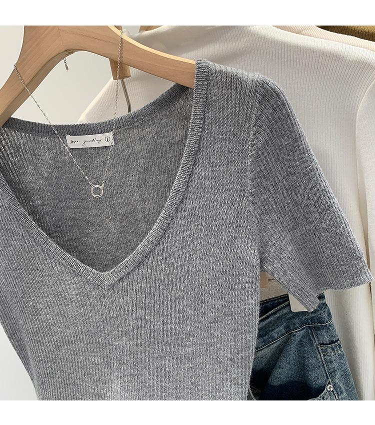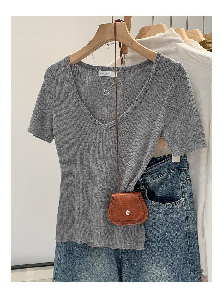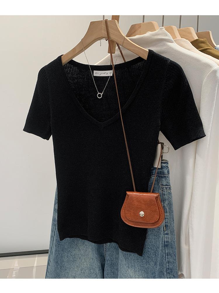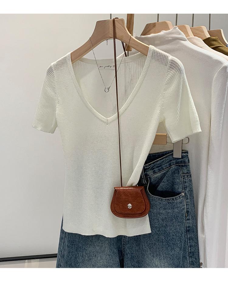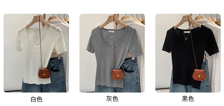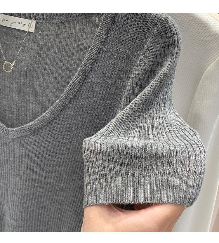 Tejido de Punto de Manga Corta con Cuello en V Delgado de Hombro Derecho para Mujer Otoño y Verano 2025 Nuevo Estilo Top Corto Super Bonito para Personas Pequeñas