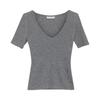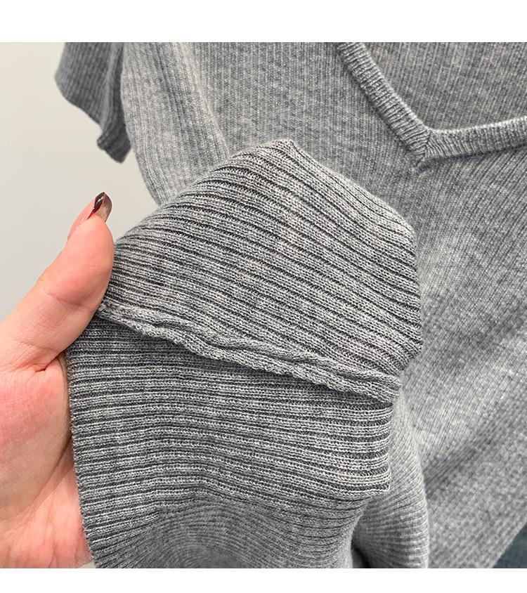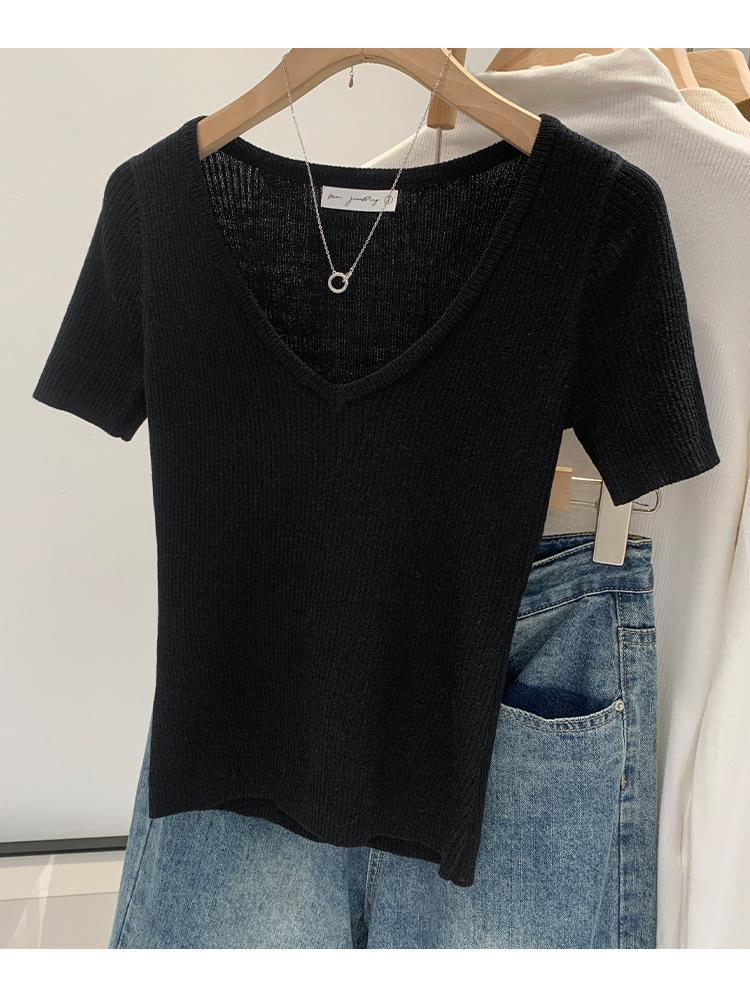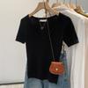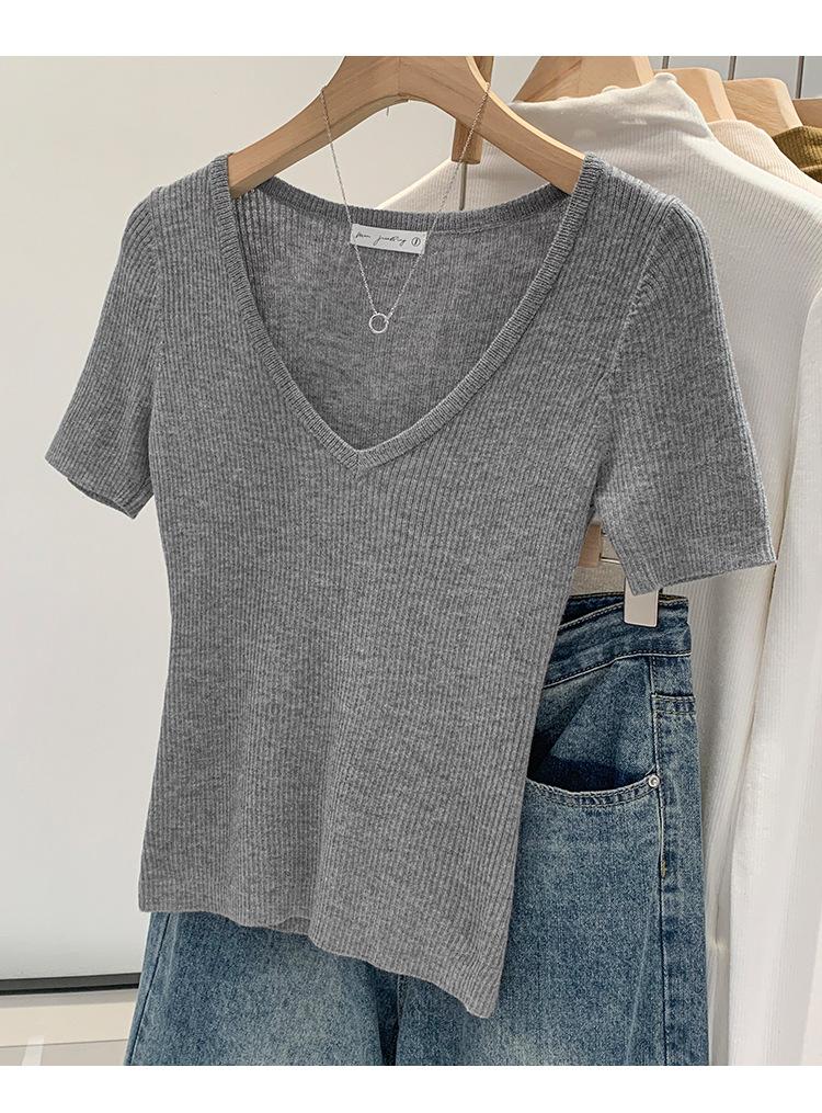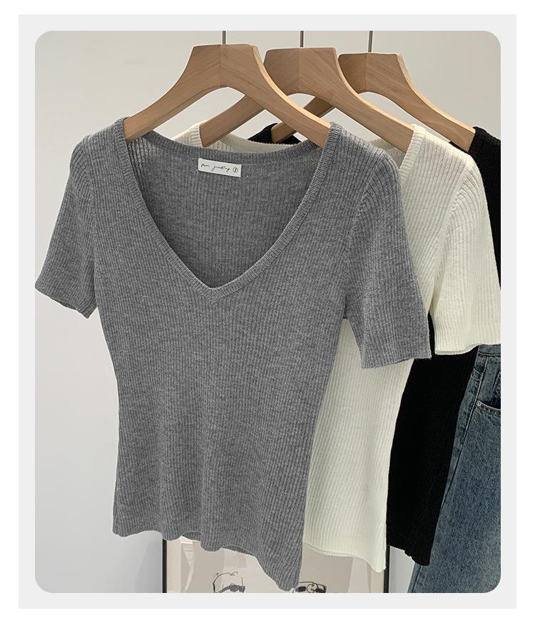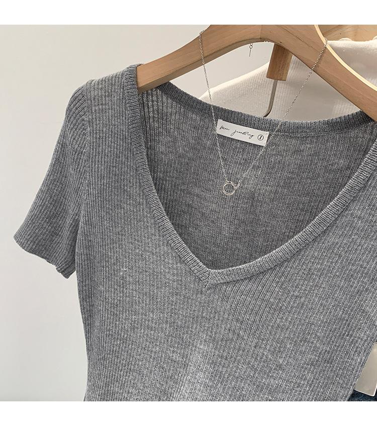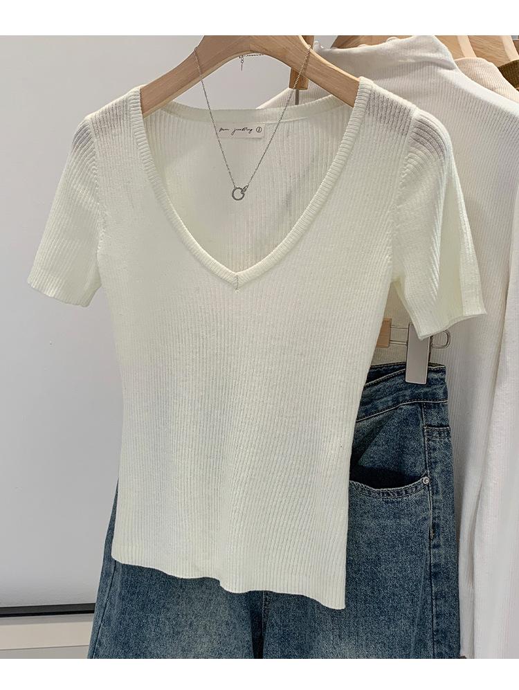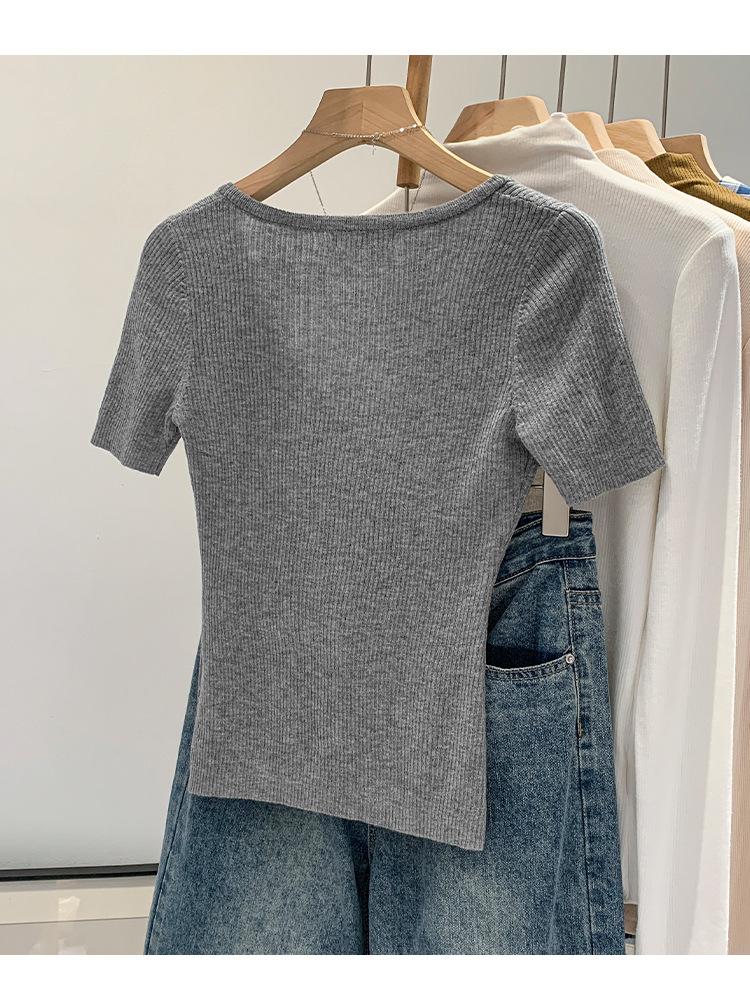 Tejido de Punto de Manga Corta con Cuello en V Delgado de Hombro Derecho para Mujer Otoño y Verano 2025 Nuevo Estilo Top Corto Super Bonito para Personas Pequeñas
