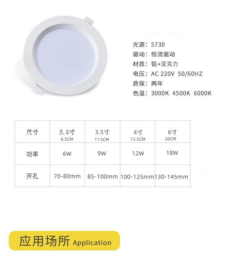 2.5 inch -6W (opening 70-80MM), 3.5 inch -9W (opening 80-100MM), 4 inch -12W (opening 100-125MM), 6 inch -18W (opening 130-145MM)