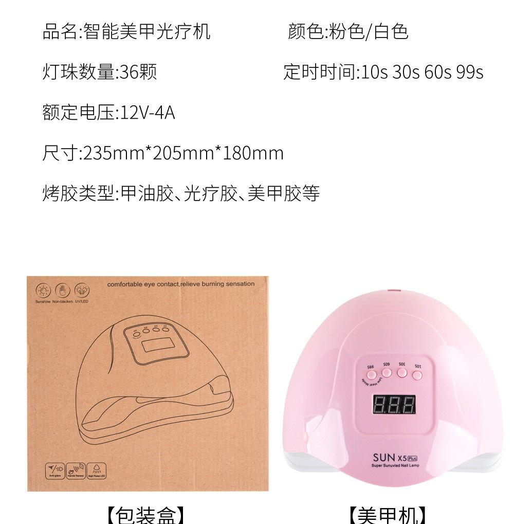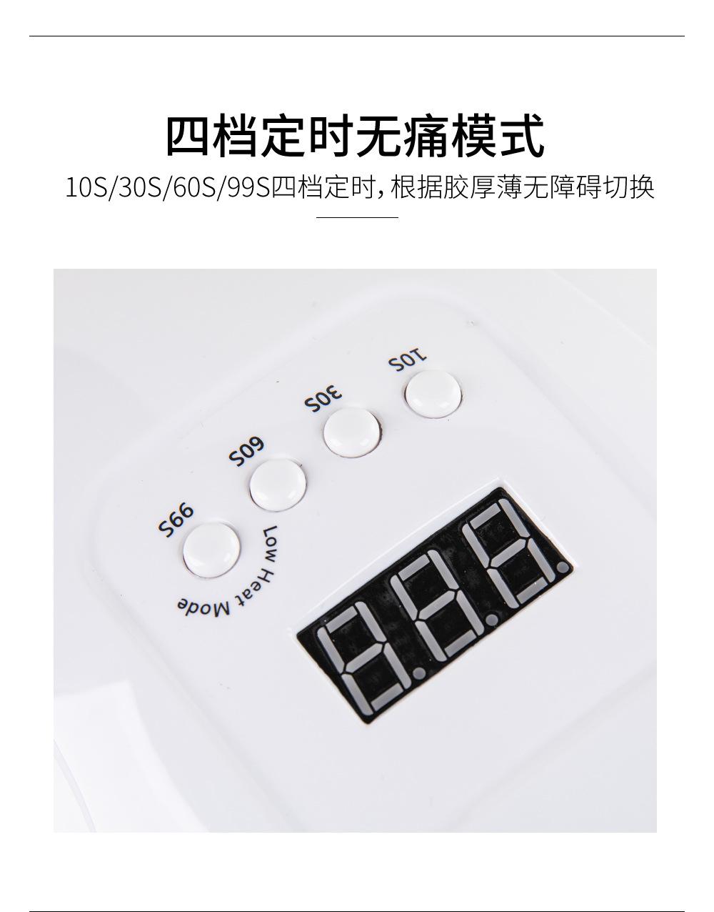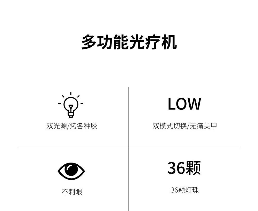 Alta potencia, 36 perlas de fuente de luz LED, seca todo el esmalte de uñas, la fuente de luz no daña los ojos, no oscurece las manos, no pica y tiene 4 funciones de temporización. |