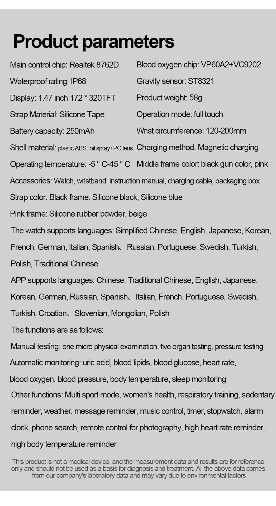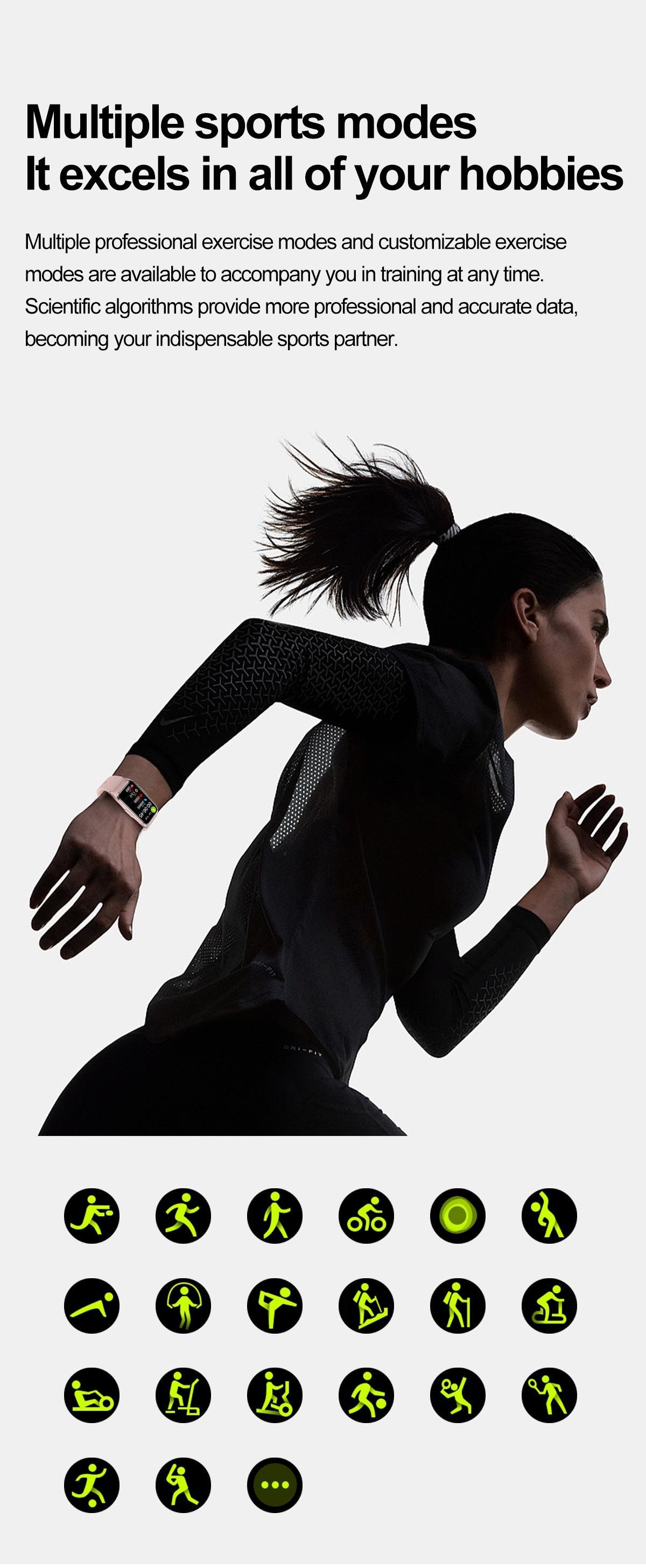 Otras funciones: salud femenina, entrenamiento de respiración, recordatorio de alta temperatura, recordatorio de frecuencia cardíaca alta, recordatorio de mensajes, cronómetro, cuenta regresiva, conteo de pasos, calorías, distancia, modo de ejercicio, recordatorio de llamadas, recordatorio de alarma,