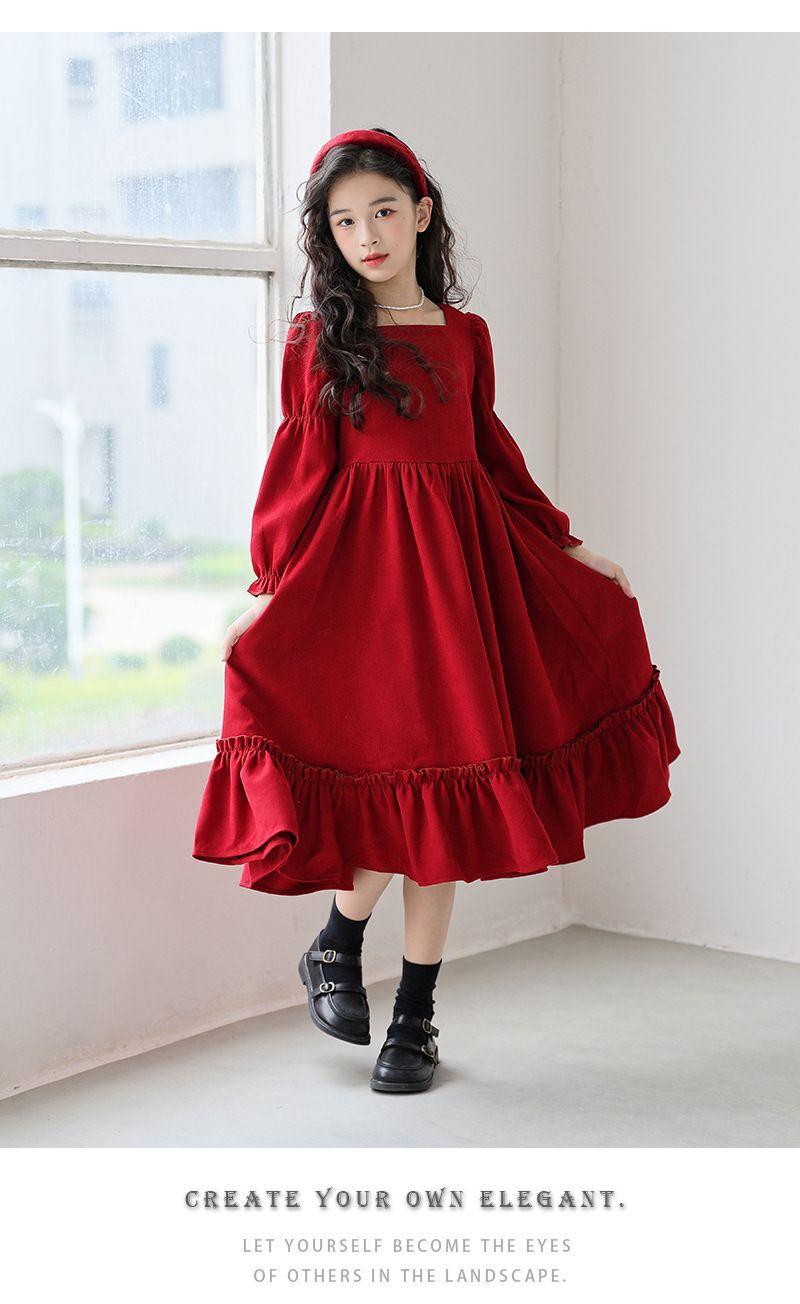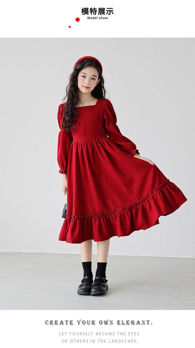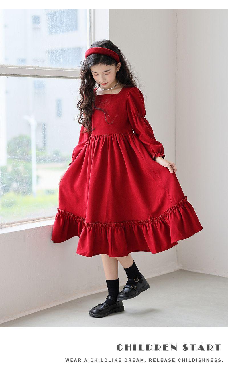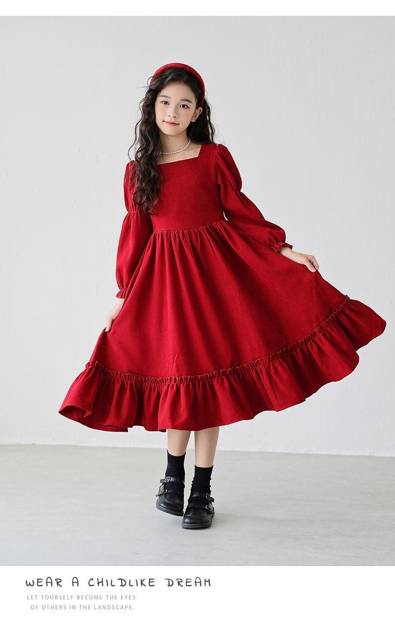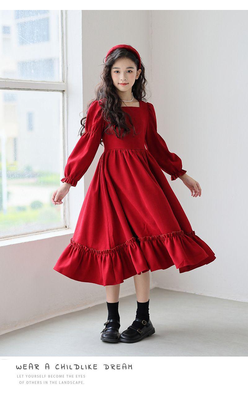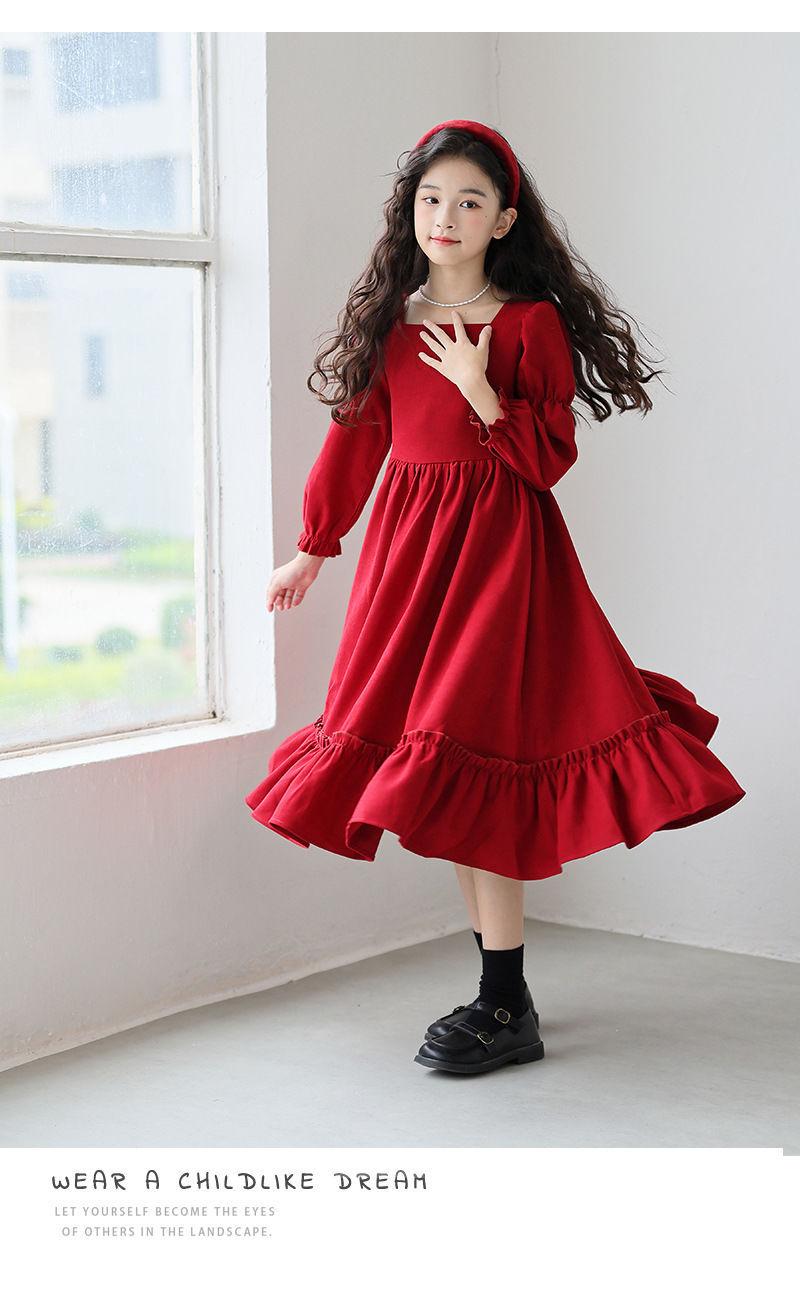 Vestido de manga larga para niña, otoño, nuevo, estilo occidental, grande, cuello cuadrado, rojo, largo, vestido de princesa de moda para niña.