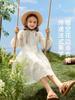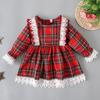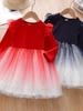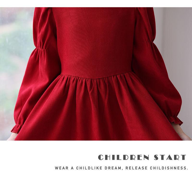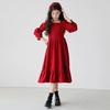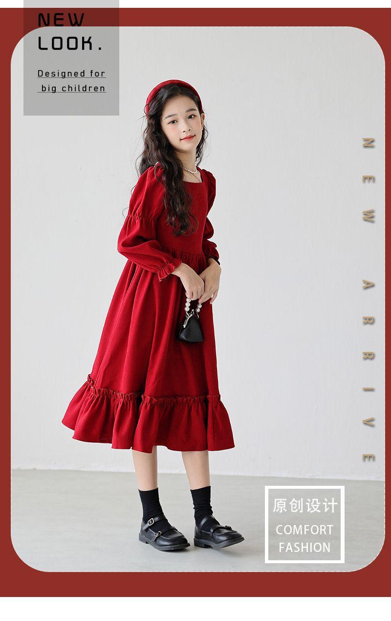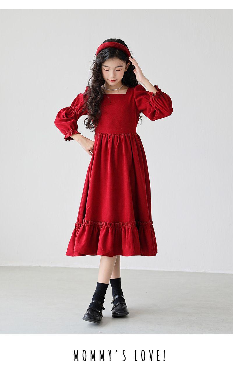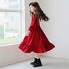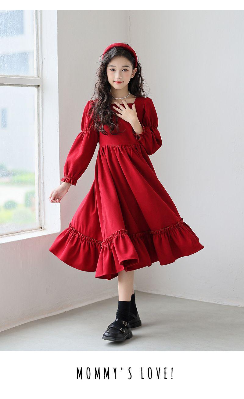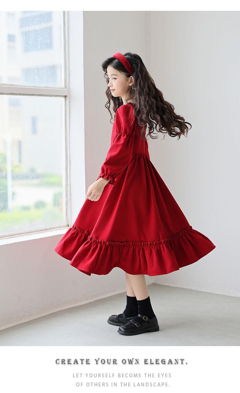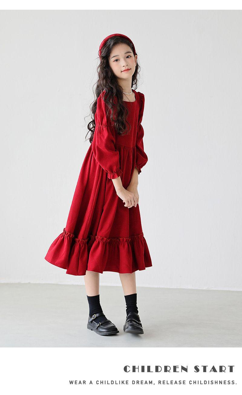 Vestido de manga larga para niña, otoño, nuevo, estilo occidental, grande, cuello cuadrado, rojo, largo, vestido de princesa de moda para niña.