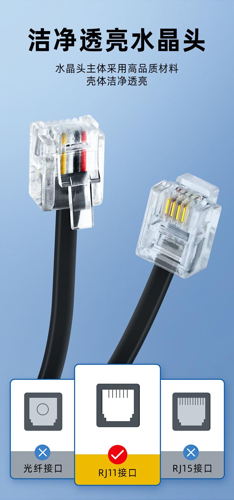 Black 6p2c crystal head telephone cable (white and yellow core wire) 1.5m with 2 cable management buckles