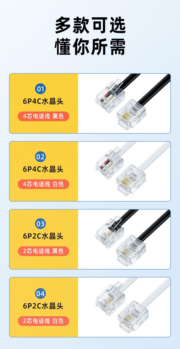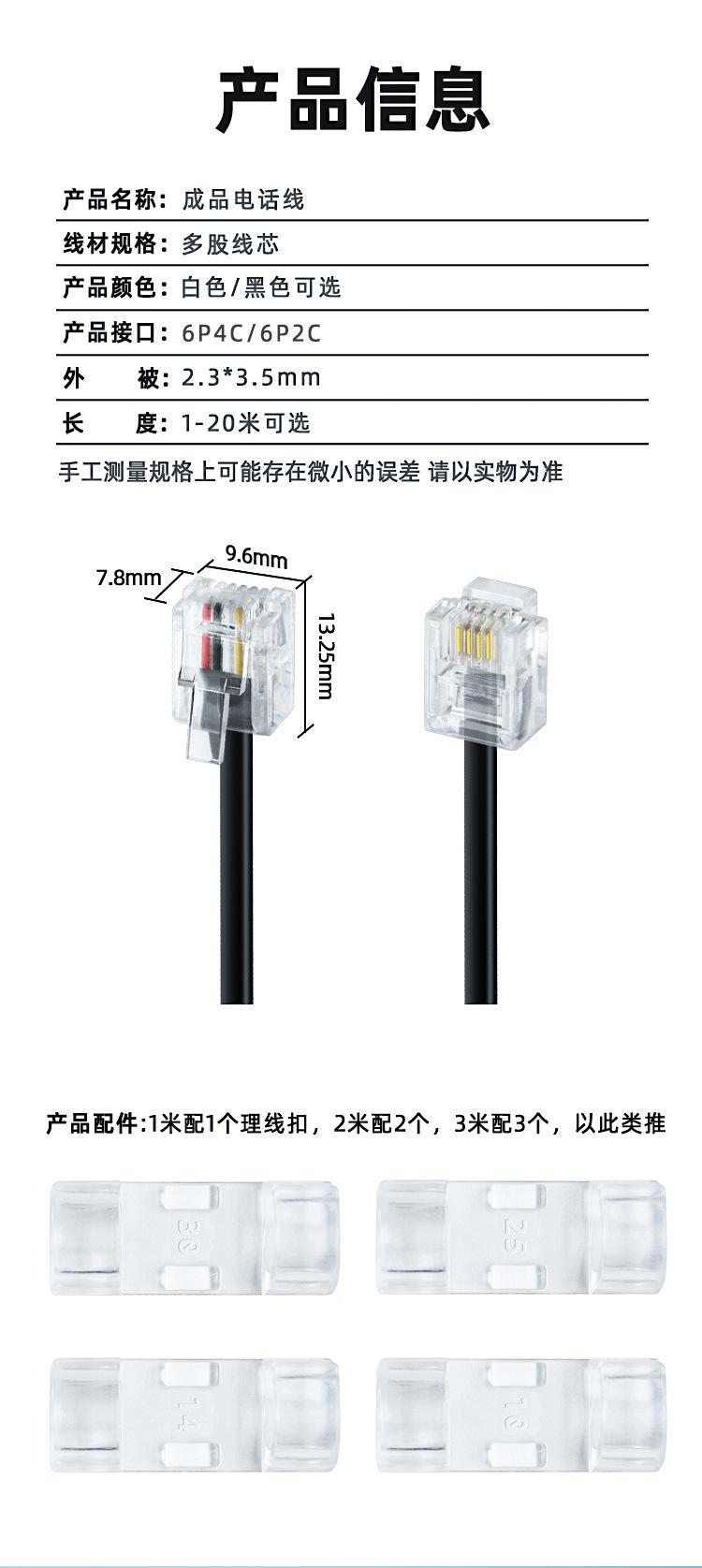 Black 6p2c crystal head telephone cable (white and yellow core wire) 1m with 1 cable management buckle, Black ...