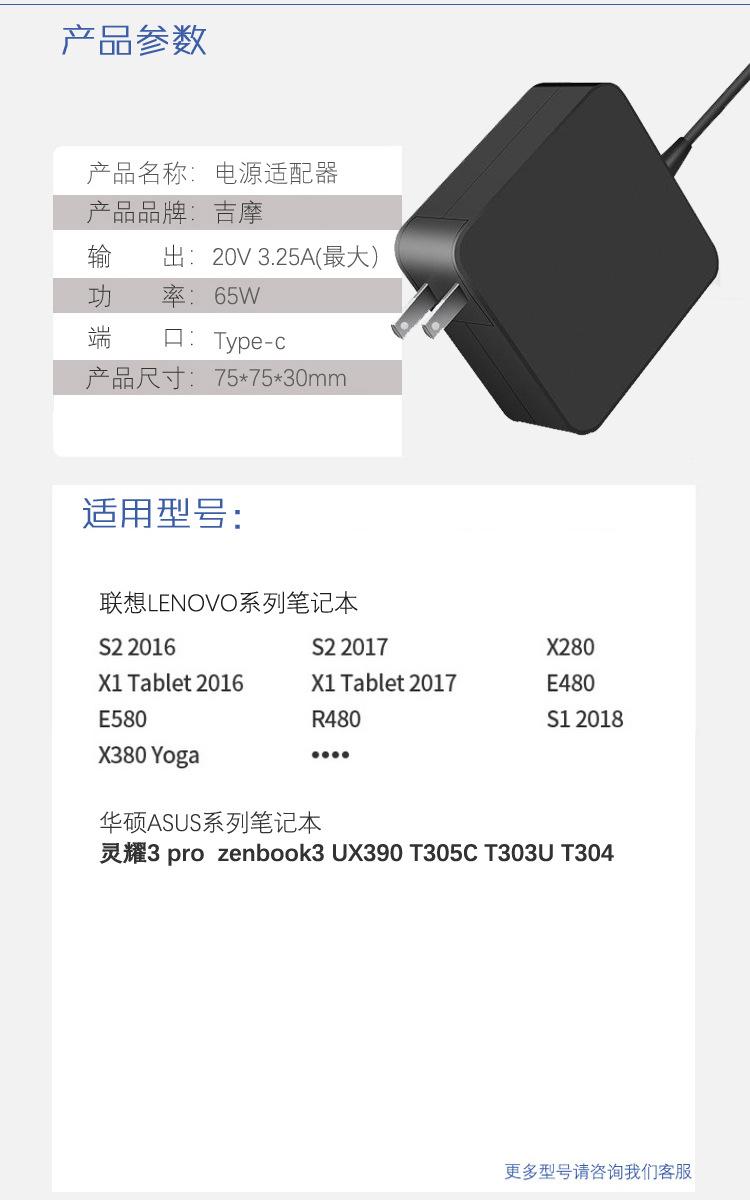 Cargador adaptador de corriente portátil PD65W de 20 V y 3,25 A para portátiles Lenovo, Dell y HP.