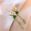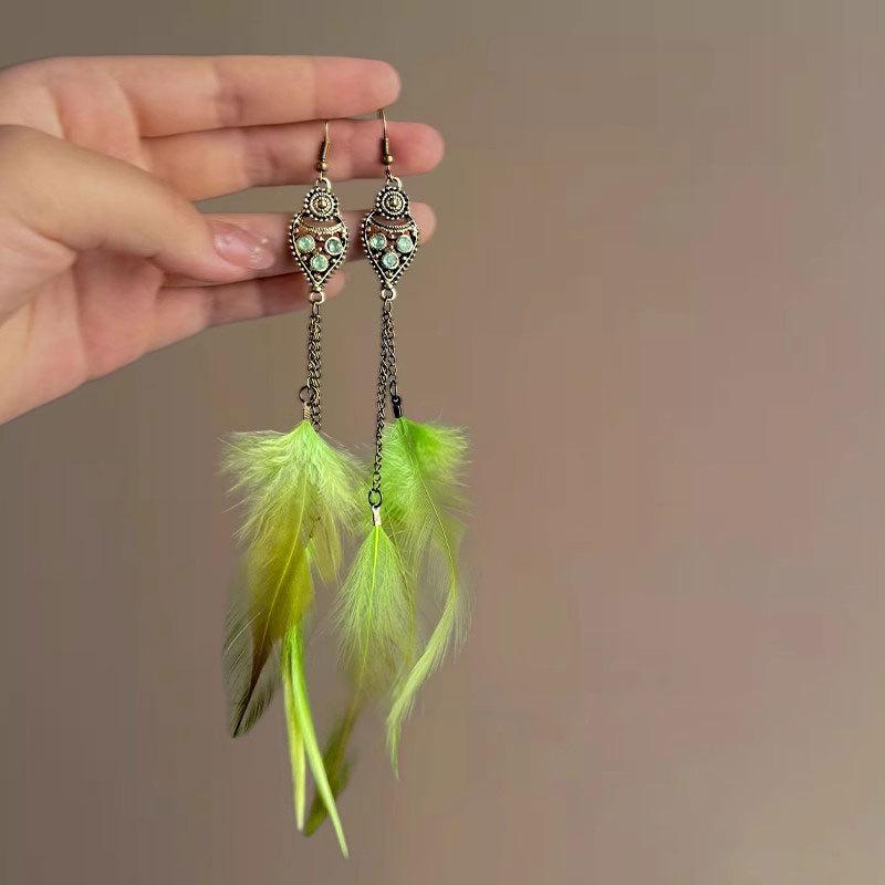 Aretes de plumas verdes de estilo étnico vintage para mujer, temperamento de alta gama de lujo ligero, diseño de aretes de borla, aretes únicos