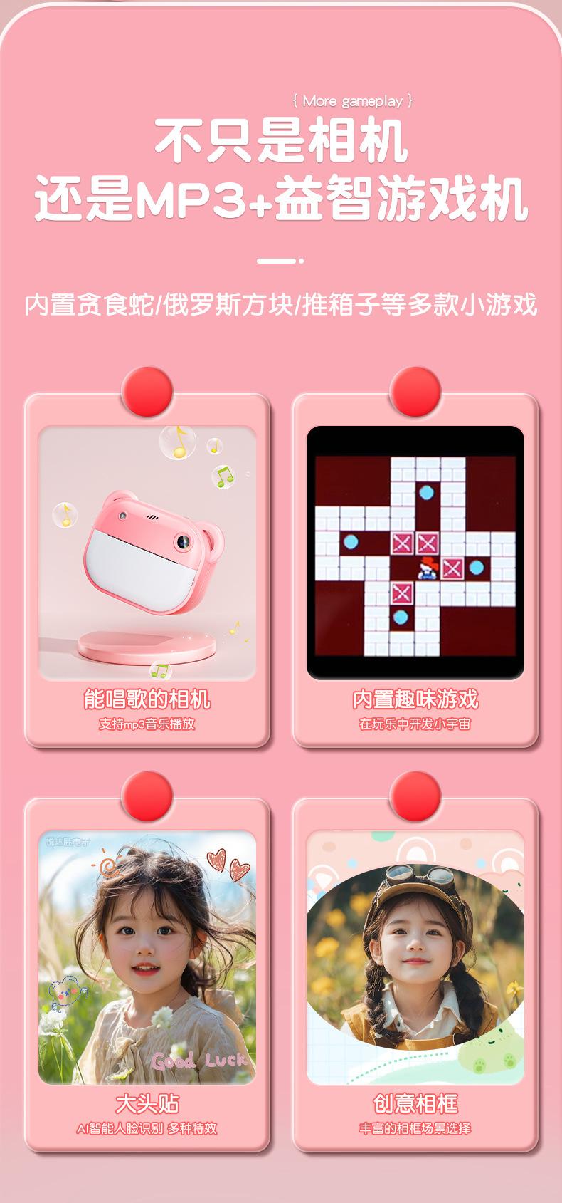 Foto, video, zoom 16x, álbum, fotomatón, ajuste de volumen de filtro, cinco juegos,Función MP3, varios idiomas disponibles. |