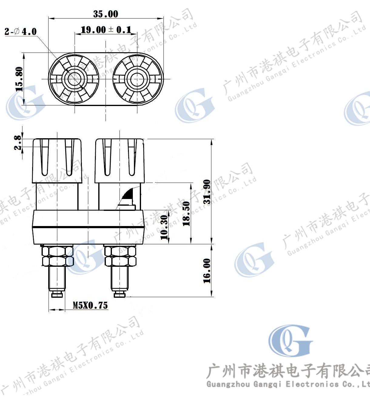 Especificaciones del producto:La superficie es perpendicular al orificio para cable del terminal de 3 mm, el panel abre dos orificios de 12 mm de diámetro, la distancia entre los dos orificios es de 19 mm, la longitud total es de 35 mm, el diámetro del eje del tornillo es de 5 mm, la distancia entre patas19 mm, se puede instalar en paneles de hasta 5 mm.