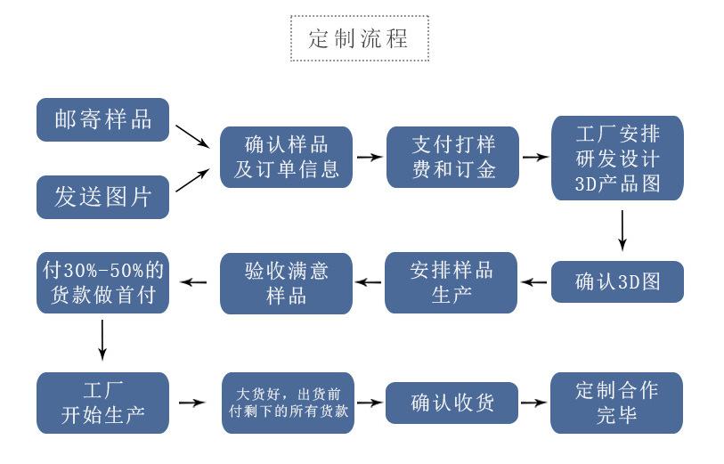 Nos dedicamos principalmente a la producción OEM para nuestros clientes. Puede proporcionarnos imágenes y objetos físicos, y produciremos según sus requisitos. Primero fabricaremos una muestra según sus requisitos y, tras confirmar el proceso, comenzaremos la producción en masa. Generalmente, tras confirmar la muestra, el envío se realiza en un plazo de diez días a un mes. El plazo de entrega específico depende del calendario de pedidos de nuestra fábrica, la cantidad de sus productos, si se trata de un producto no convencional y otros factores. Le informaremos del plazo de entrega específico al comunicarnos con usted.