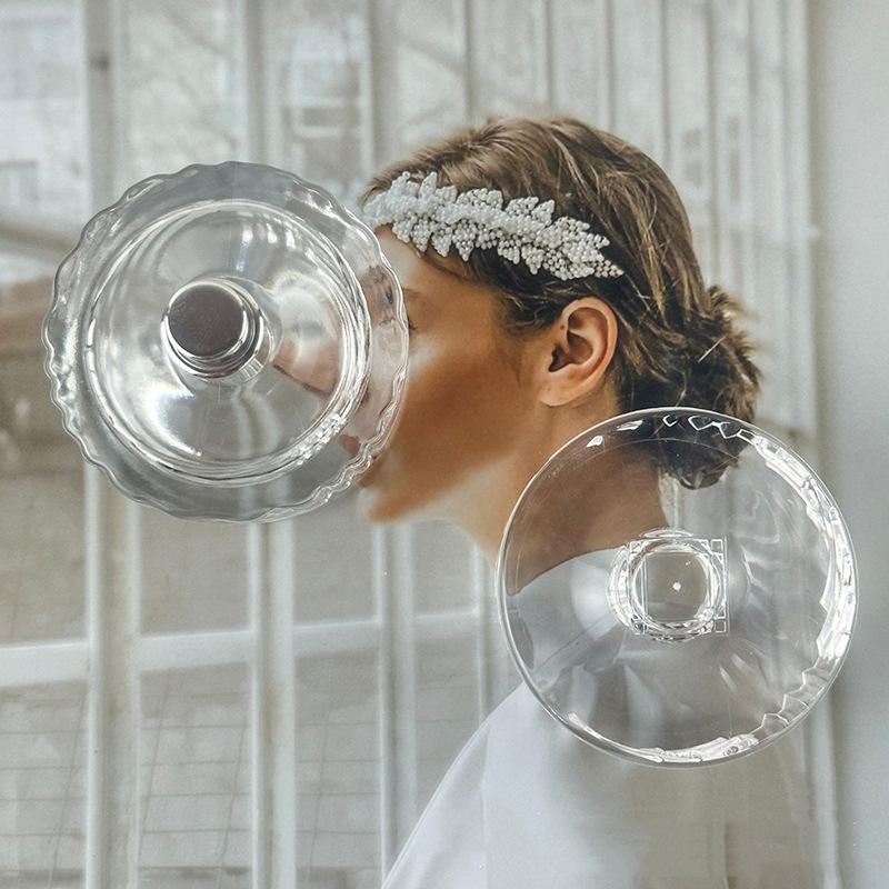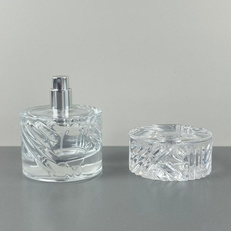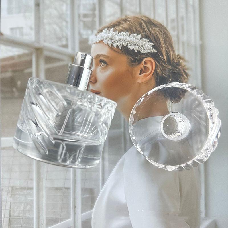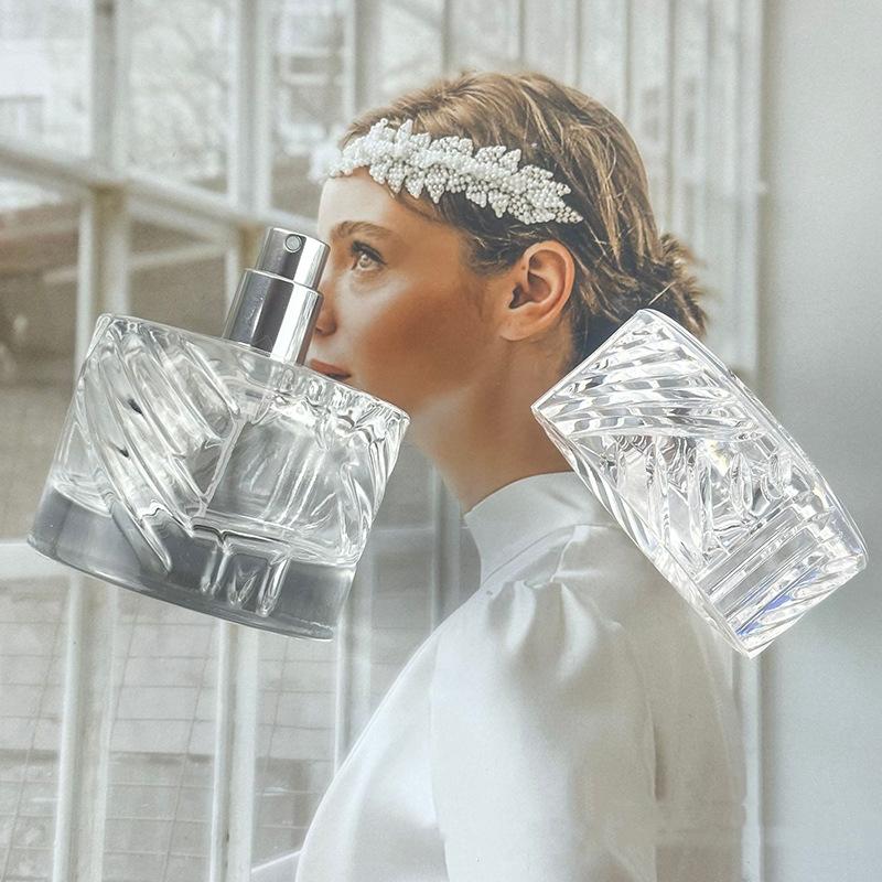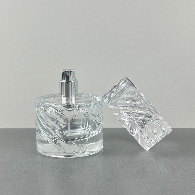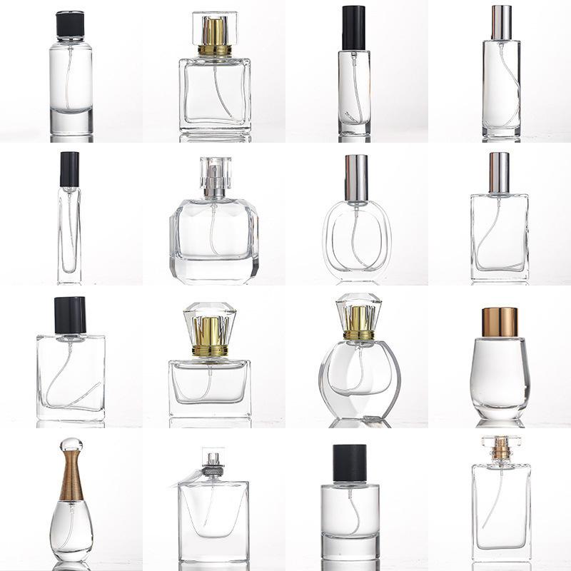 Botella de perfume de alta calidad, sencilla, de 50 ml, transparente, con pulverizador a presión, de vidrio engrosado.
