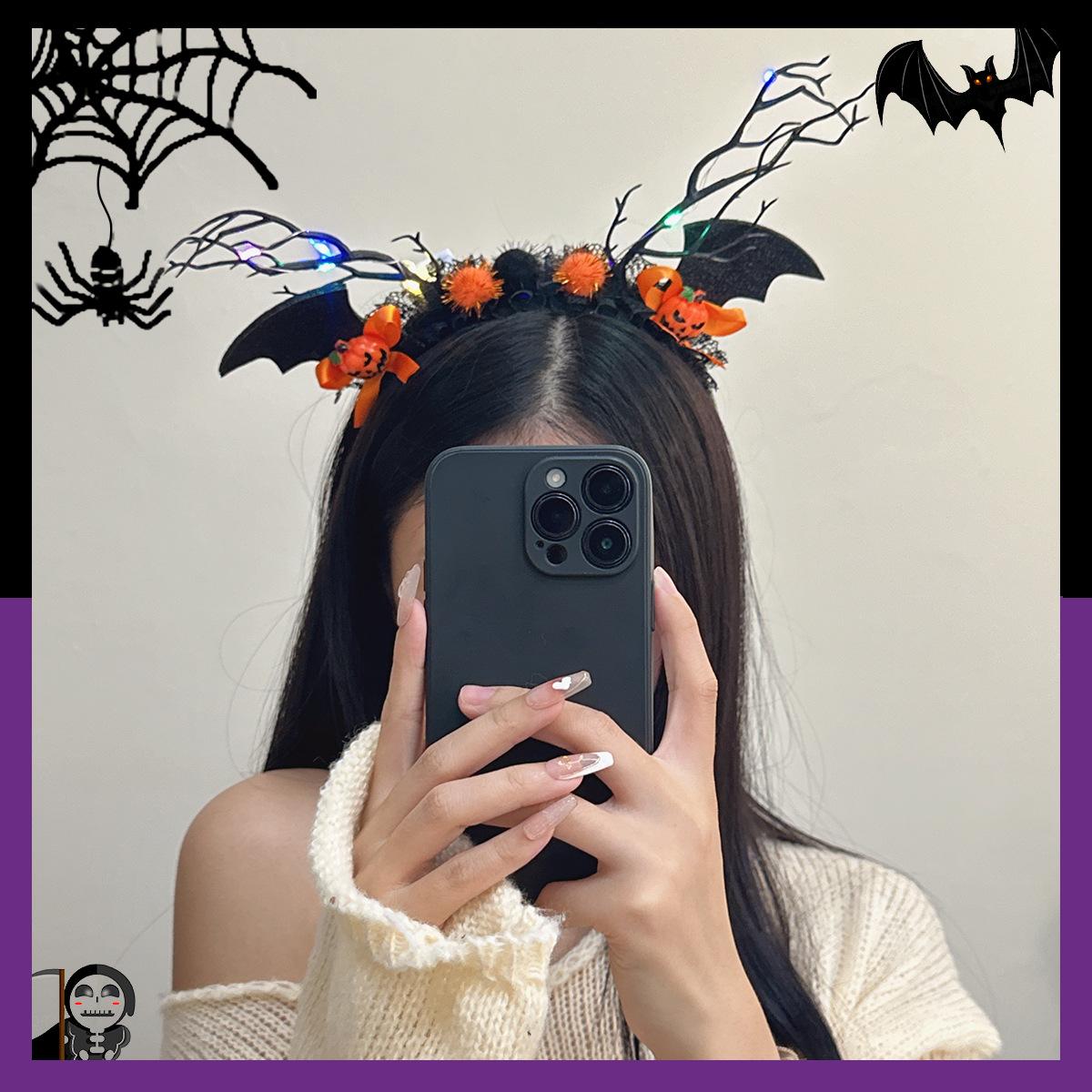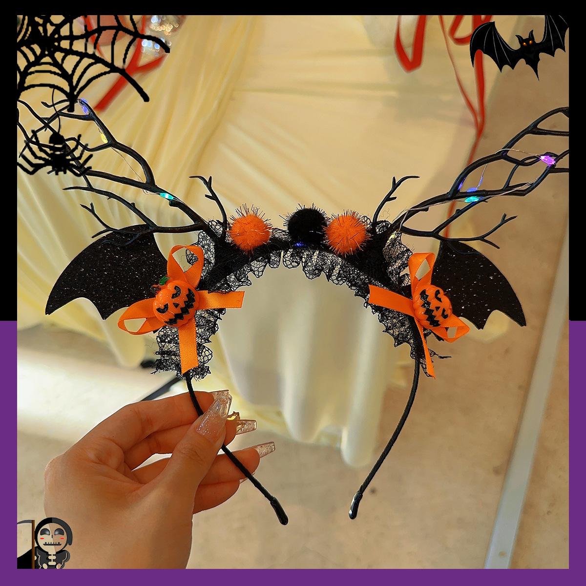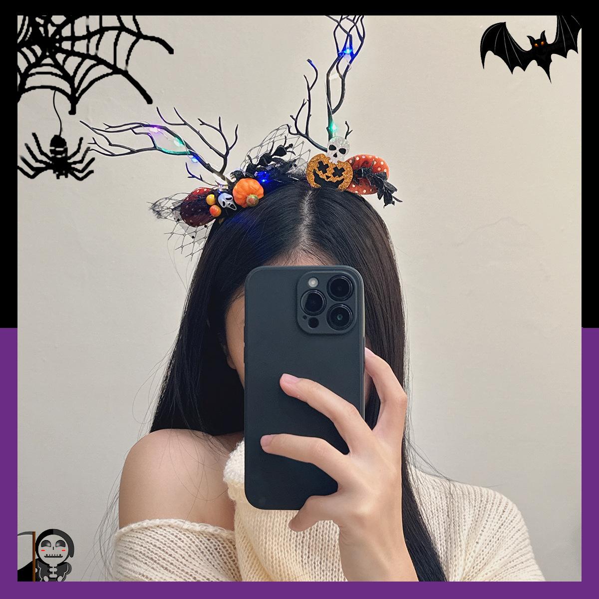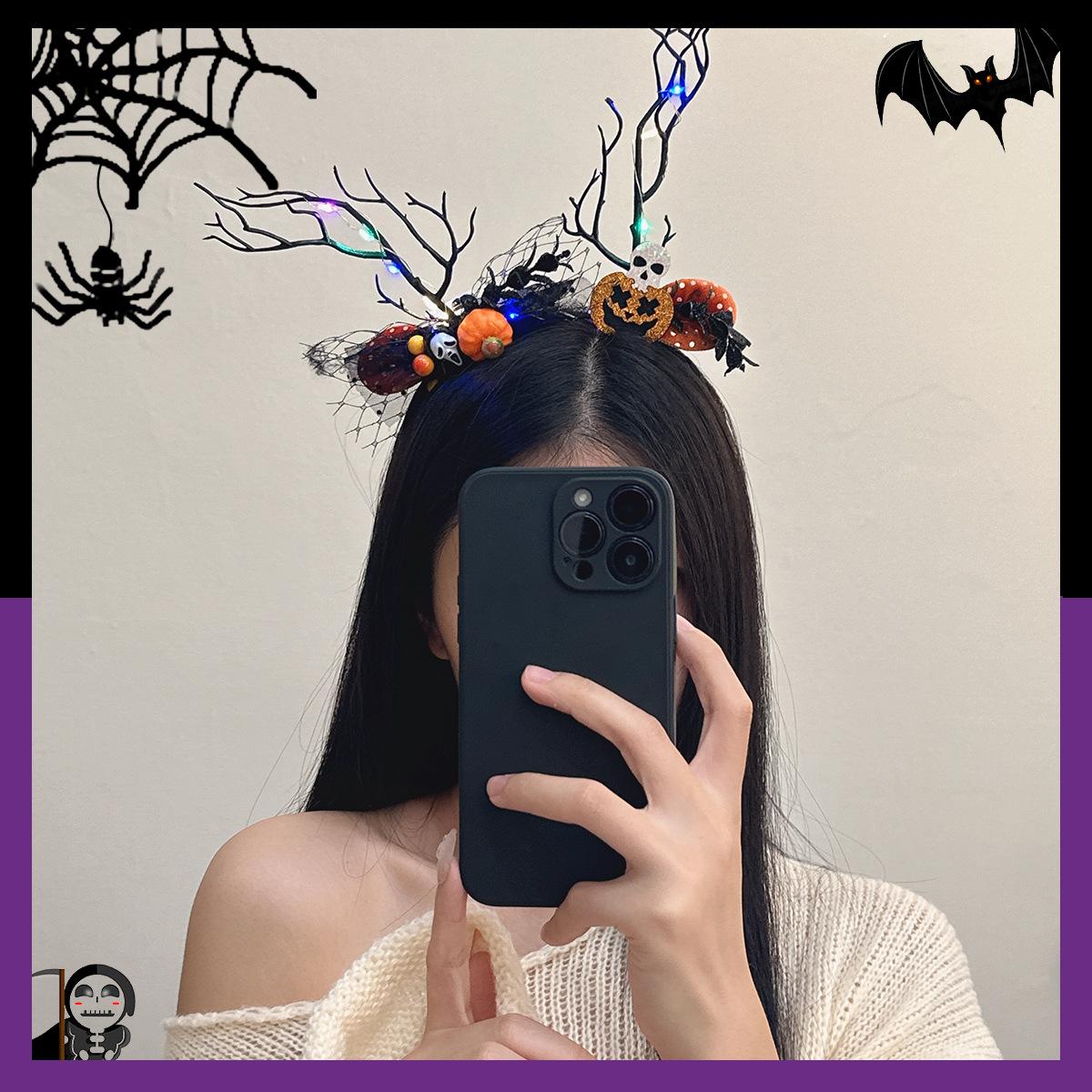 Diadema luminosa de astas de calabaza para Halloween, accesorios para fotos divertidos, diadema para el cabello, adornos para tarjetas para el cabello