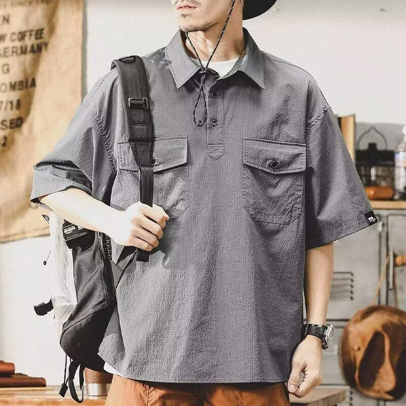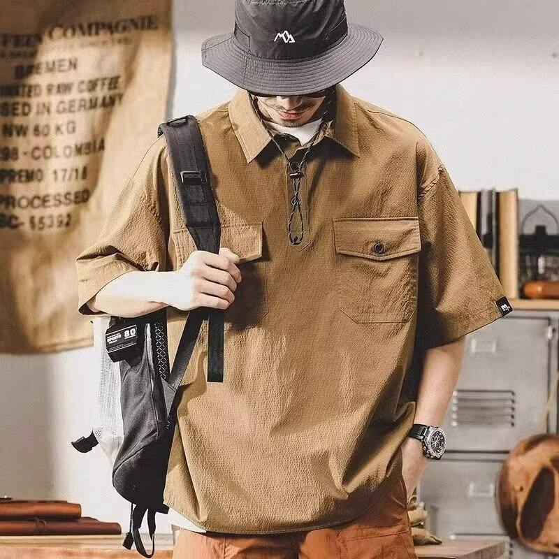 Camisa tipo polo estilo americano estilo retro para hombre, de manga corta, de seda fina de hielo, con solapa suelta y media manga.