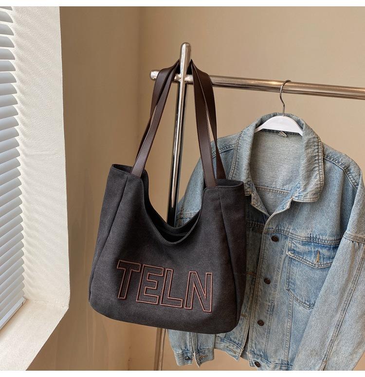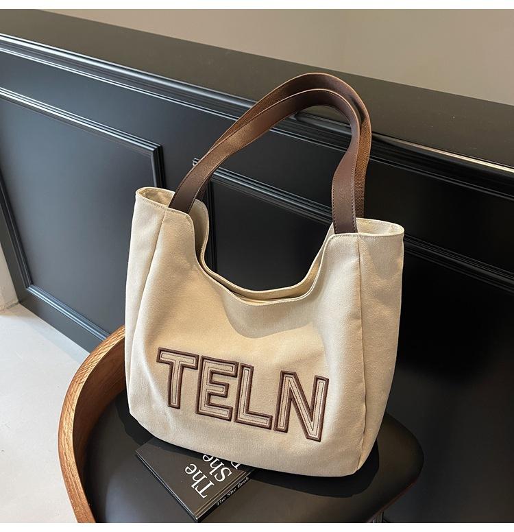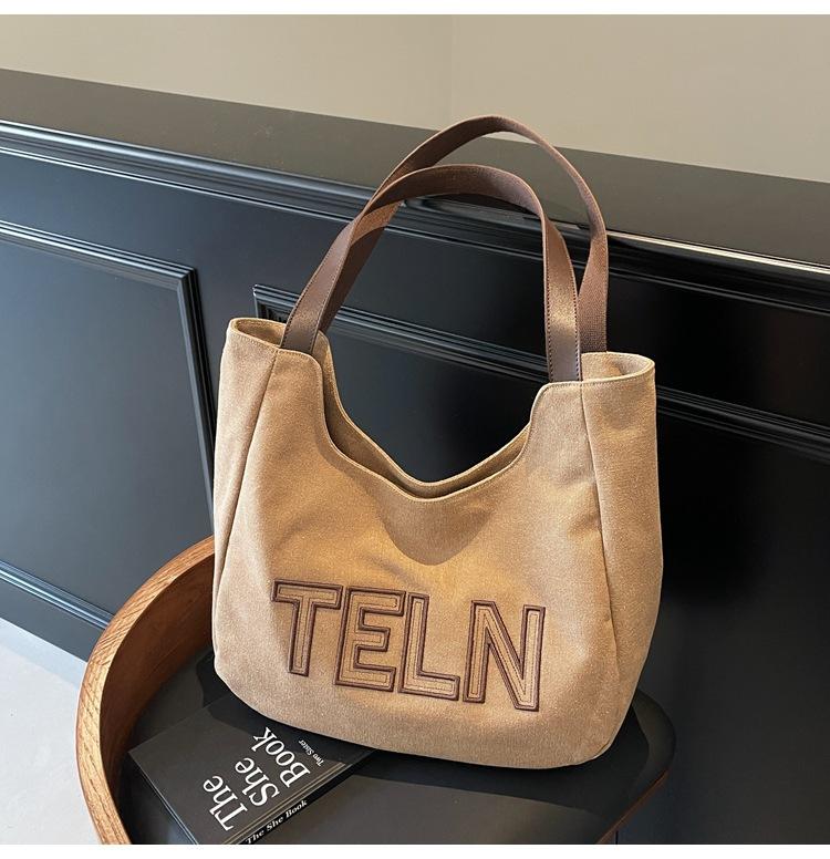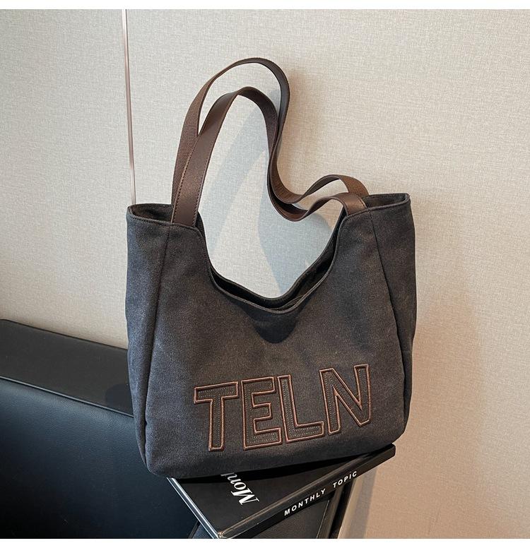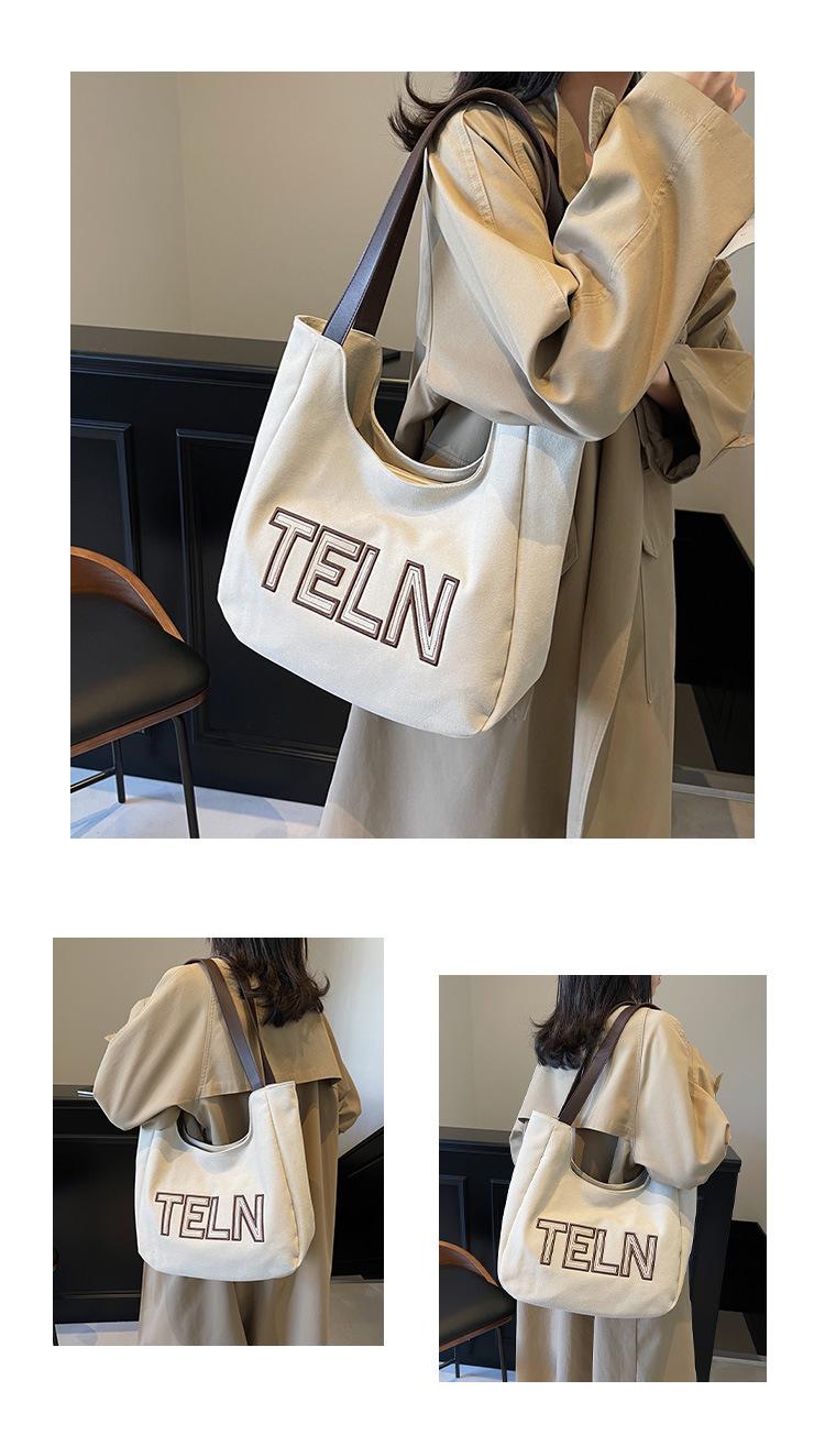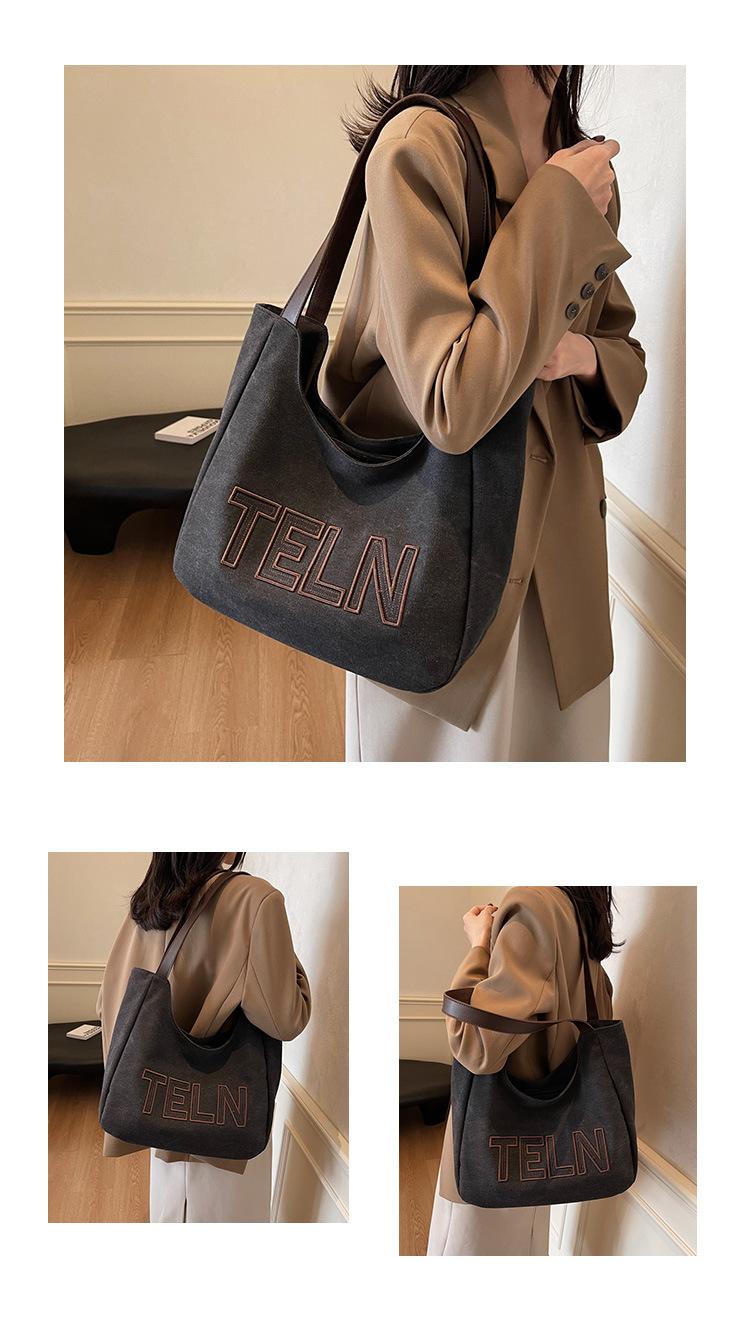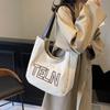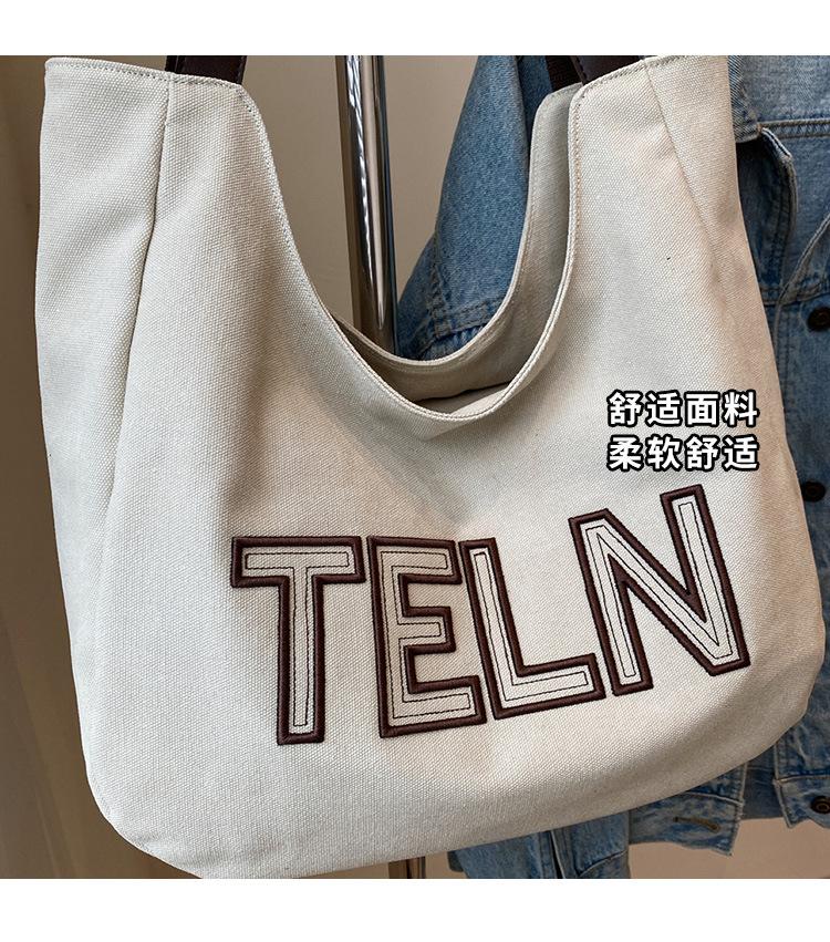 Bolso de mano de gran capacidad con letras bordadas en estéreo, bolso de lona, nuevo bolso de hombro portátil, informal, retro, de color sólido, 2025