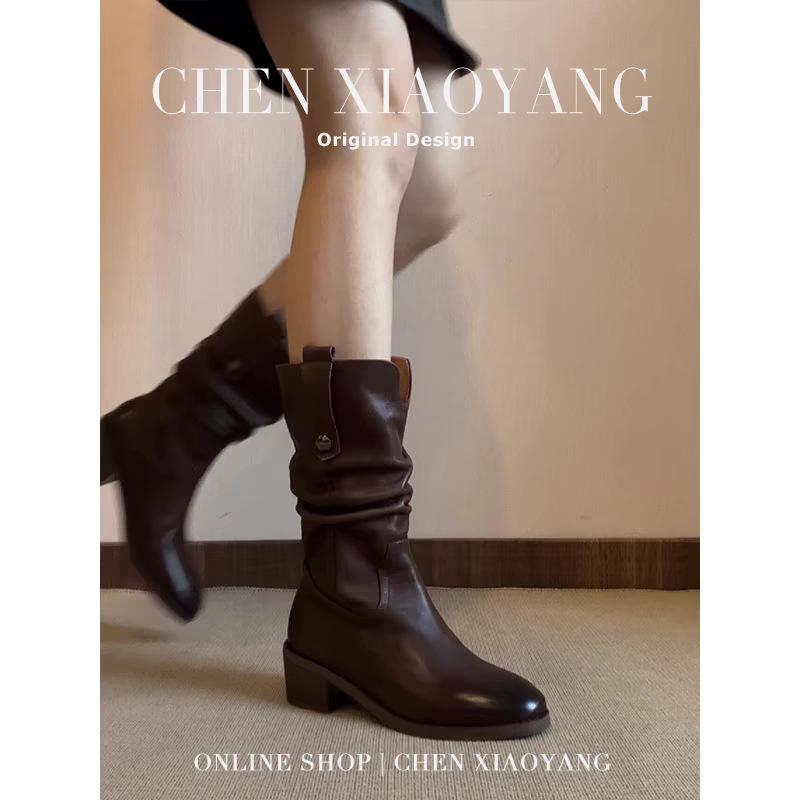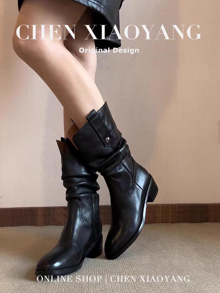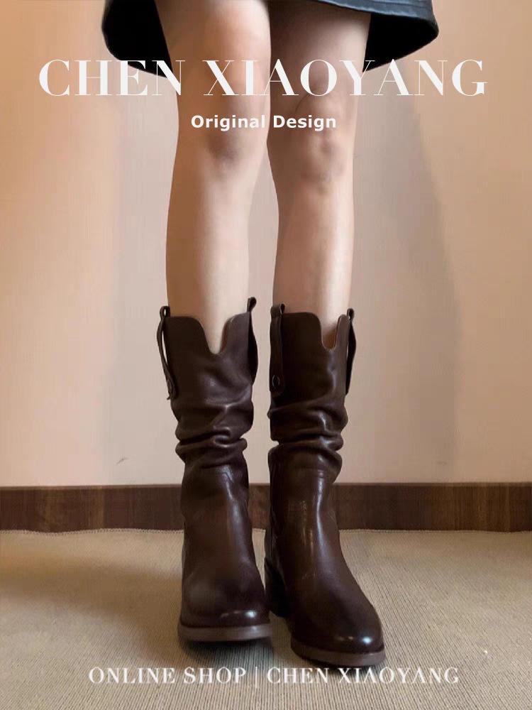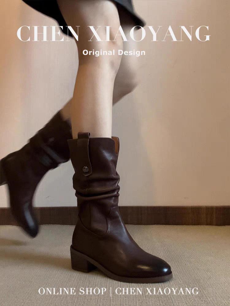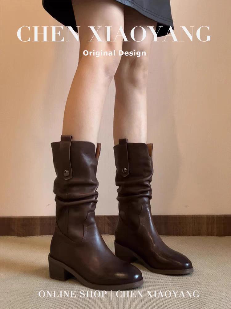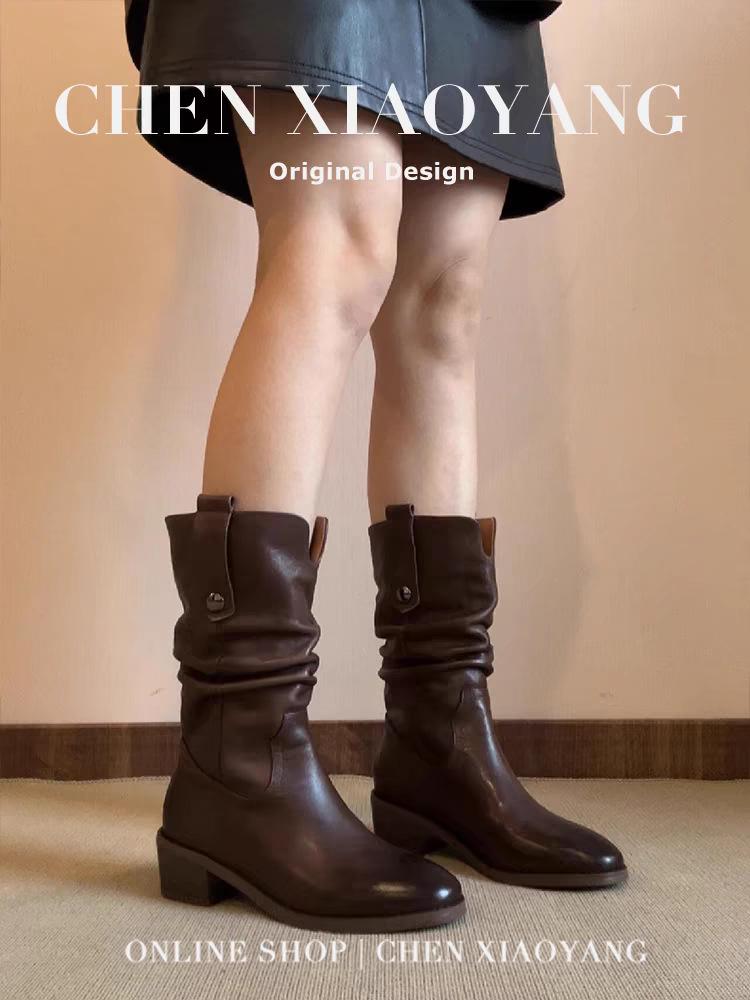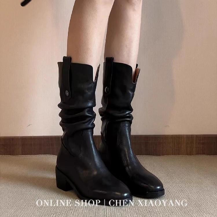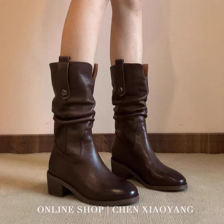 Botas vaqueras marrones de cuero genuino para mujer, nuevas botas de caballero de tacón medio, botas apiladas, botas Martin de caña media de moda para mujer