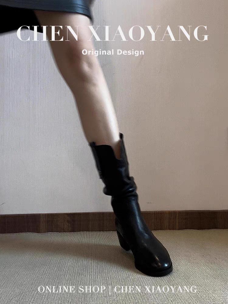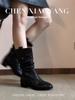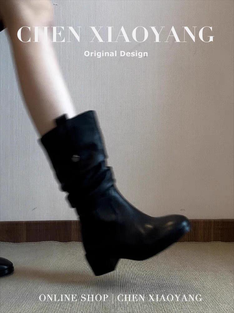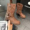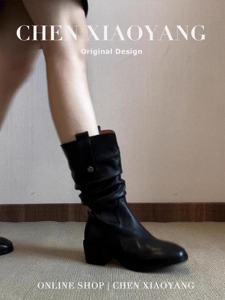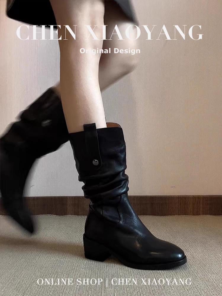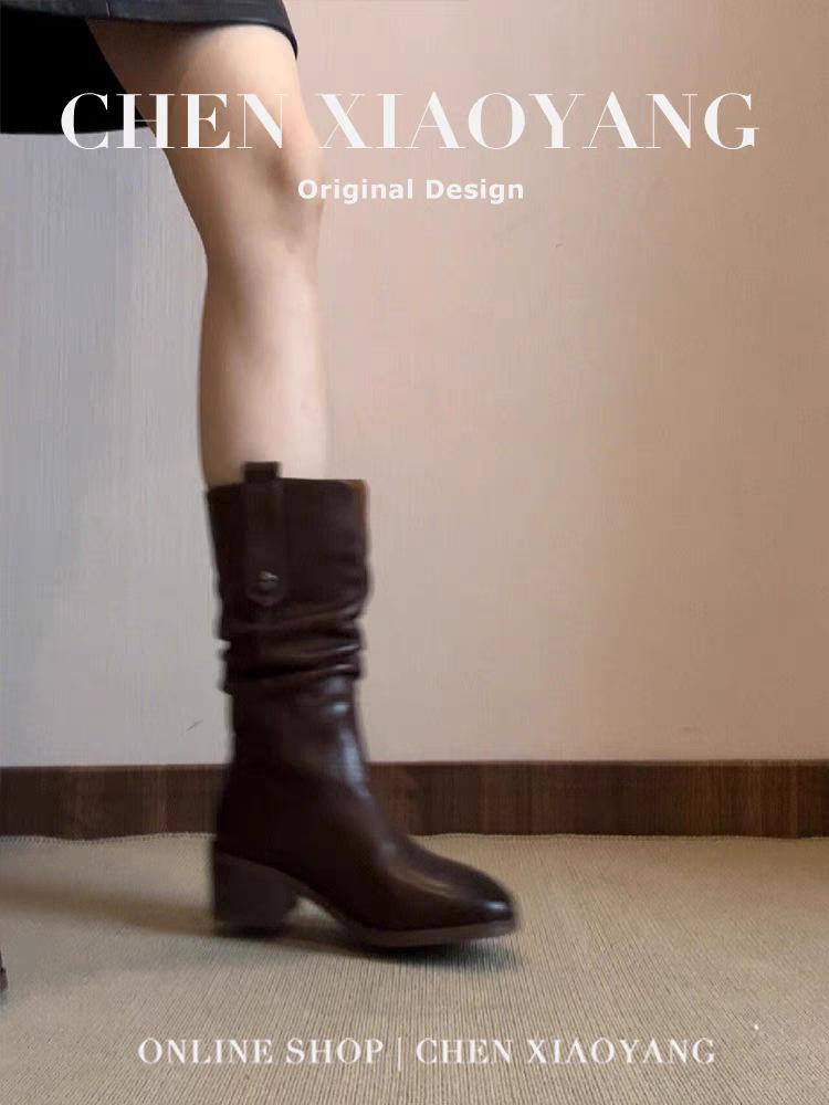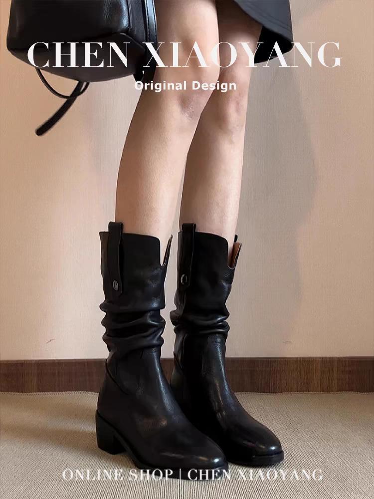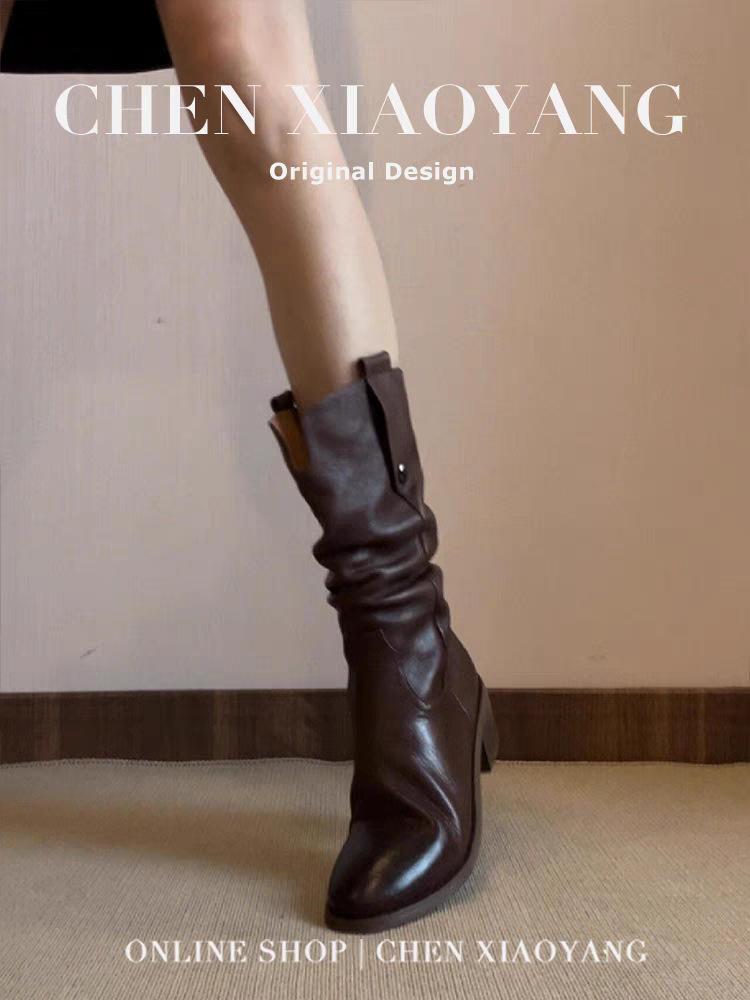 Botas vaqueras marrones de cuero genuino para mujer, nuevas botas de caballero de tacón medio, botas apiladas, botas Martin de caña media de moda para mujer