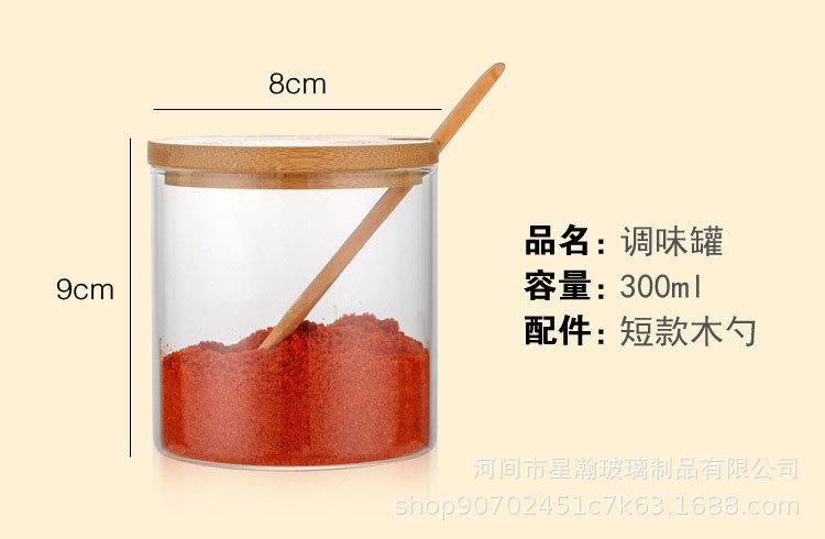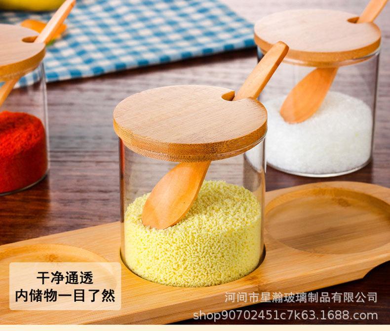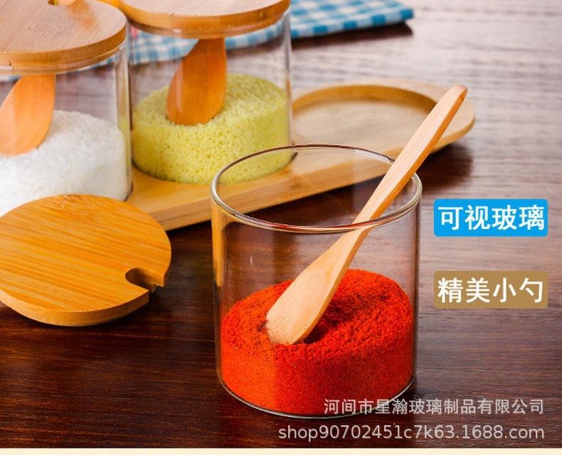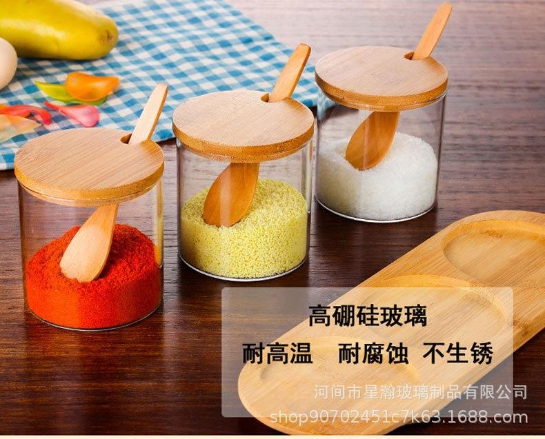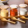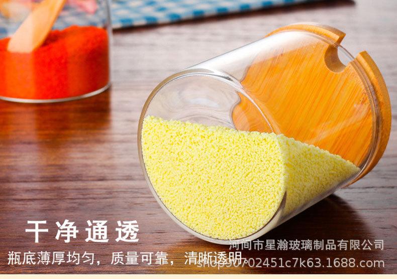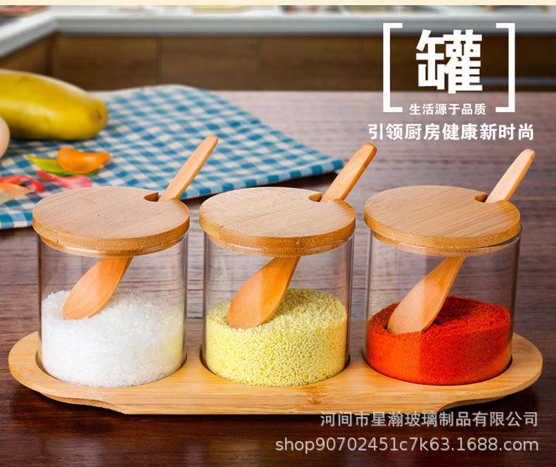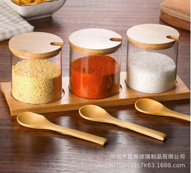 Tarro de condimento de vidrio de borosilicato de alta calidad, tarro de almacenamiento transparente con cuchara, tapa de bambú, tarro de almacenamiento sellado de tres piezas para el hogar de alto valor de color