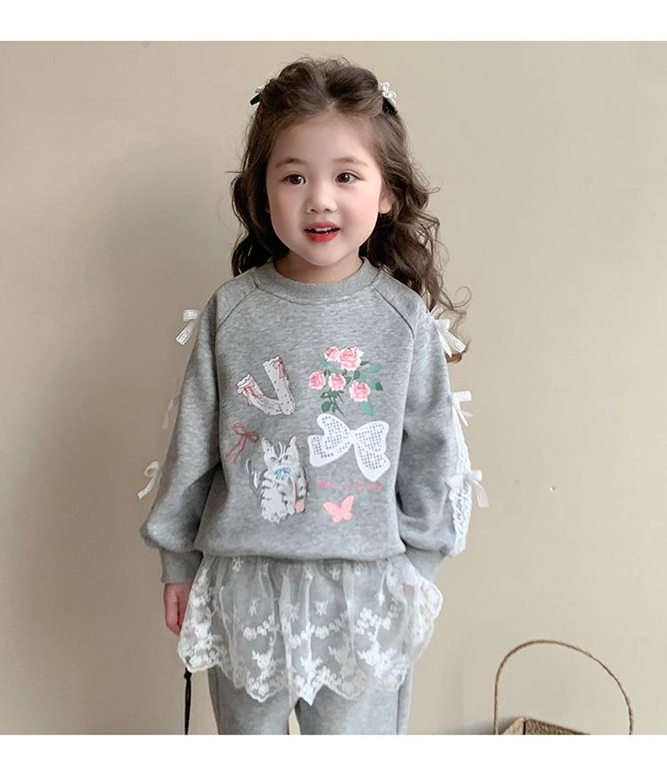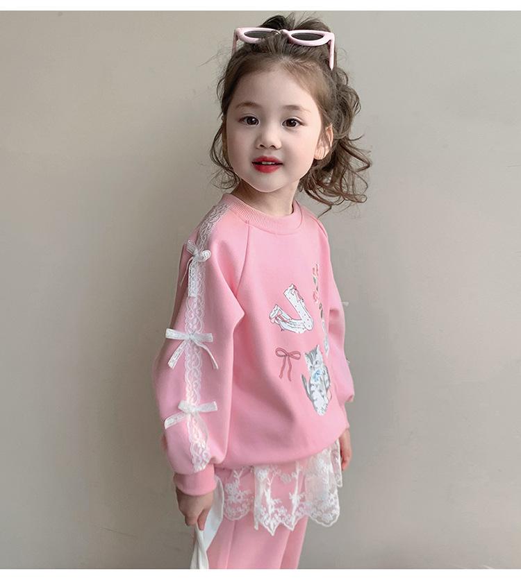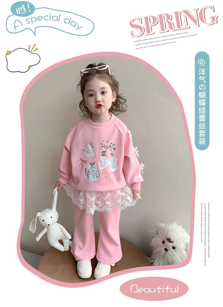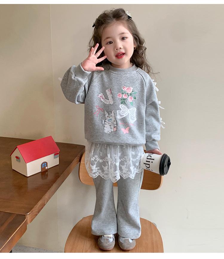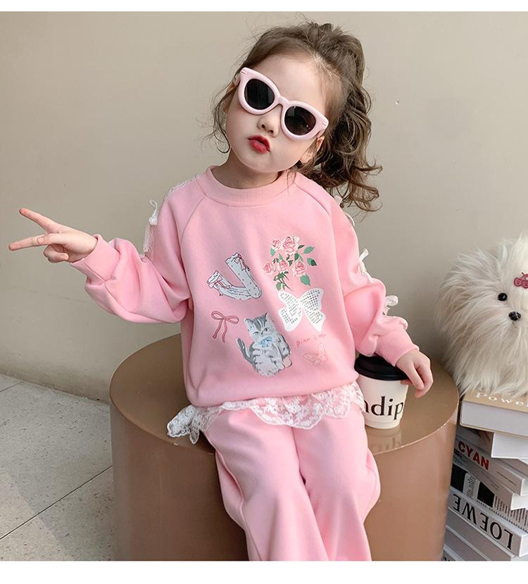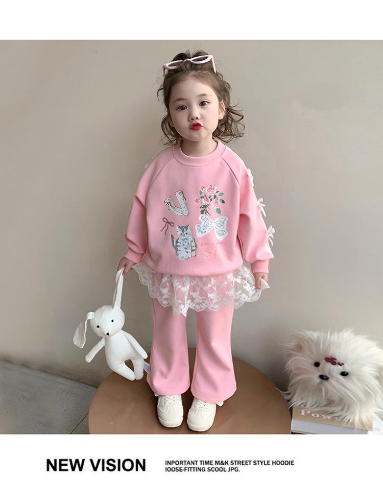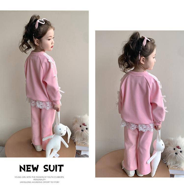 Traje de encaje con lazo para niñas, primavera y otoño de 2025, nueva moda, ropa deportiva informal de dos piezas para niñas pequeñas.