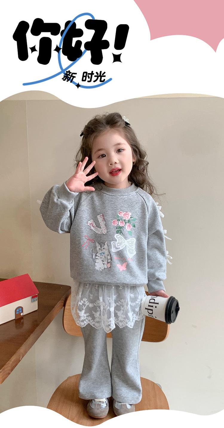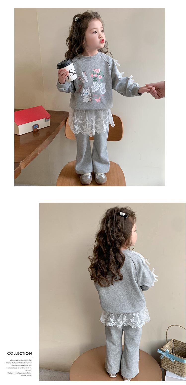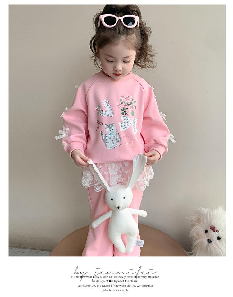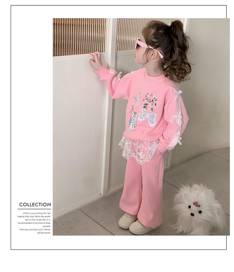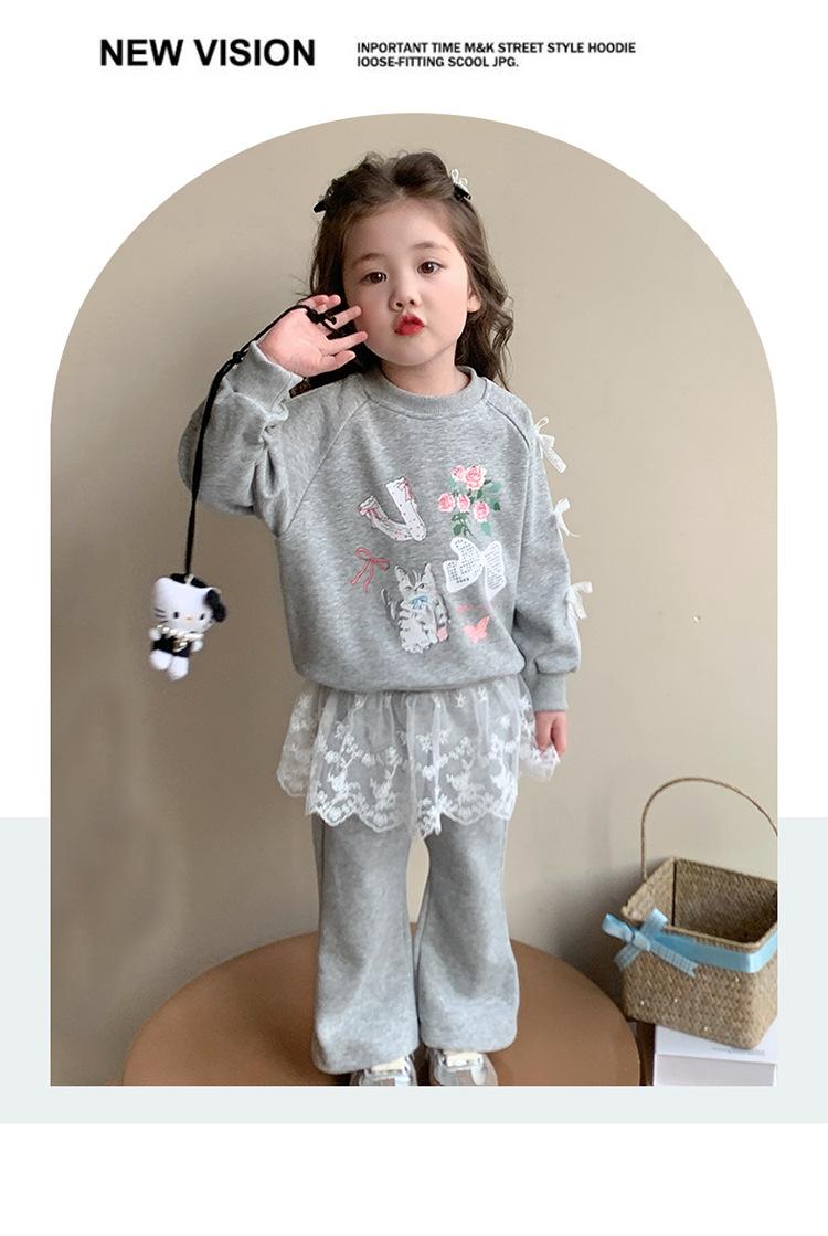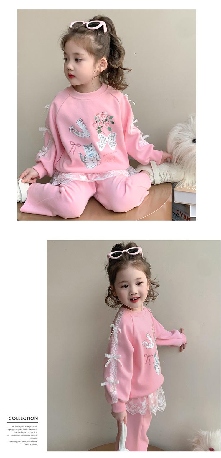 Traje de encaje con lazo para niñas, primavera y otoño de 2025, nueva moda, ropa deportiva informal de dos piezas para niñas pequeñas.