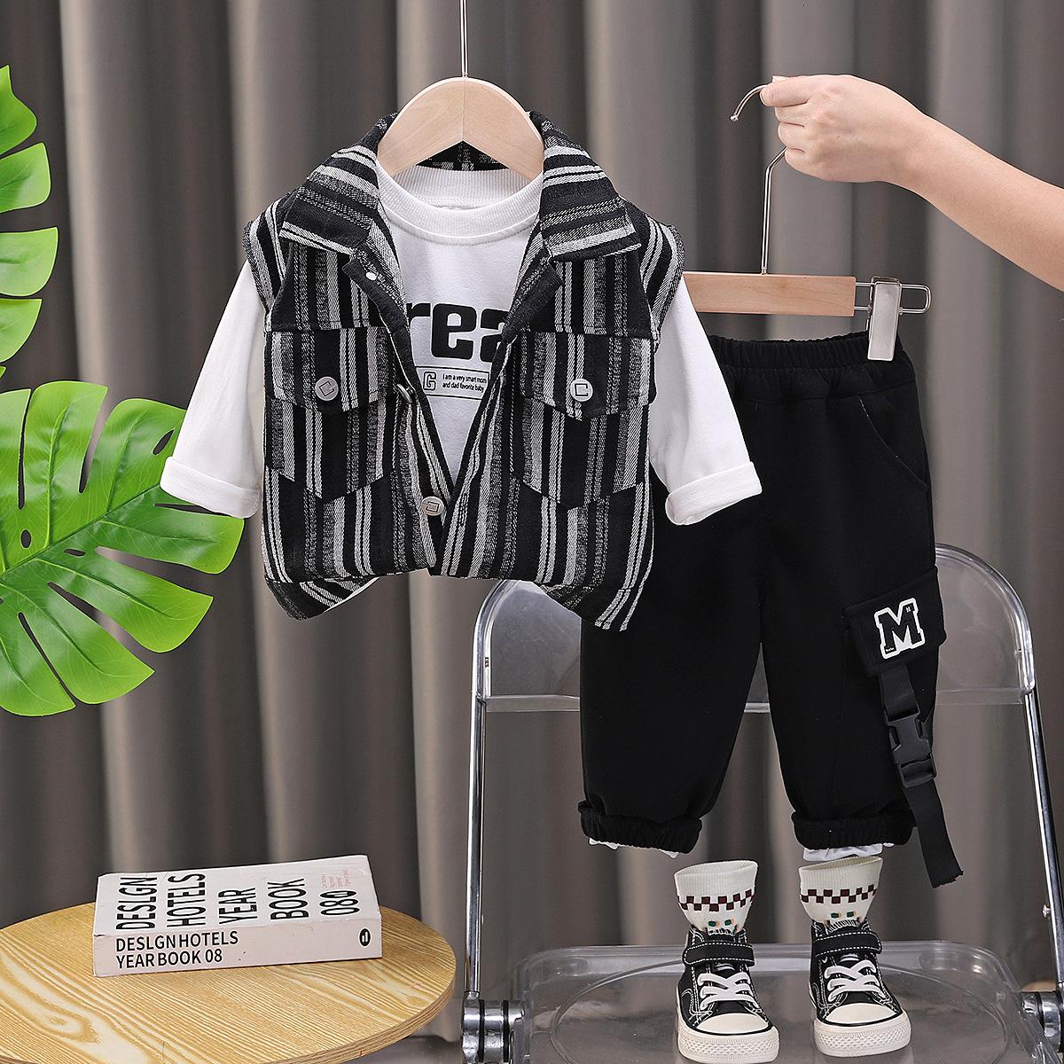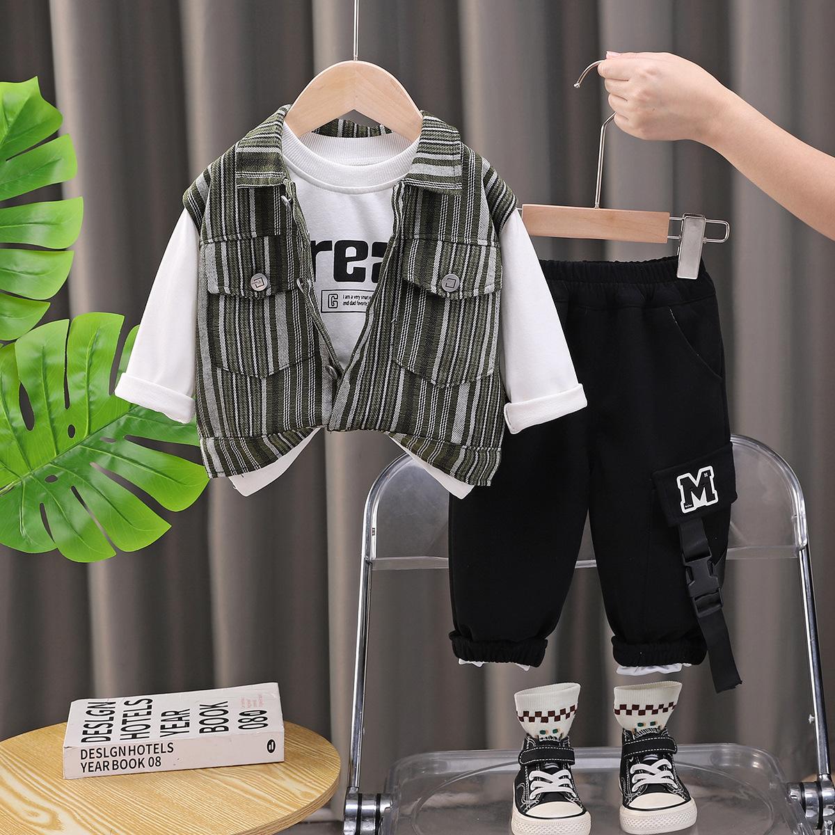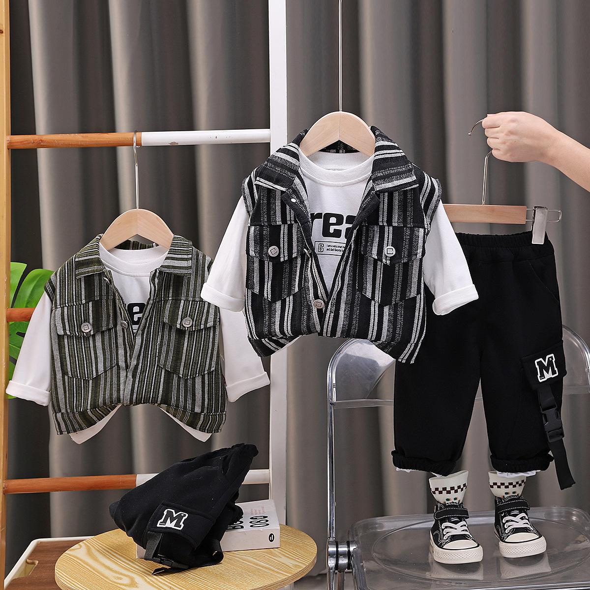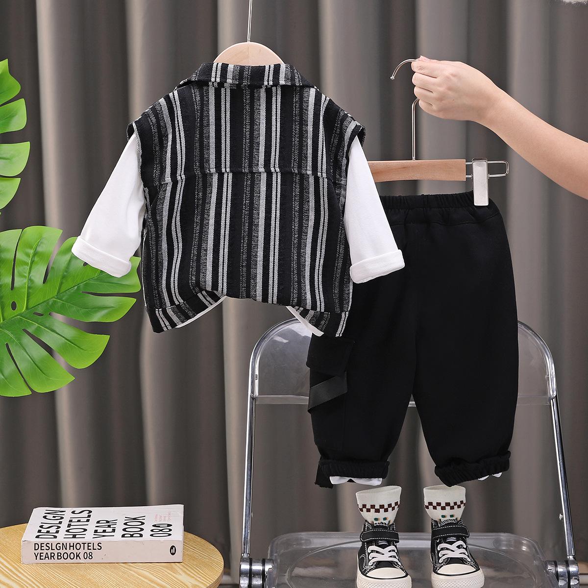Traje de Otoño para Niño 2025 Nuevo Chaleco Rayado para Niños Top Chaqueta Guapa Combinable Set de Tres Piezas