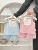 Traje de bebé de estilo occidental de verano para niñas, nuevo conjunto de dos piezas de pantalones cortos de manga corta con encaje de conejo para verano 2025