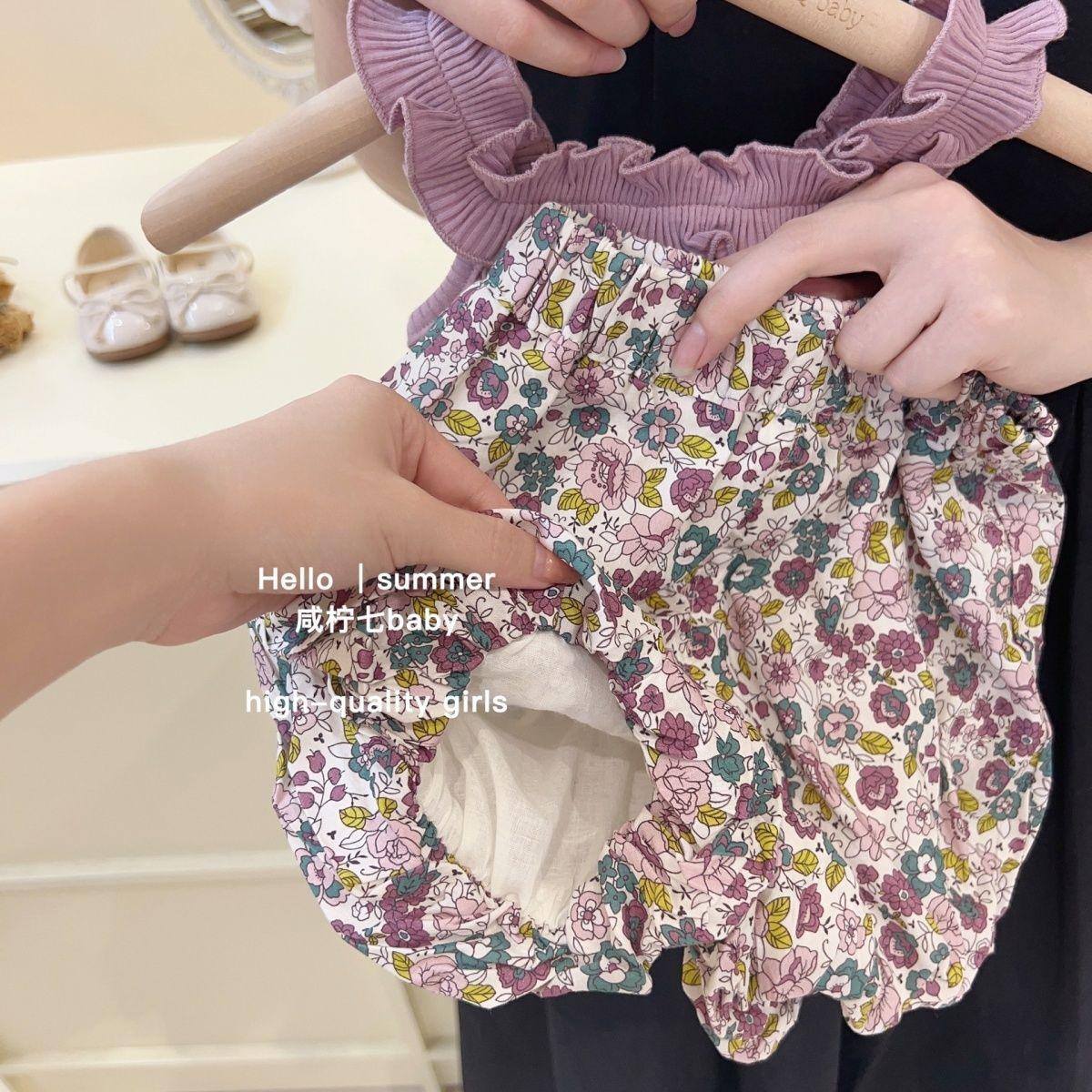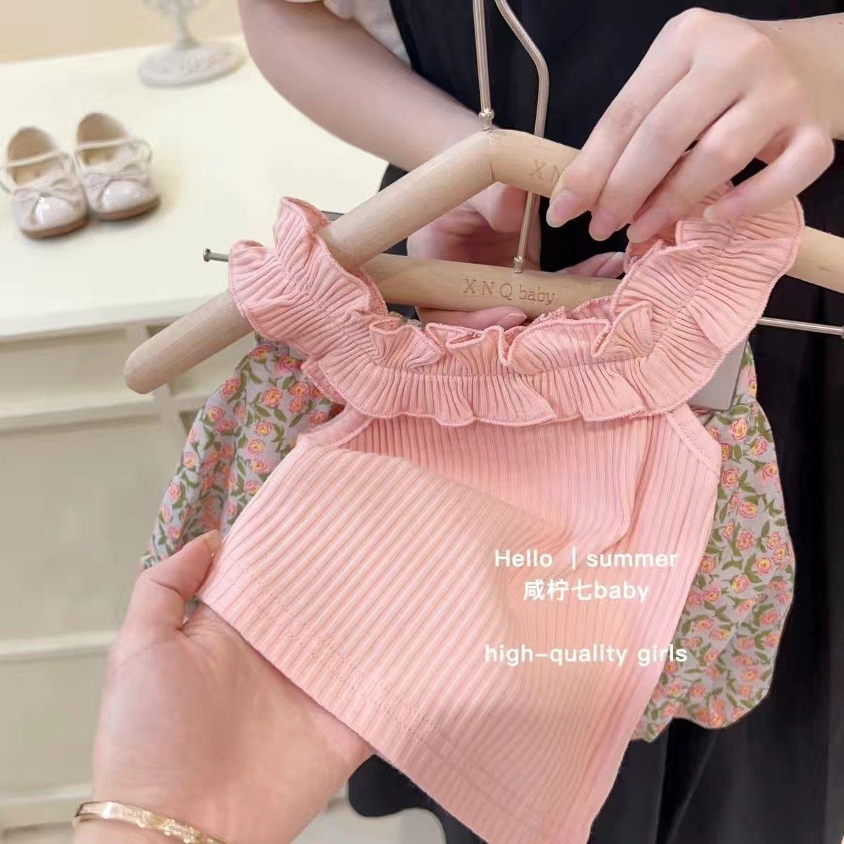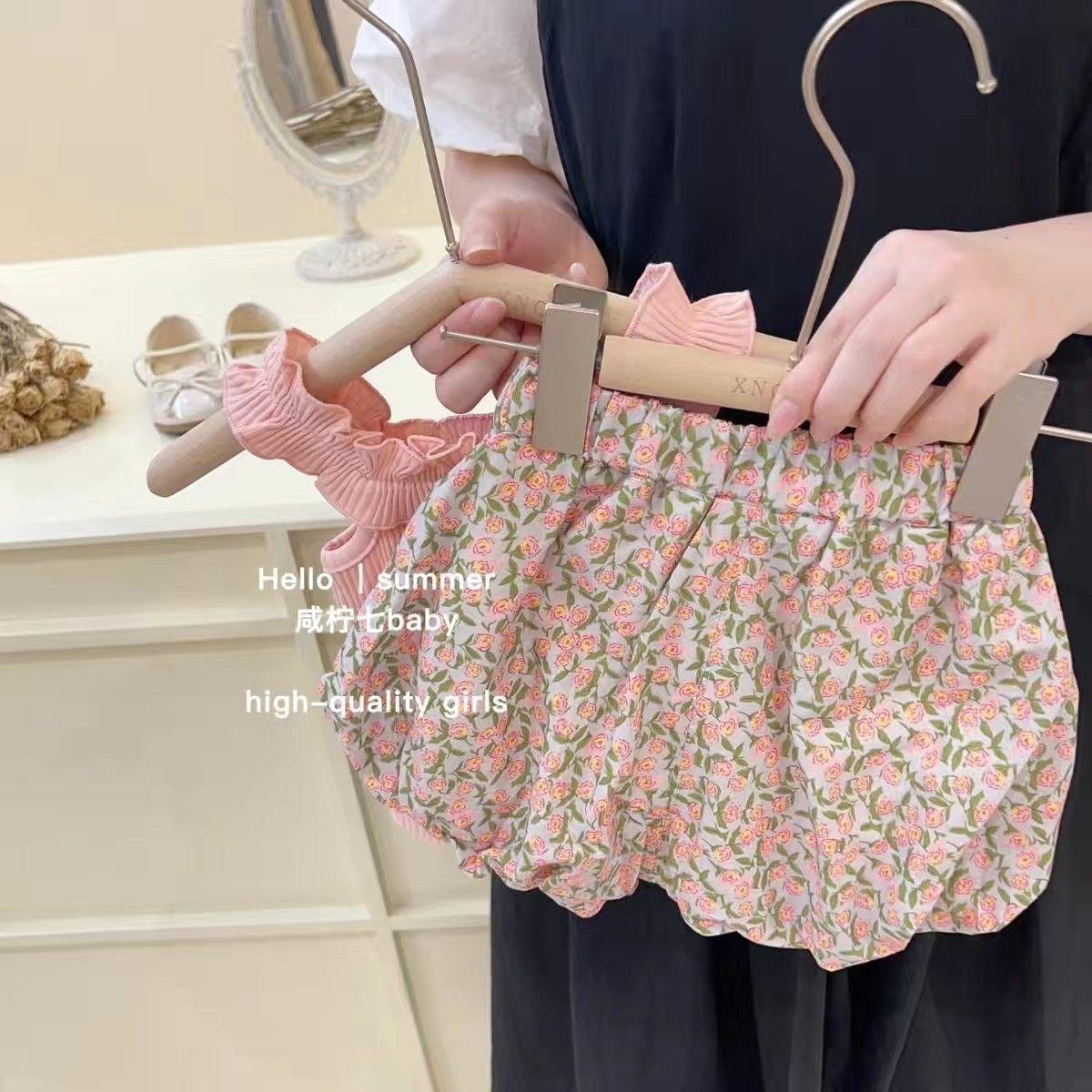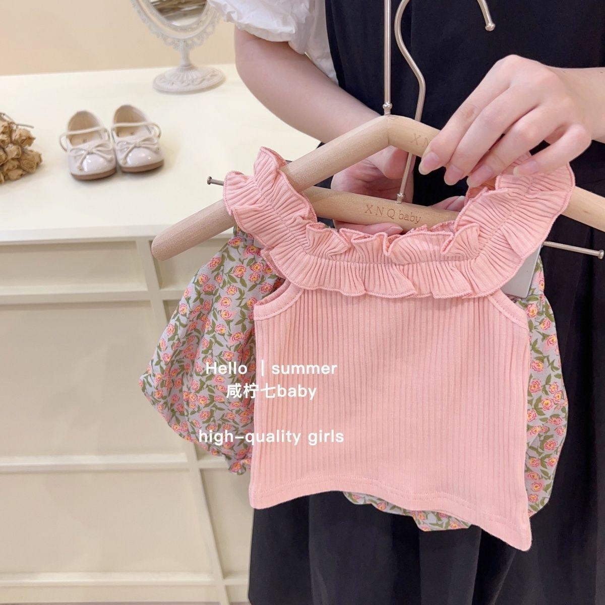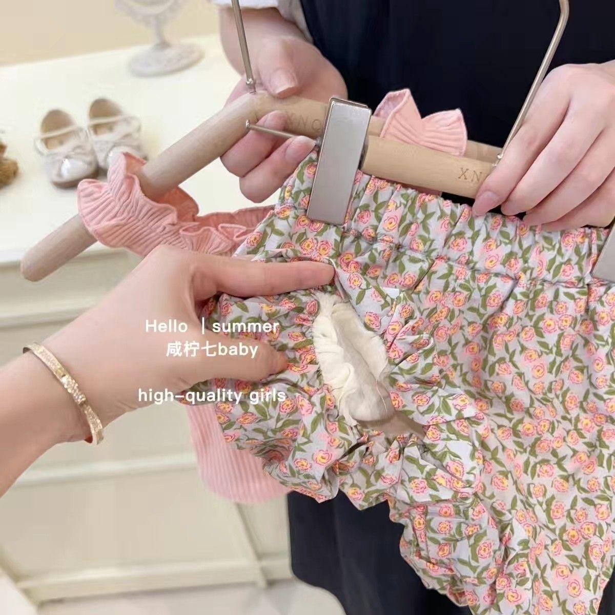 Traje de verano para niñas, elegante, personalizado, de marca de moda, estilo coreano, chaleco de encaje dulce, pantalones cortos con capullos de flores
