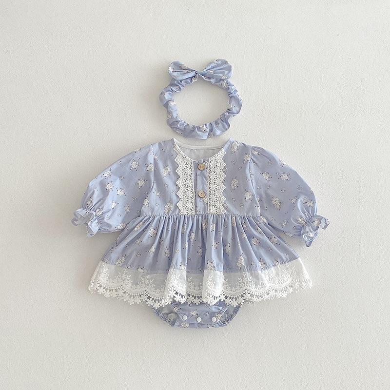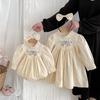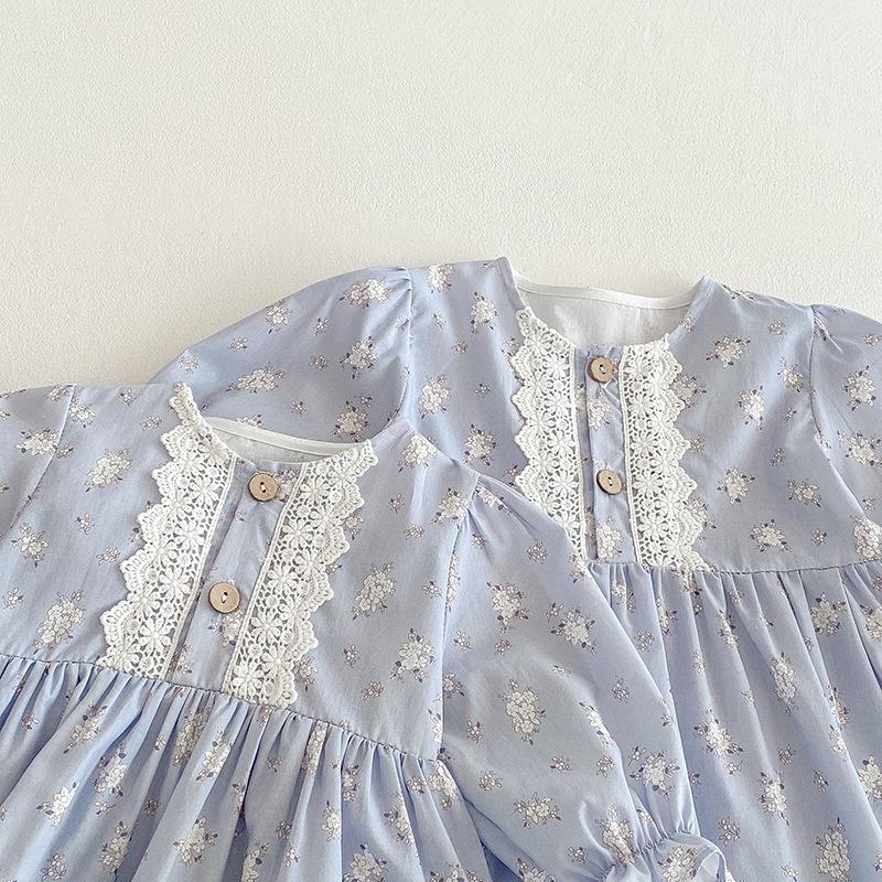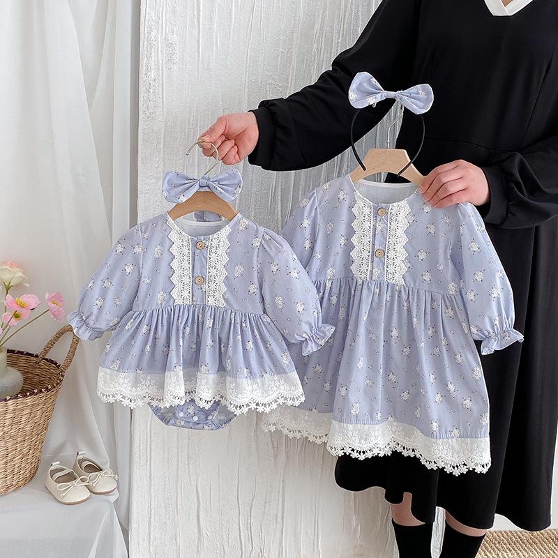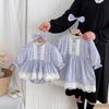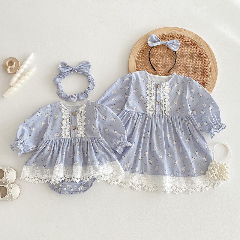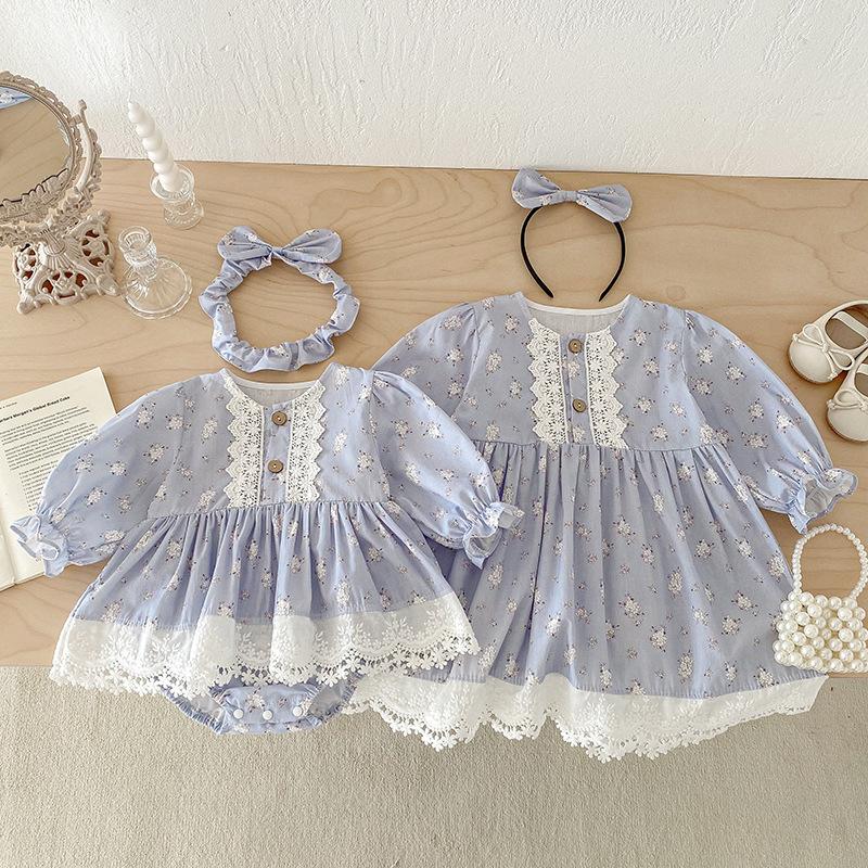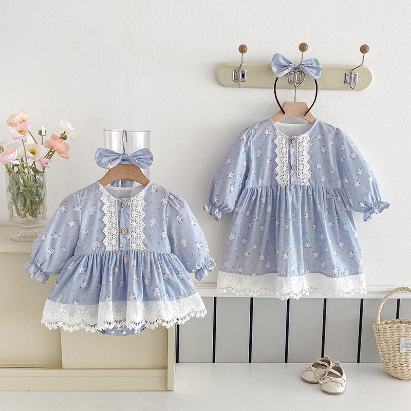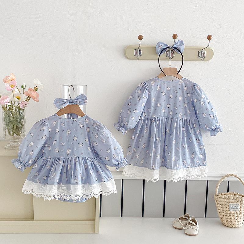 2025 Otoño Nuevo Bebé Niña Manga Larga Mameluco Vestido Azul Conjunto a Juego de Hermanas