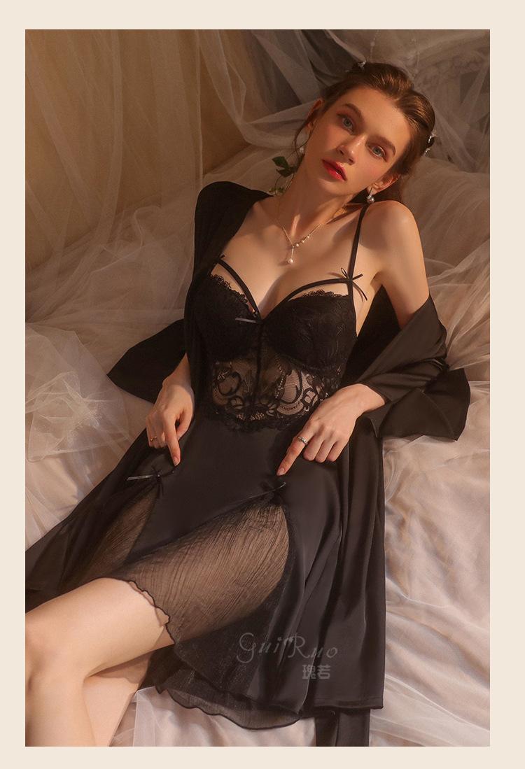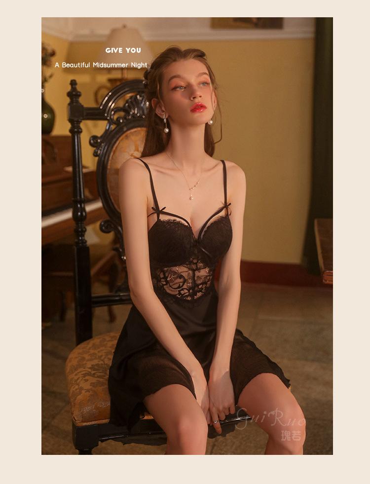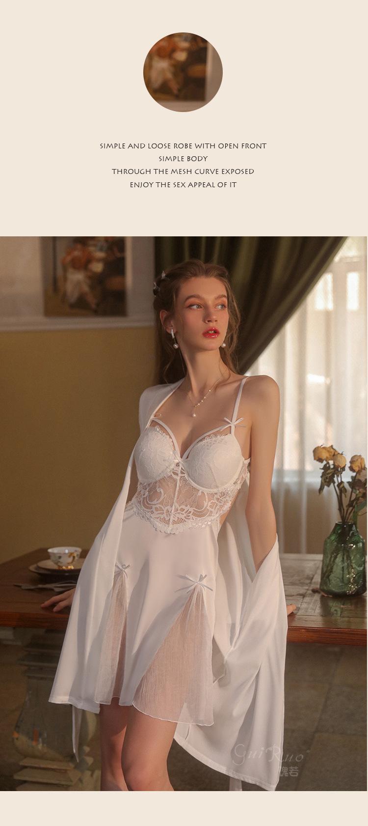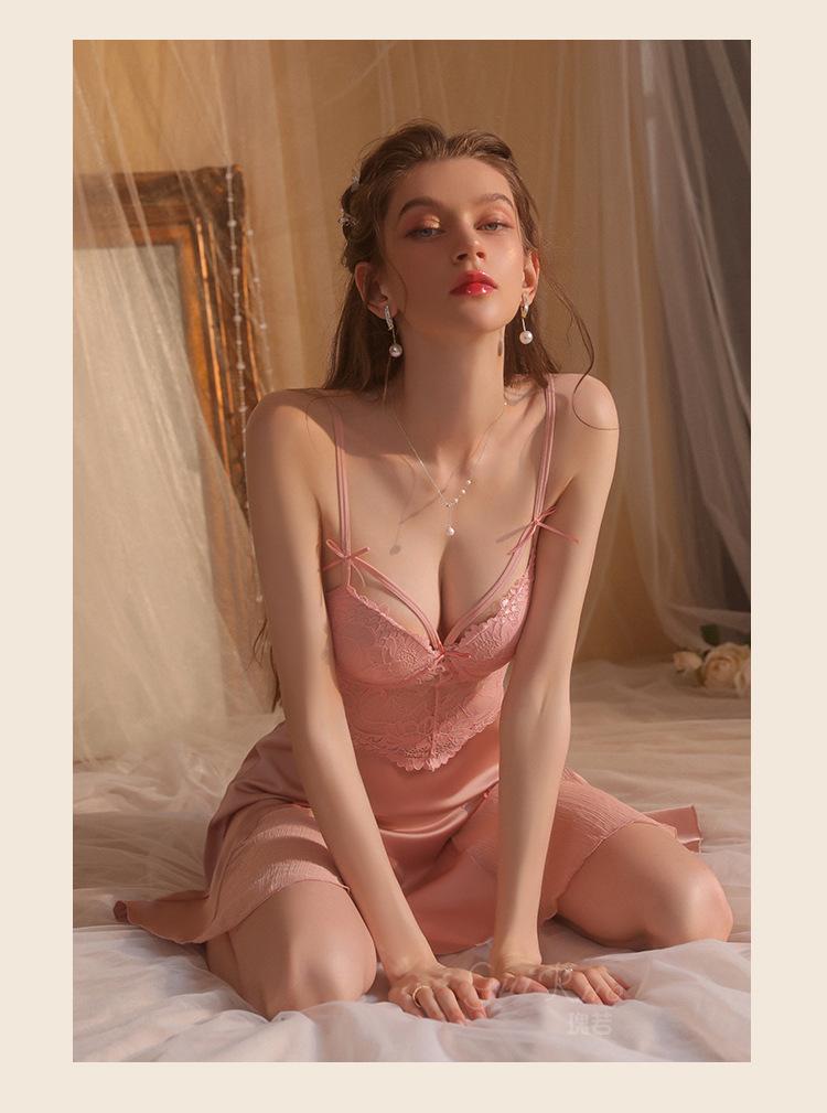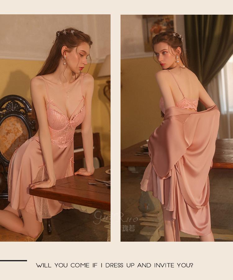 Guiruo Hilo de Satén Hilado y Almohadilla para el Pecho Escote Bajo Tentación Espalda Descubierta Bata de Noche con Tirantes Ropa de Casa para Mujer traje 2668