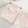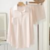 Pijama de Seda de Hielo con Cuello de Camisa Estilo Novio para Mujer Primavera y Verano Delgada Shorts de Encaje Manga Larga Conjunto de Ropa de Casa para Mujer