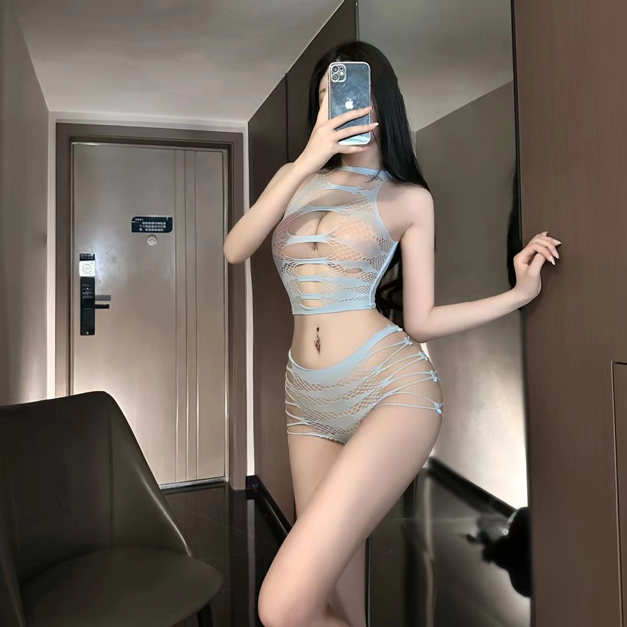 Lencería sexy ahuecada, pijama sexy de encaje, red de pesca, nuevo traje de perspectiva uniforme dividido sin despegar