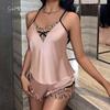 Guiruo - Pantalones cortos de satén con encaje de mariposa y escote en V profundo, con almohadillas en el pecho y tirantes, con solapa, para el hogar, 4097