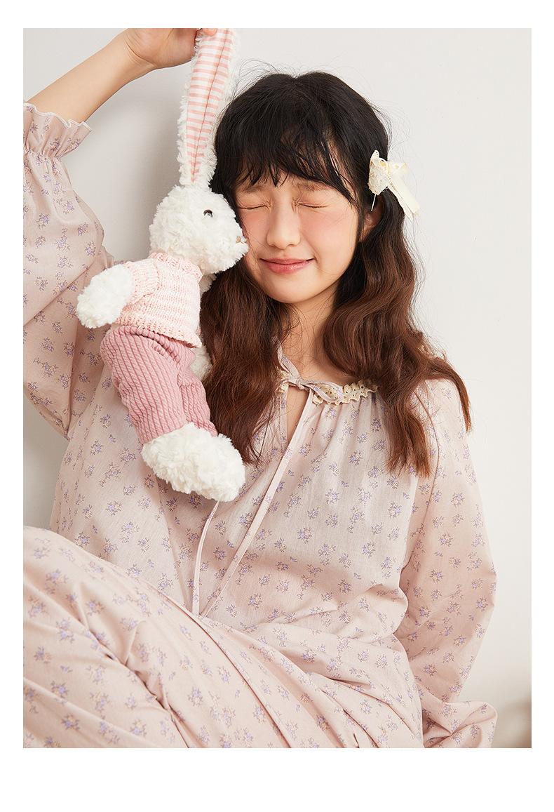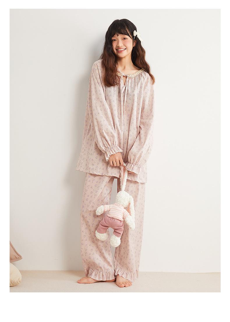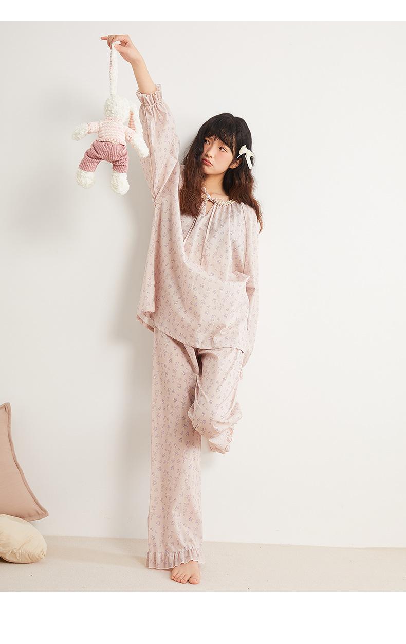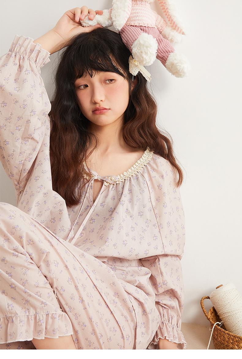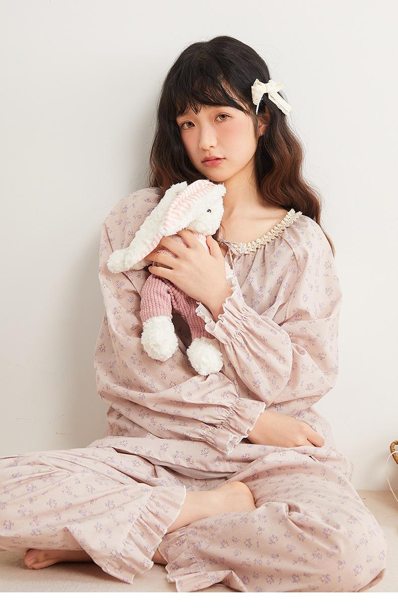 Jiangnan Wo 25 Nuevos pijamas de primavera para mujer, jersey de algodón con cordones, ropa de hogar con estampado floral morado, traje de alta gama